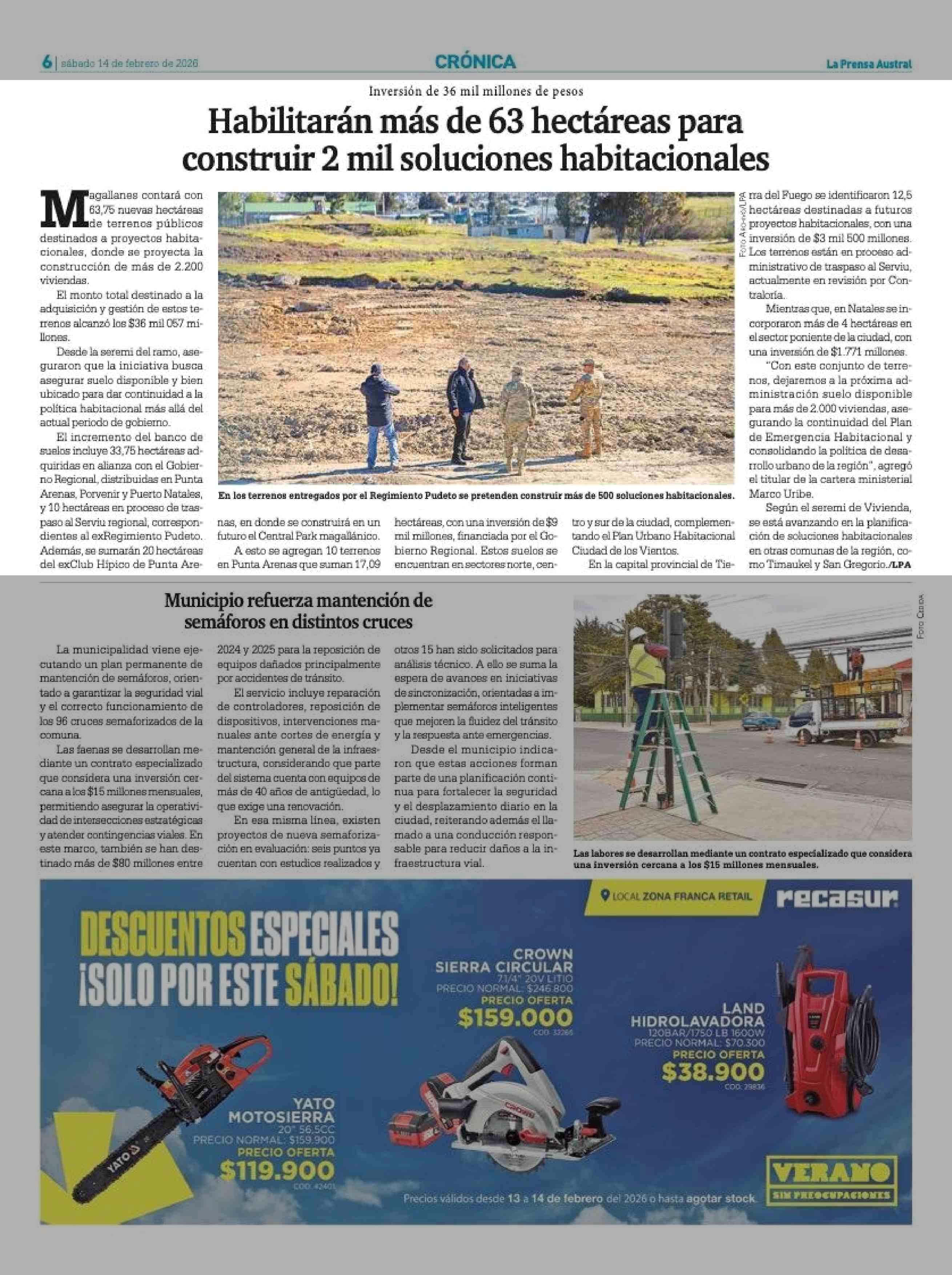 Habilitarán más de 63 hectáreas para construir 2 mil soluciones habitacionales 14-02-2026 La Prensa Austral |