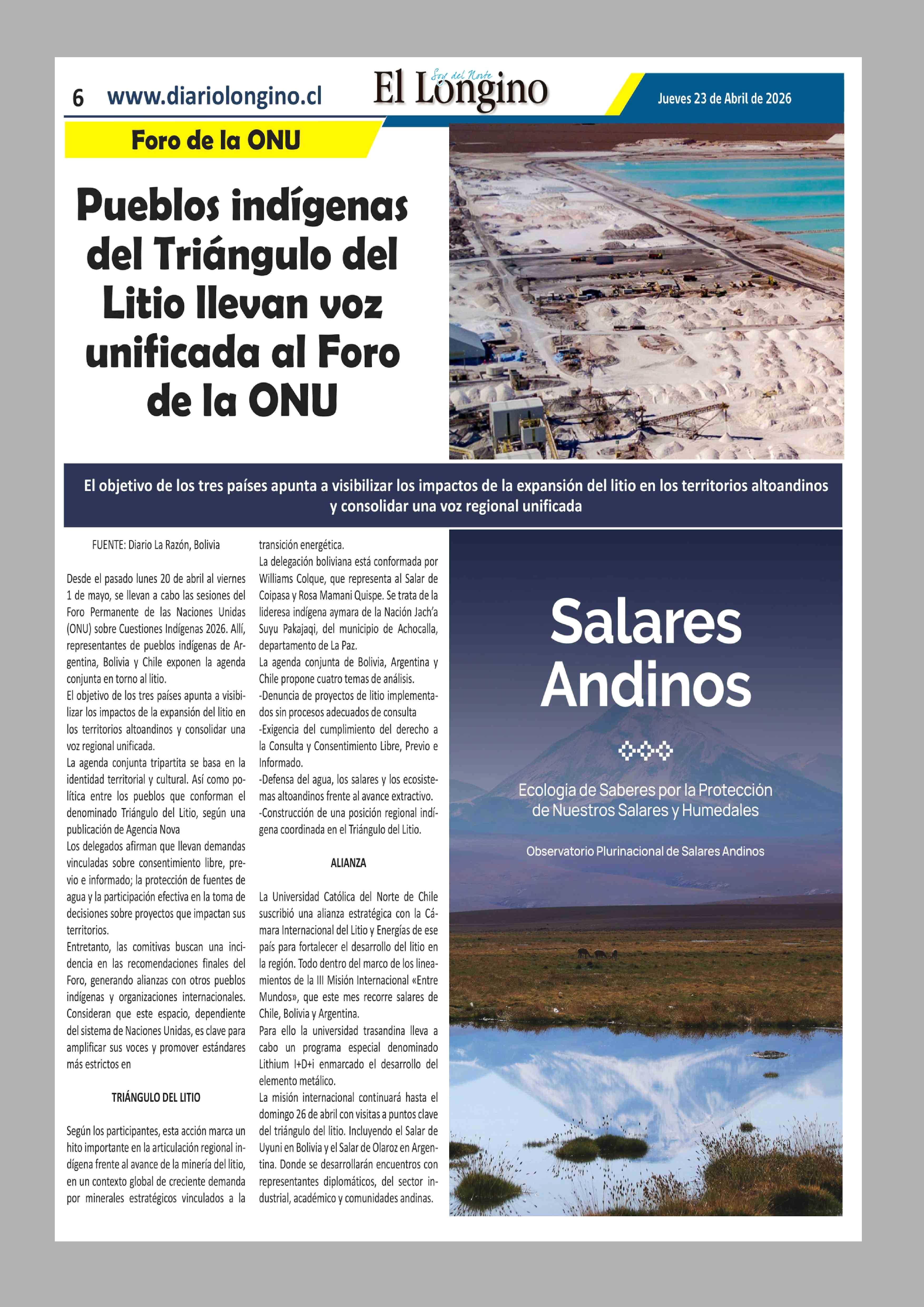 Pueblos indígenas del Triángulo del Litio llevan voz unificada al Foro de la ONU 23-04-2026 El Longino |
