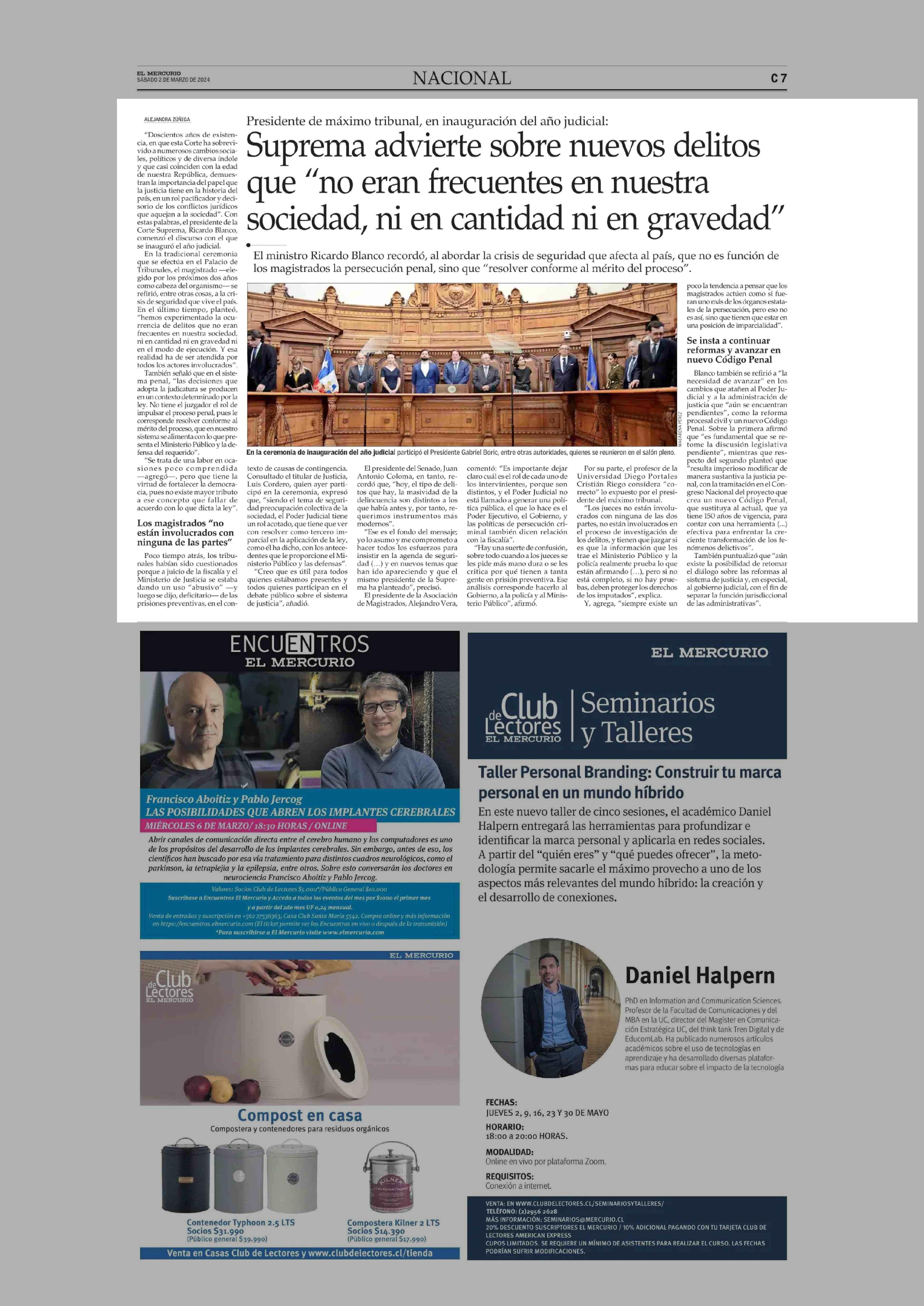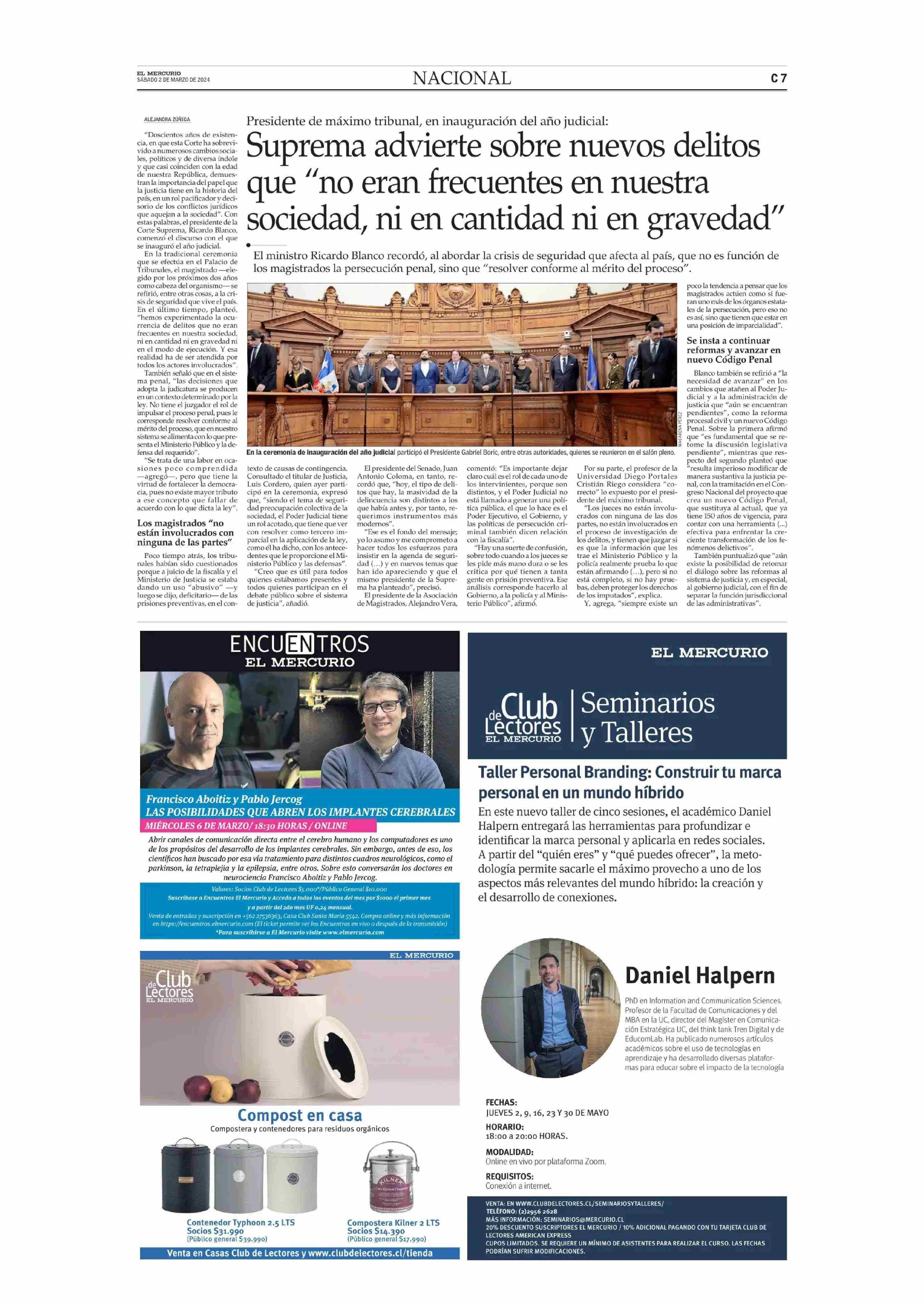 Suprema advierte sobre nuevos delitos que “no eran frecuentes en nuestra sociedad, ni en cantidad ni en gravedad” 02-03-2024 El Mercurio Segunda Edición (C) - Chile |