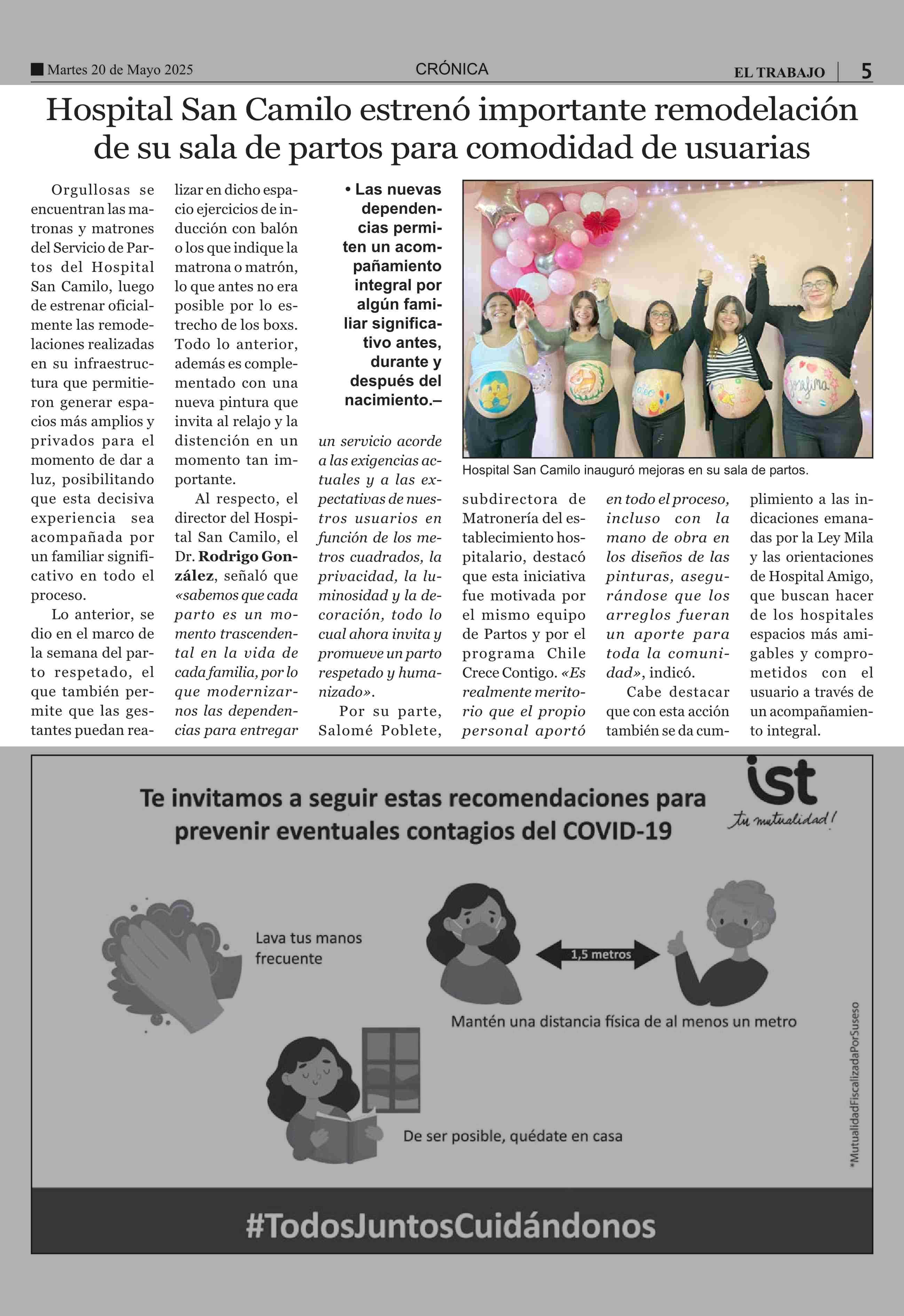 Hospital San Camilo estrenó importante remodelación de su sala de partos para comodidad de usuarias 20-05-2025 El Trabajo |