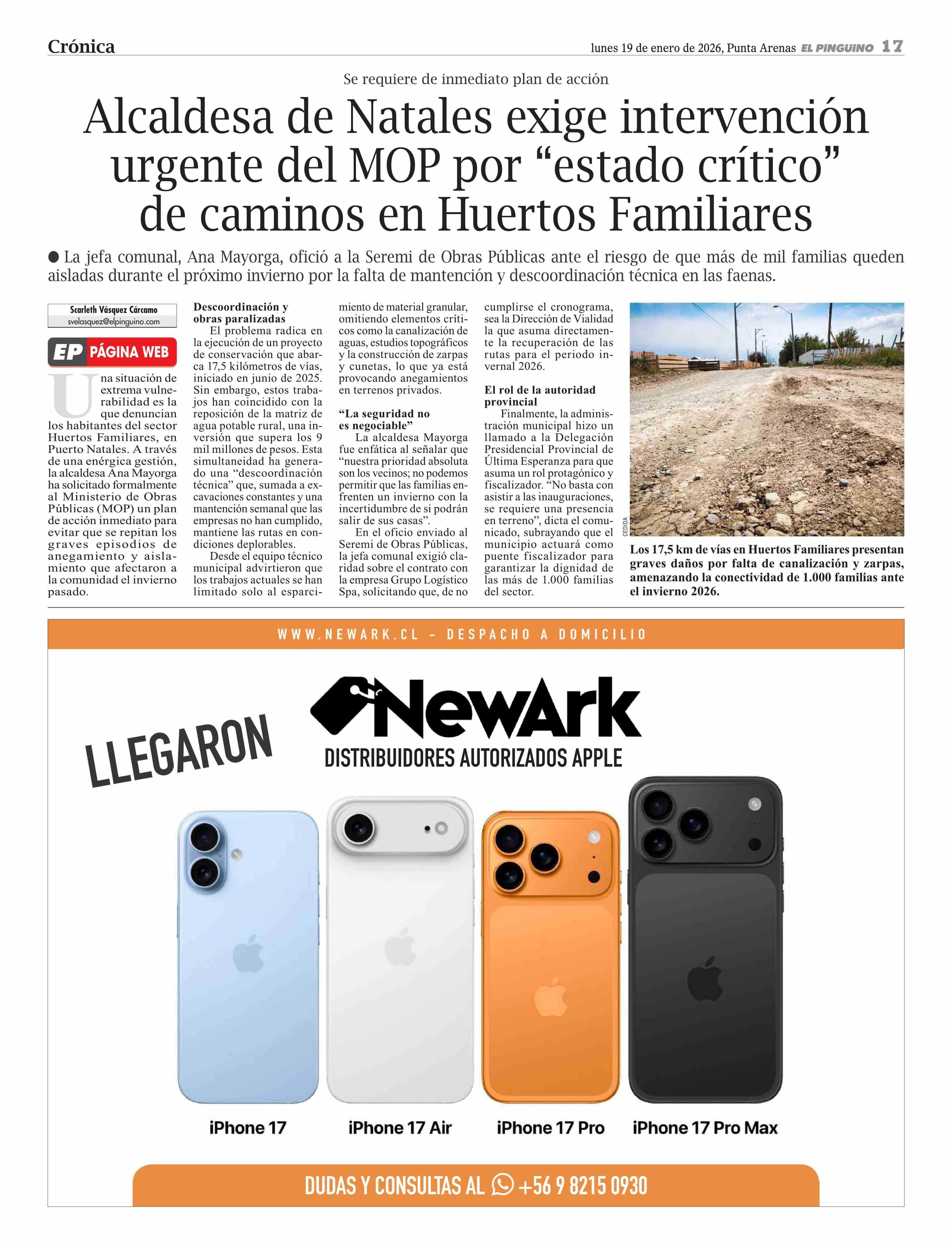 Alcaldesa de Natales exige intervención urgente del MOP por "estado crítico" de caminos en Huertos Familiares 19-01-2026 El Pingüino |