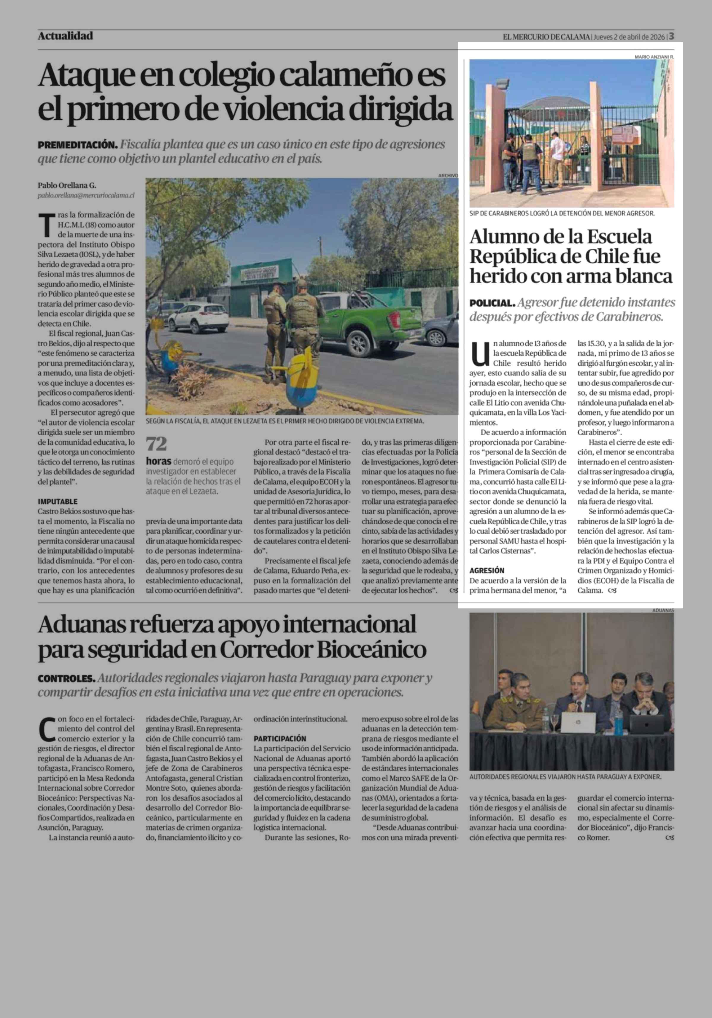 Alumno de la Escuela República de Chile fue herido con arma blanca 02-04-2026 El Mercurio de Calama |