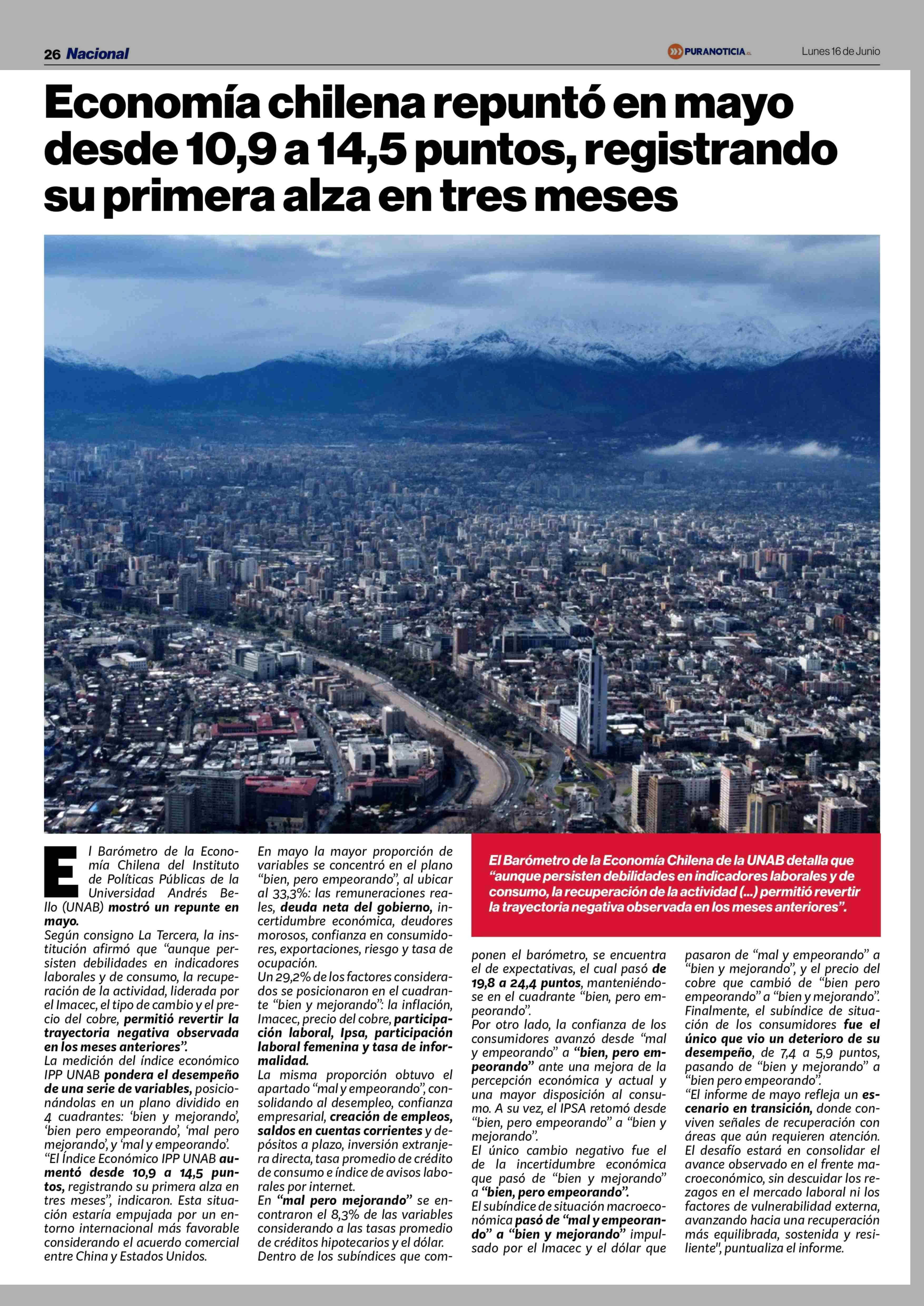 Título: Economía chilena repuntó en mayo desde 10,9 a 14,5 puntos, registrando su primera alza en tres meses