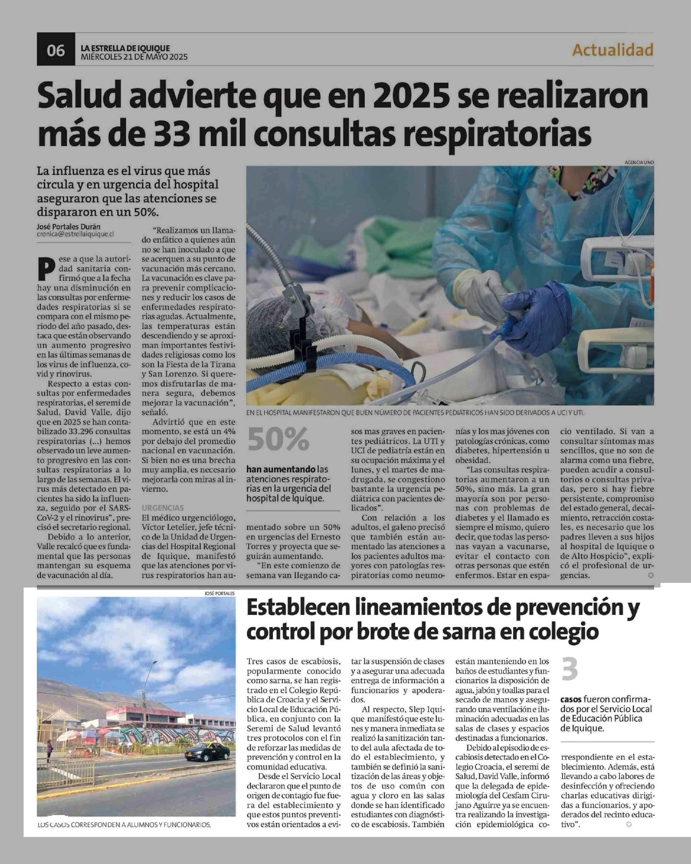 Establecen lineamientos de prevención y control por brote de sarna en colegio 21-05-2025 La Estrella de Iquique |