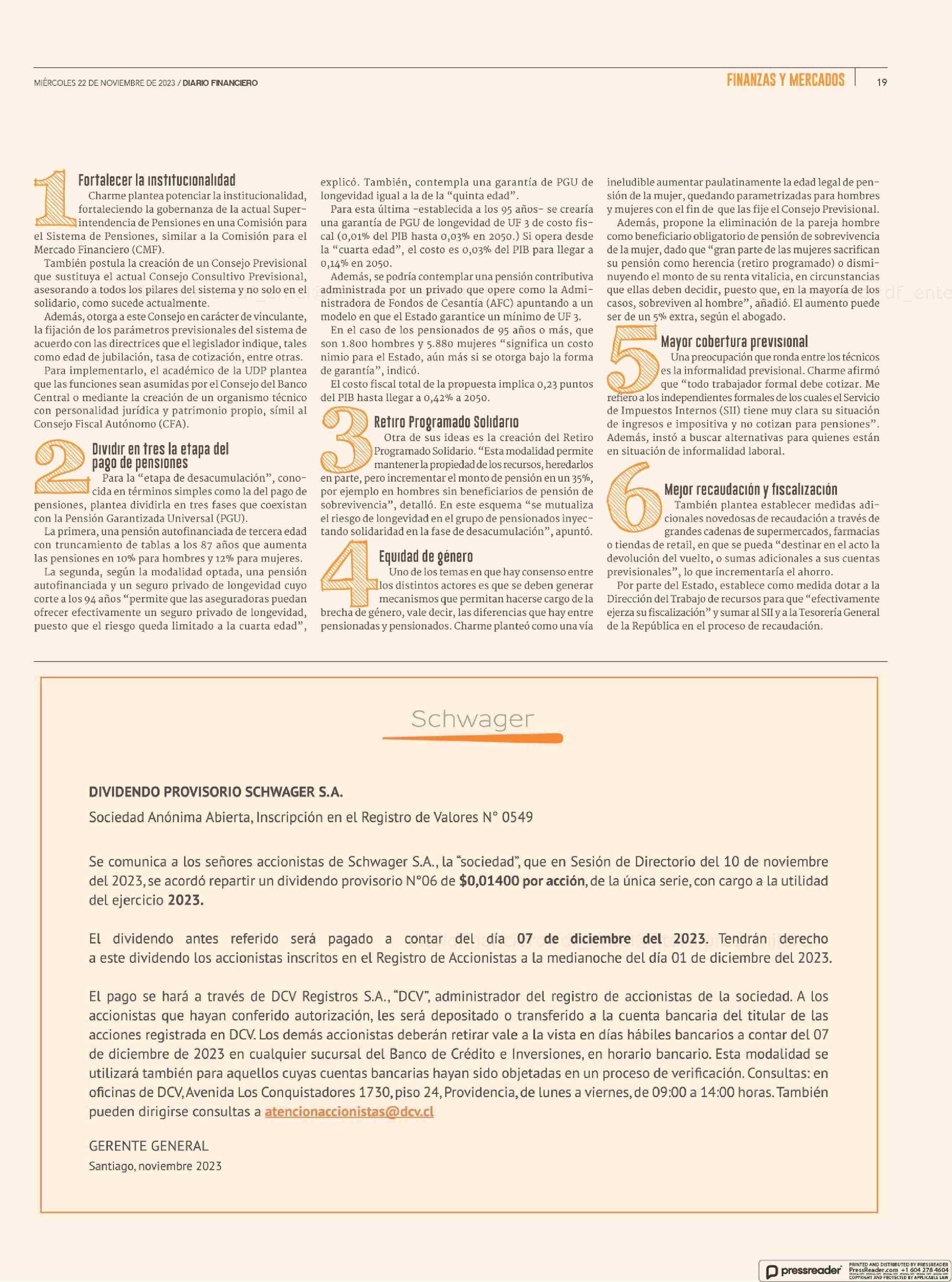 Las seis propuestas que presentará experto en pensiones de Chile Vamos para destrabar la reforma previsional 22-11-2023 Diario Financiero |