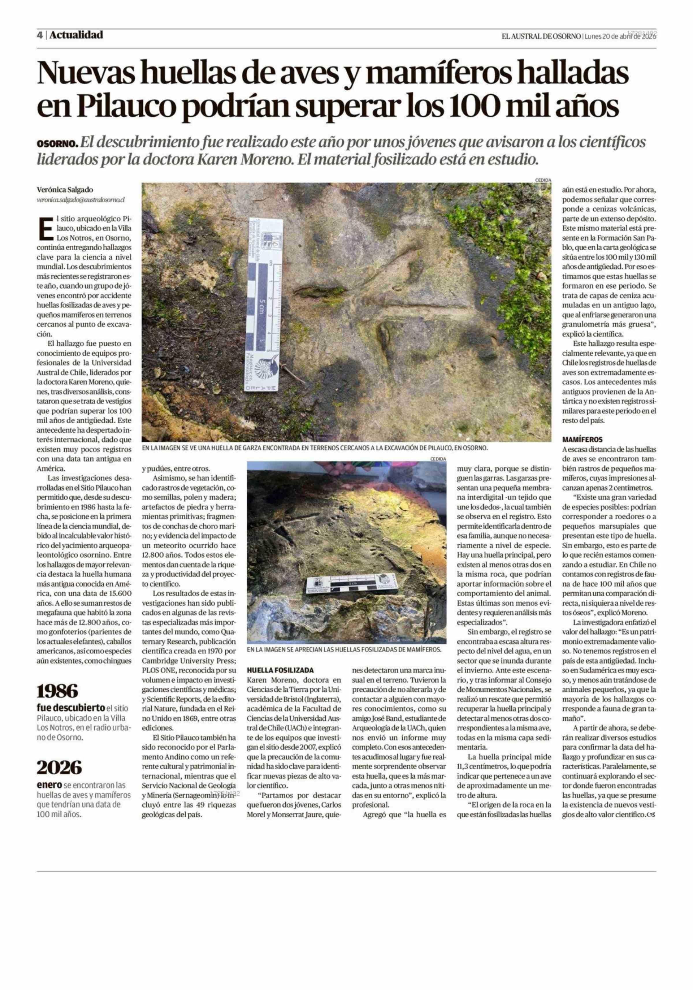Nuevas huellas de aves y mamíferos halladas en Pilauco podrían superar los 100 mil años 20-04-2026 El Austral de Osorno |