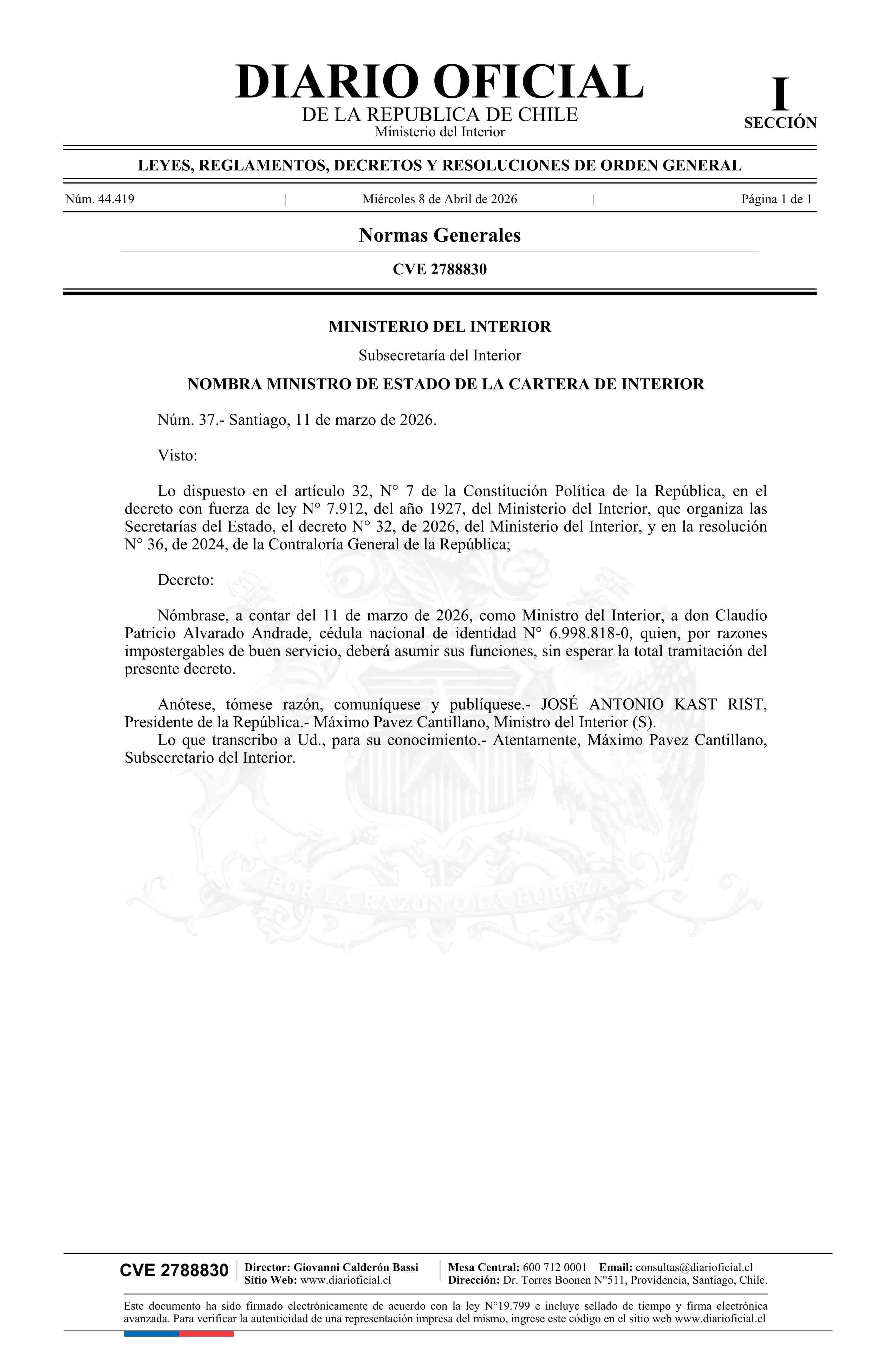Decreto número 37, de 2026.- Nombra a don Claudio Patricio Alvarado Andrade como Ministro de Estado de la Cartera de Interior 08-04-2026 Diario Oficial Edición Electrónica |