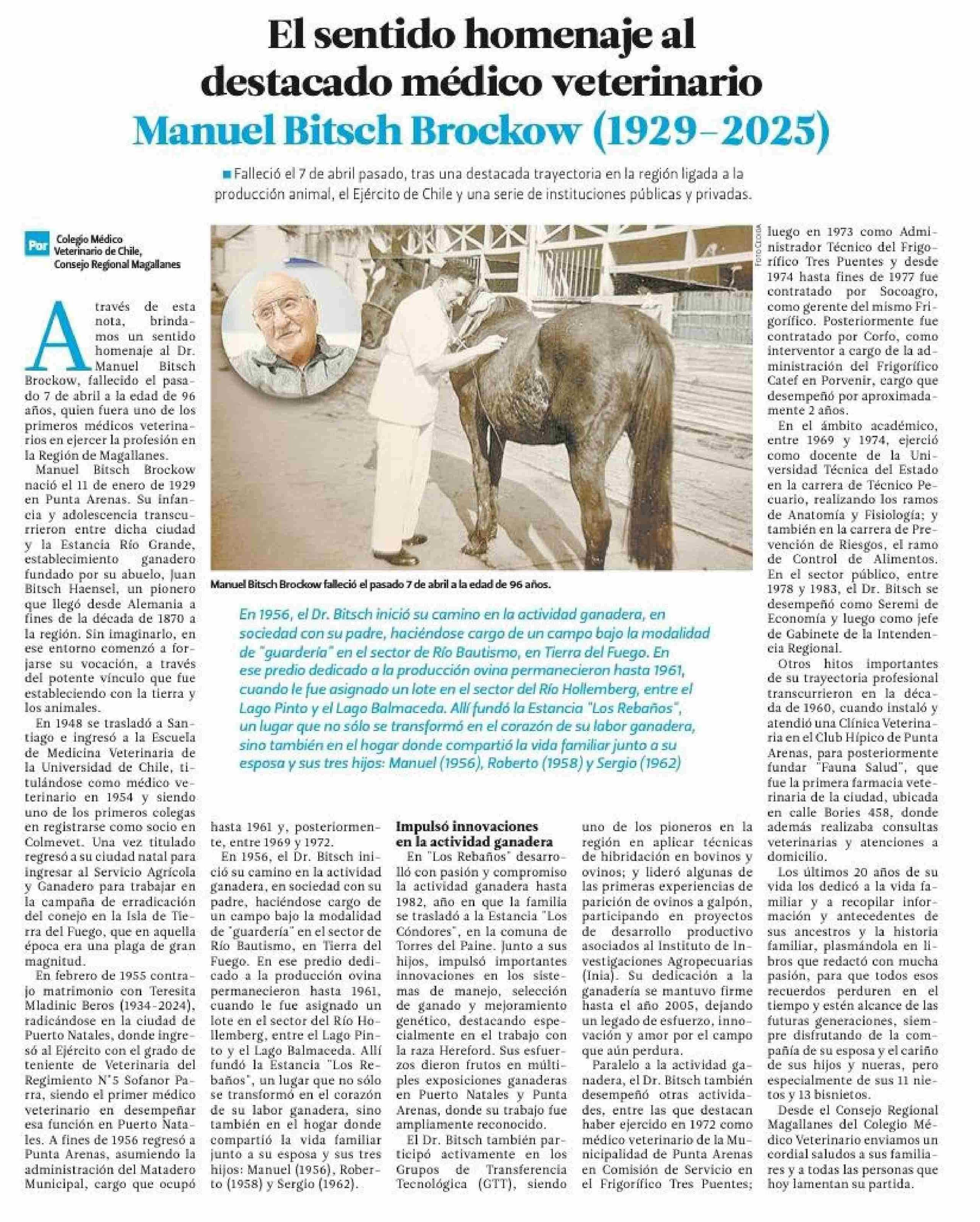 El sentido homenaje al destacado médico veterinario Manuel Bitsch Brockow (1929-2025) 27-04-2025 El Magallanes |