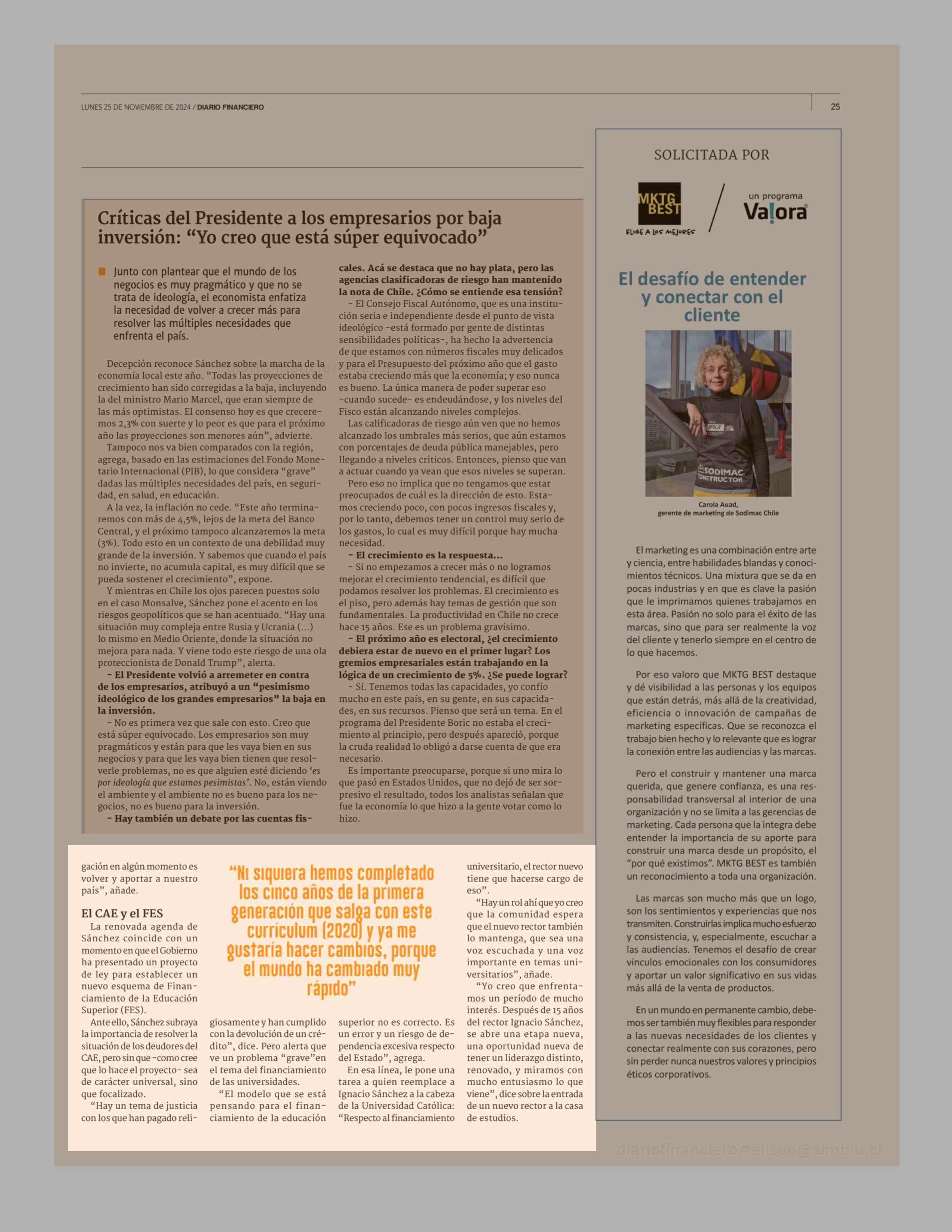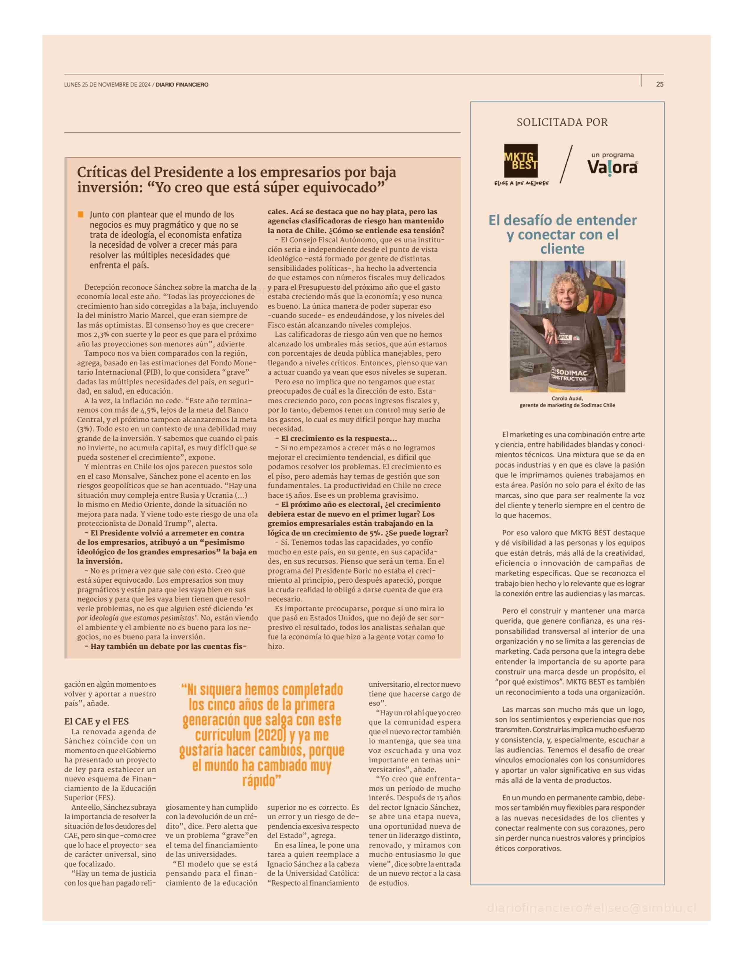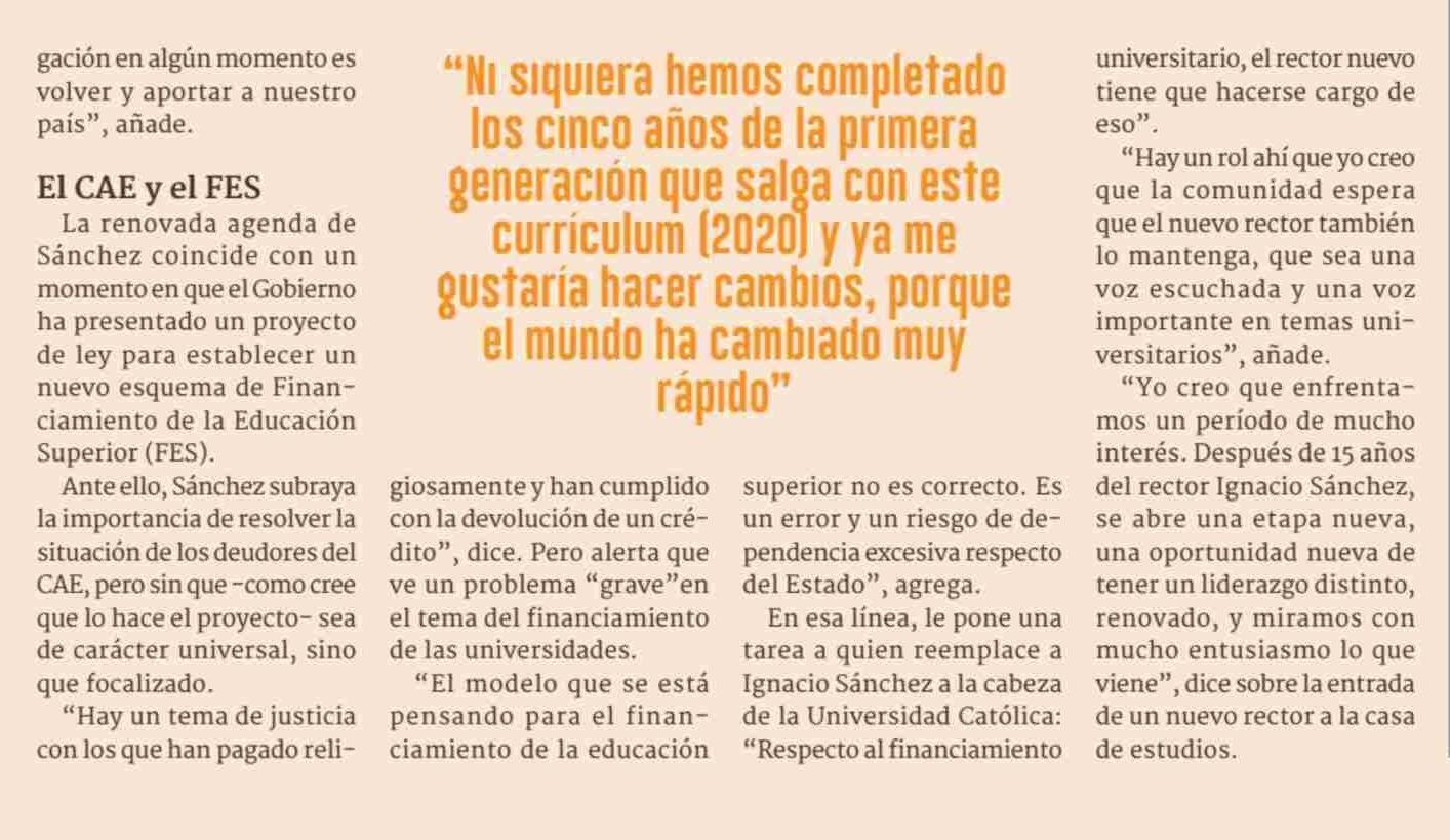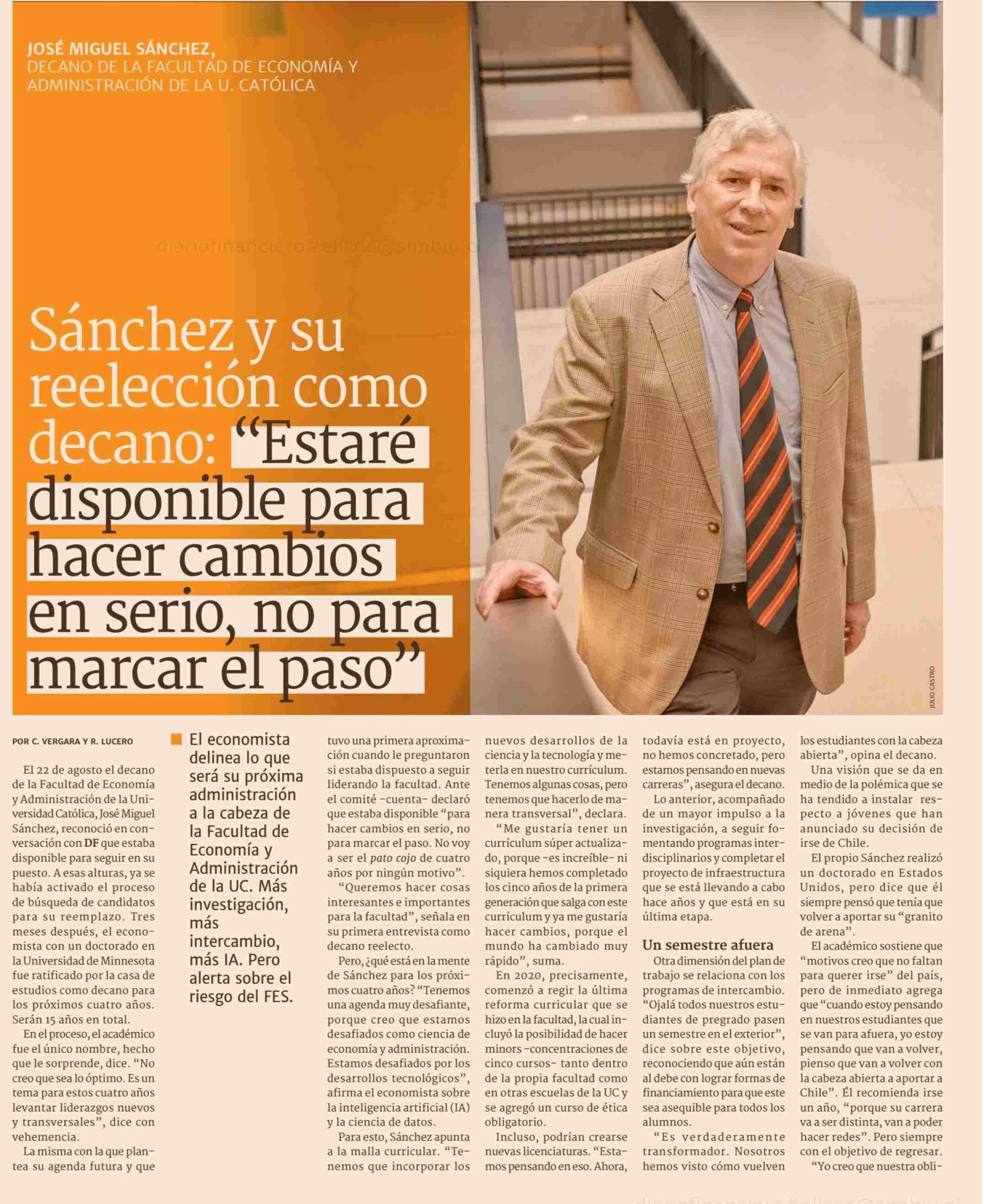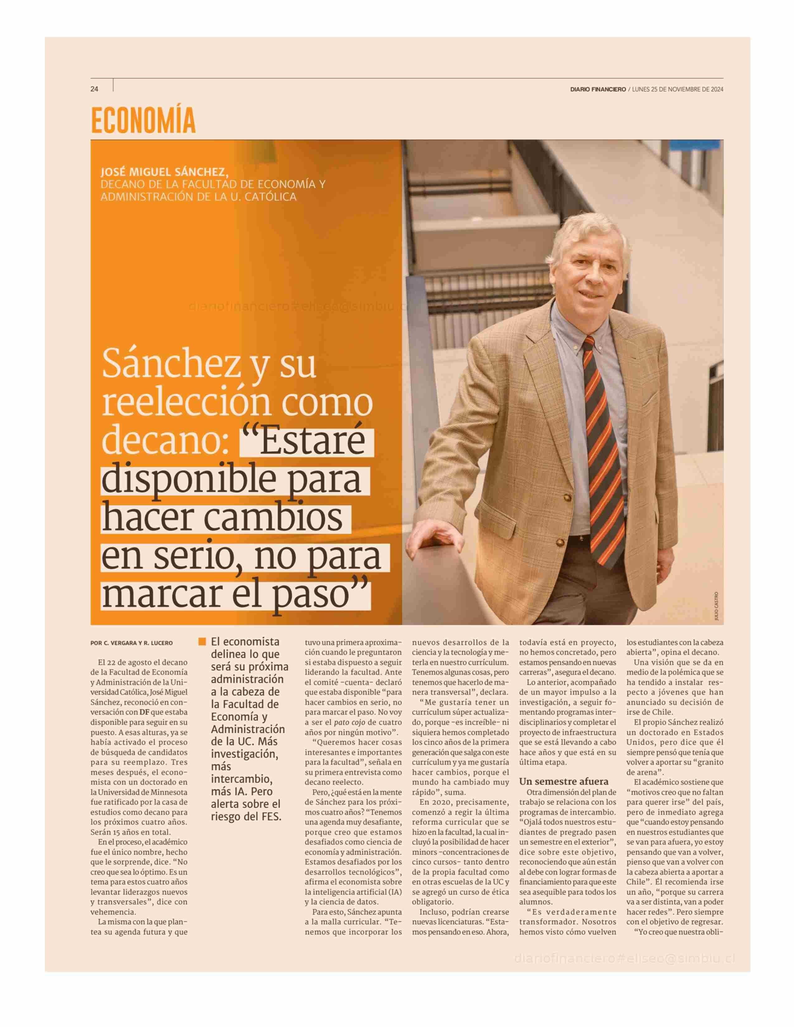 Sánchez y su reelección como decano: "Estaré disponible para hacer cambios en serio , no para marcar el paso" 25-11-2024 Diario Financiero |