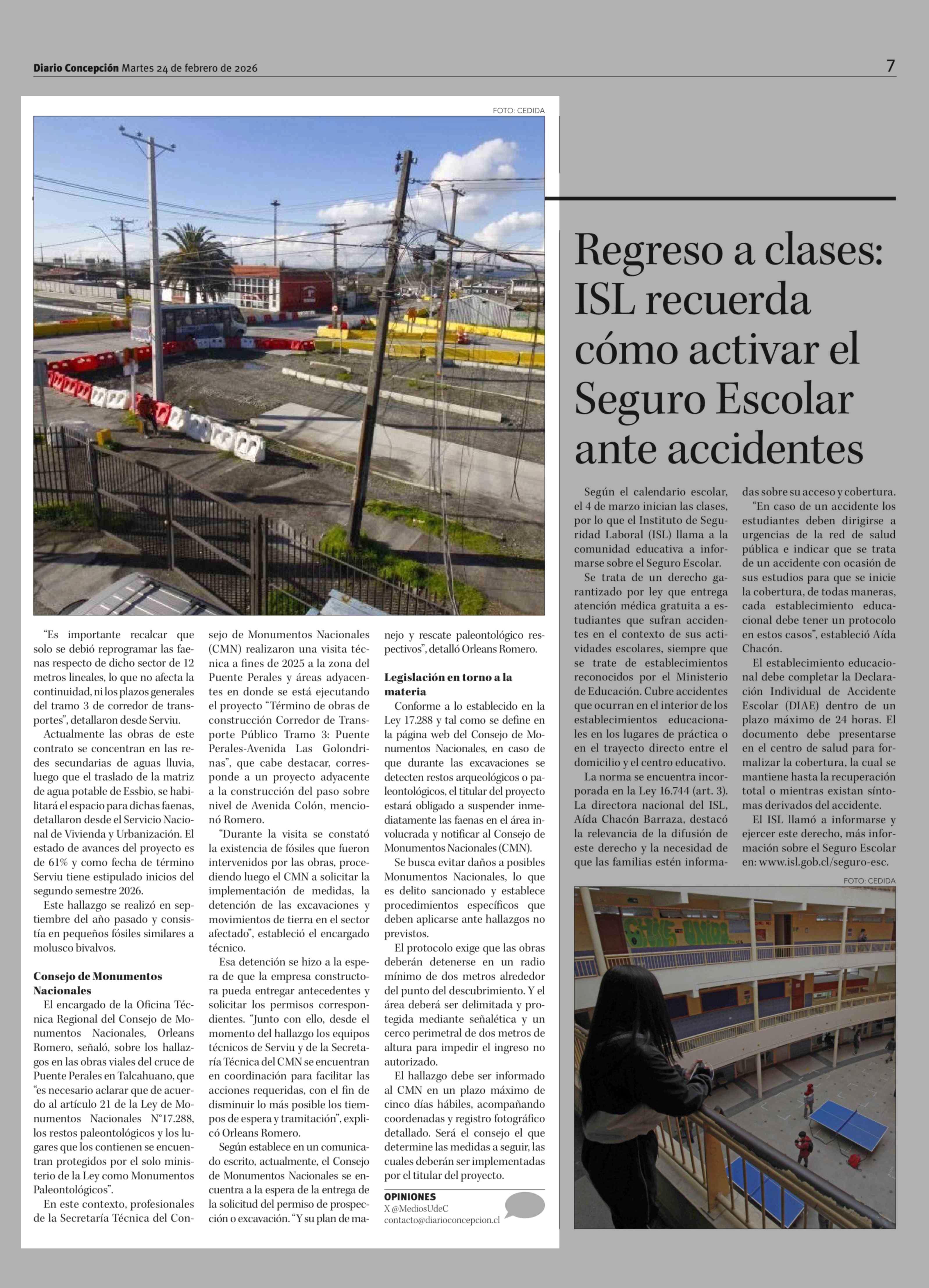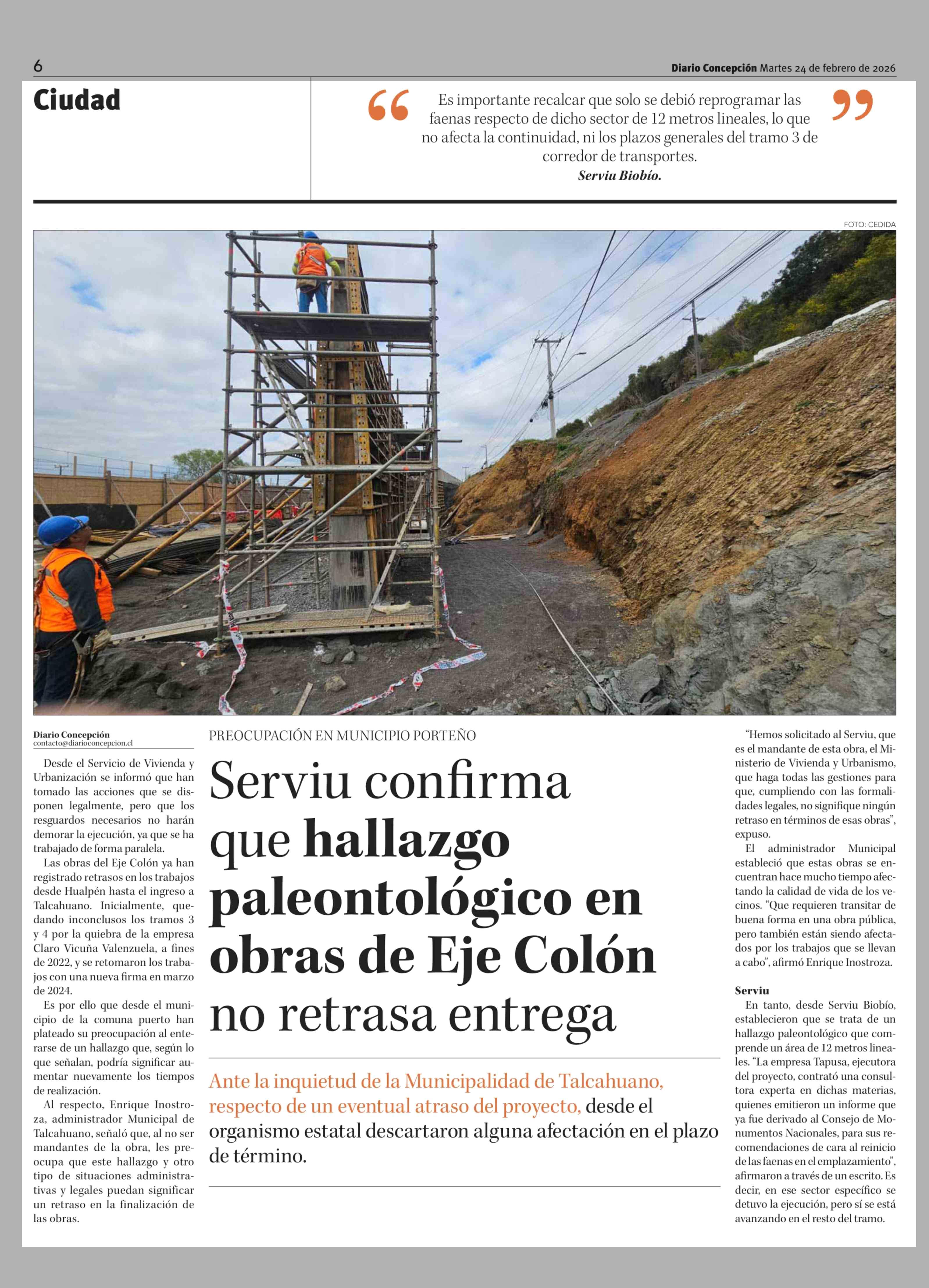 Serviu confirma que hallazgo paleontológico en obras de Eje Colón no retrasa entrega 24-02-2026 Diario Concepción |