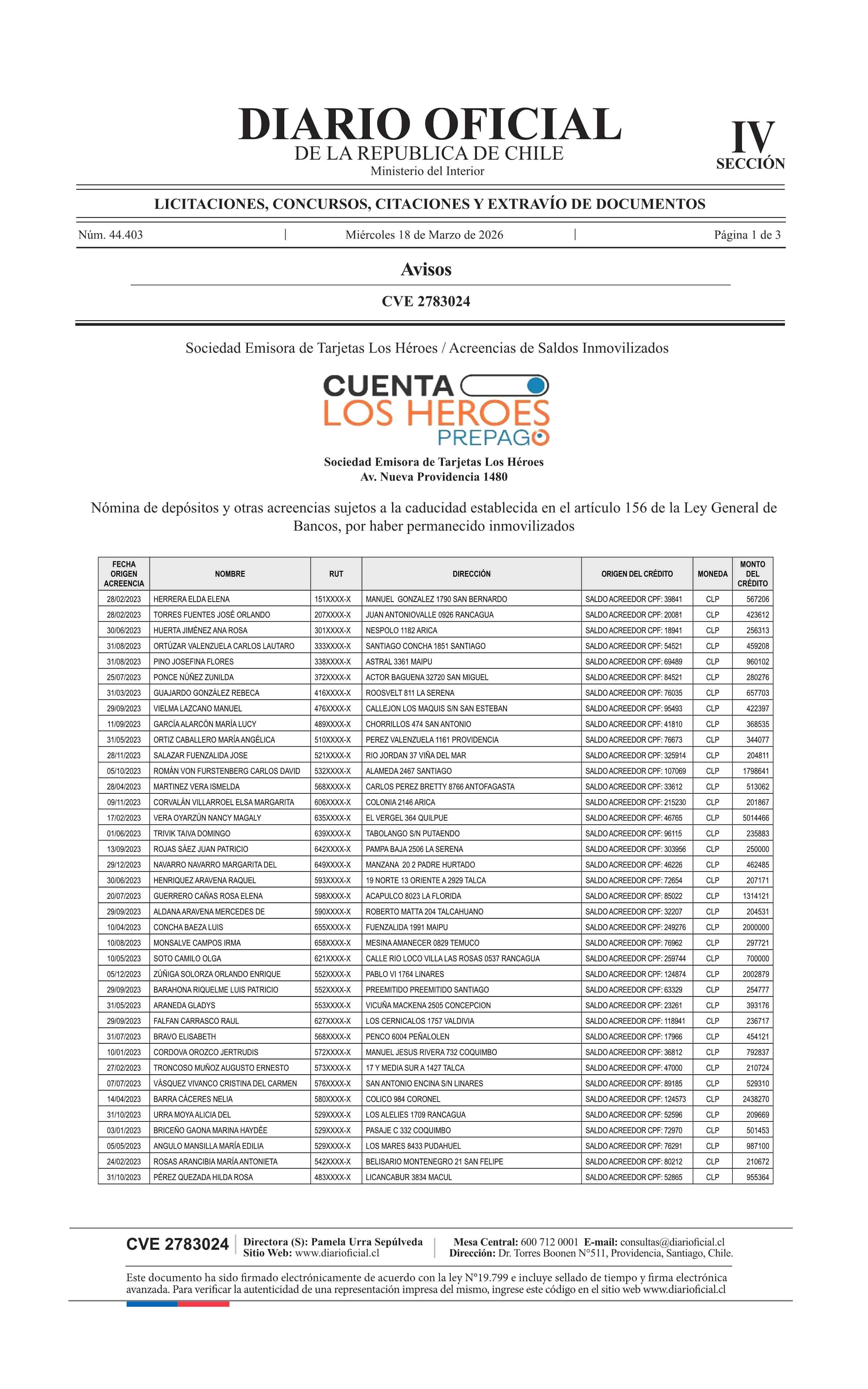 | Título: | AVISO LICITACIONES: SOCIEDAD EMISORES DE TARJETAS PREPAGO LOS HEROES S.A.: Nómina de depósitos y otras acreencias sujetos a la caducidad establecida en el artículo 156 de la Ley General de Bancos, por haber permanecido inmovilizados |