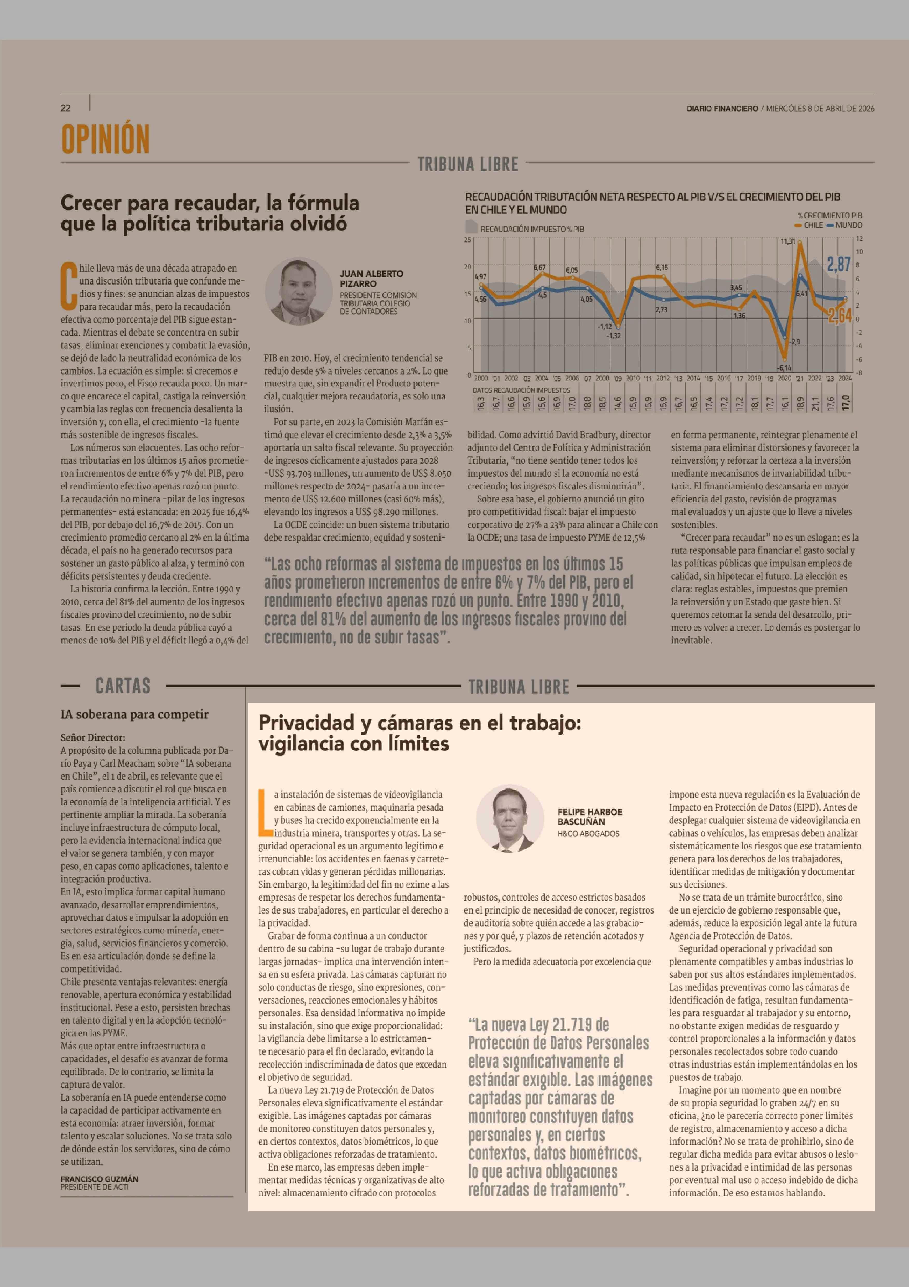 Columnas de Opinión: Privacidad y cámaras en el trabajo: vigilancia con límites 08-04-2026 Diario Financiero |