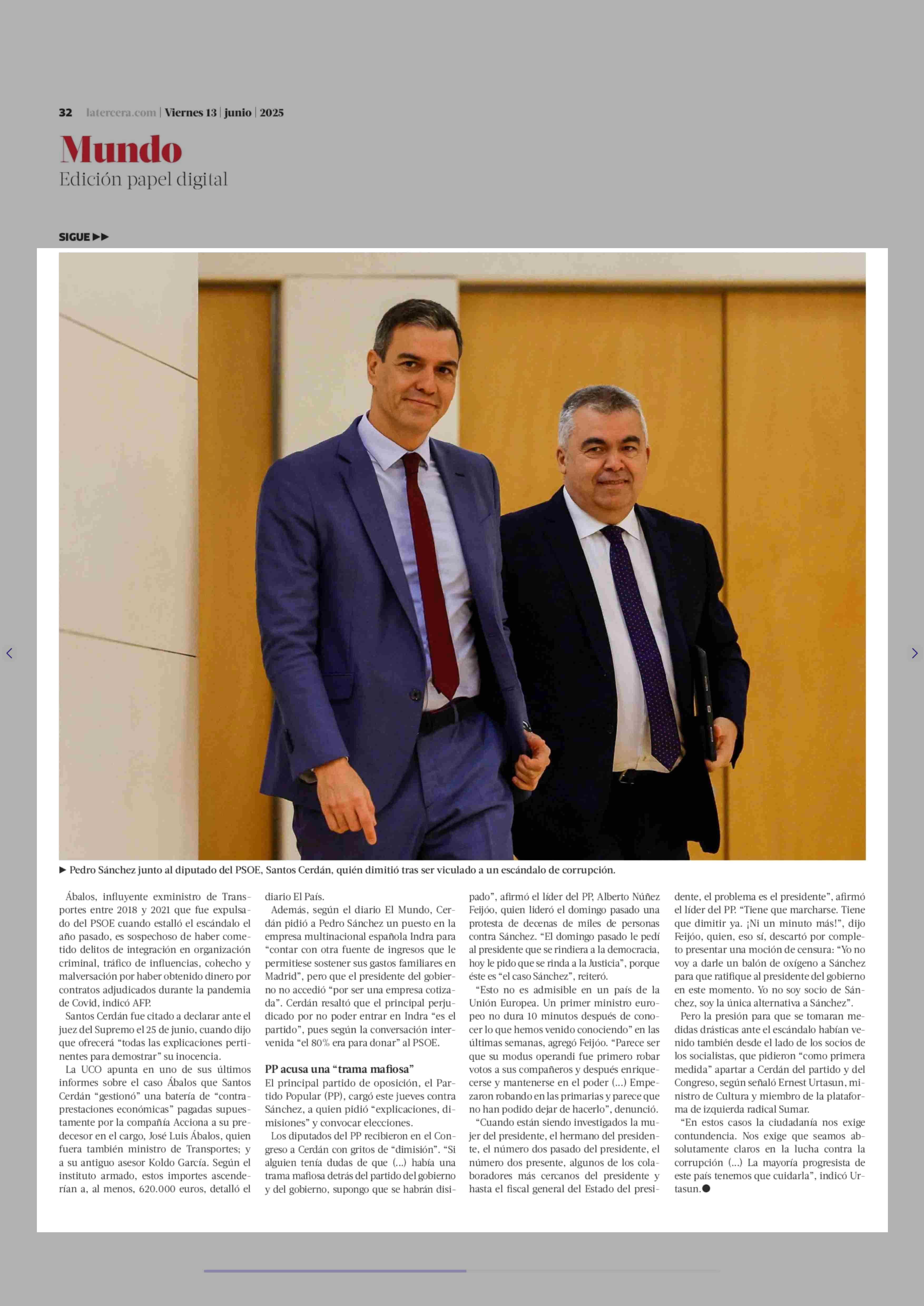 Pedro Sánchez pide “perdón” por caso de presunta corrupción de dirigente socialista, pero descarta elecciones 13-06-2025 La Tercera |