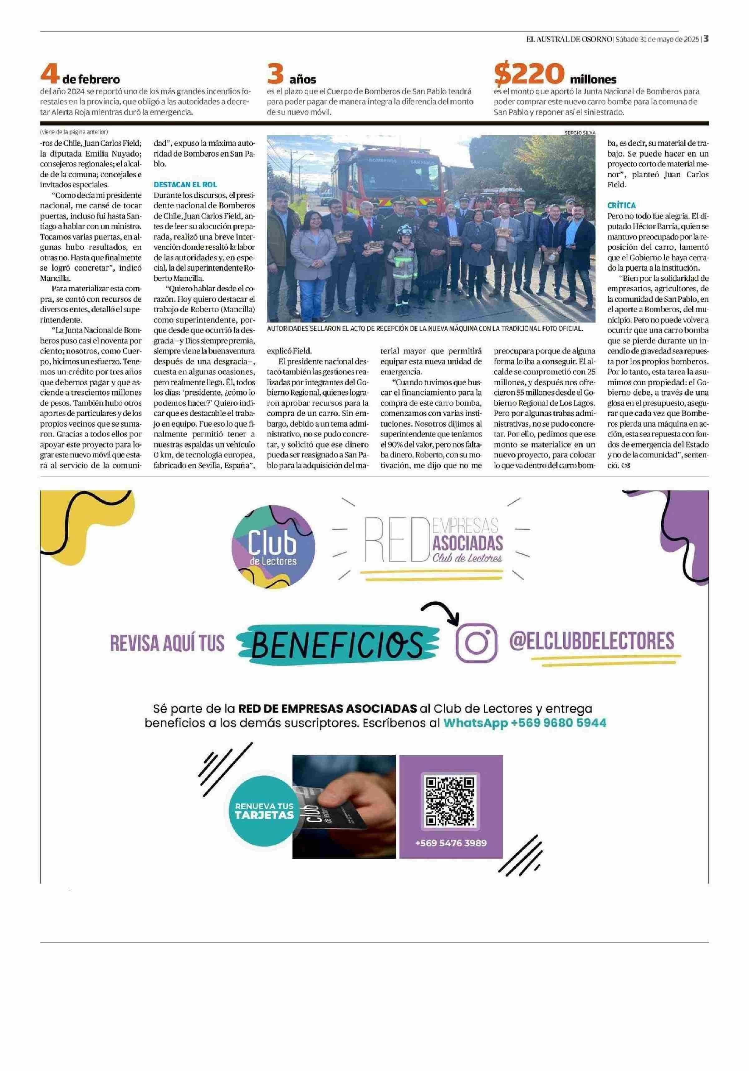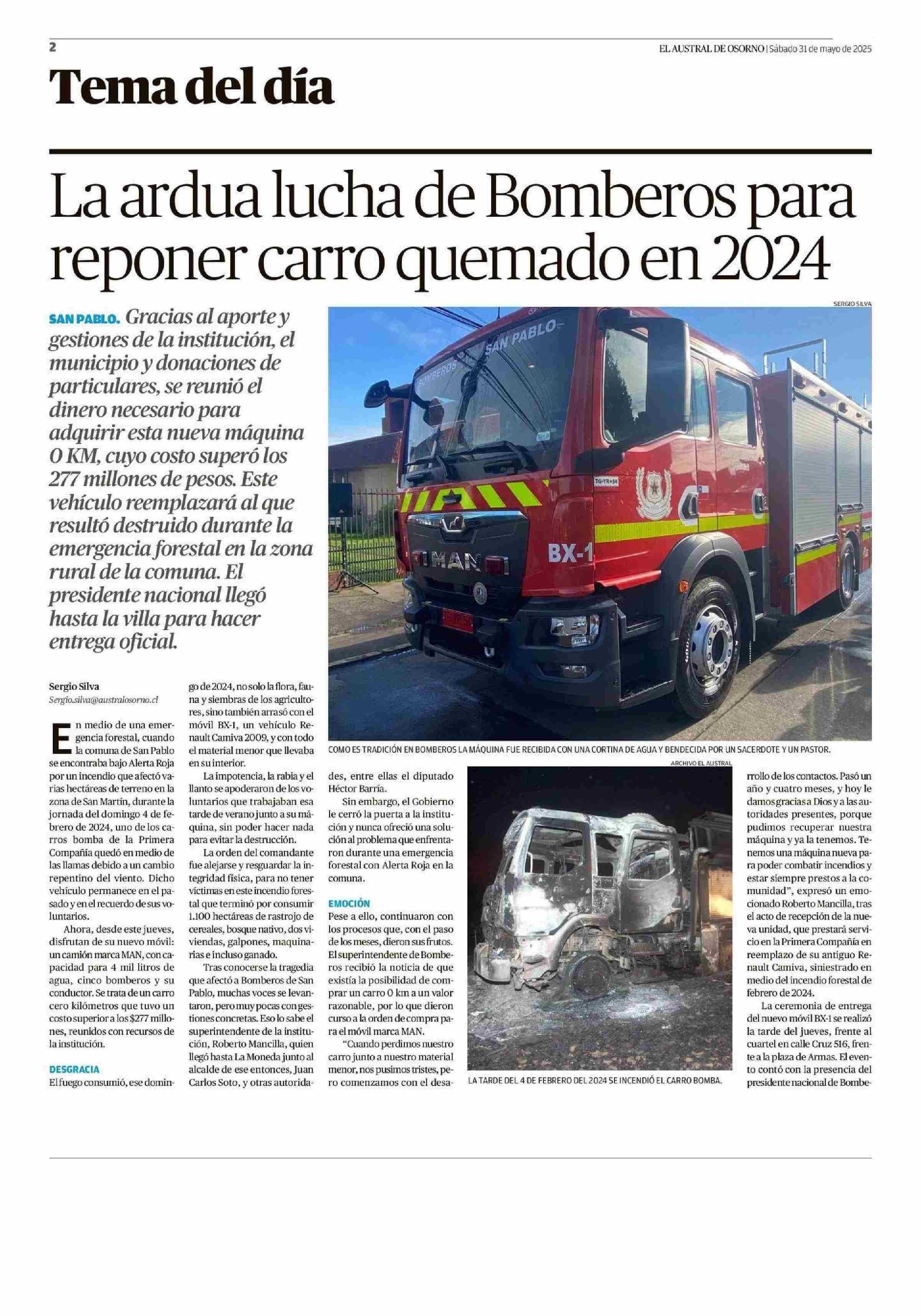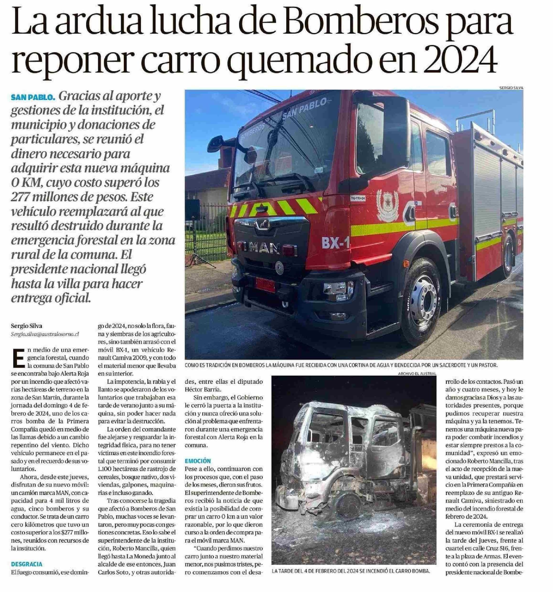 La ardua lucha de Bomberos para reponer carro quemado en 2024 31-05-2025 El Austral de Osorno |