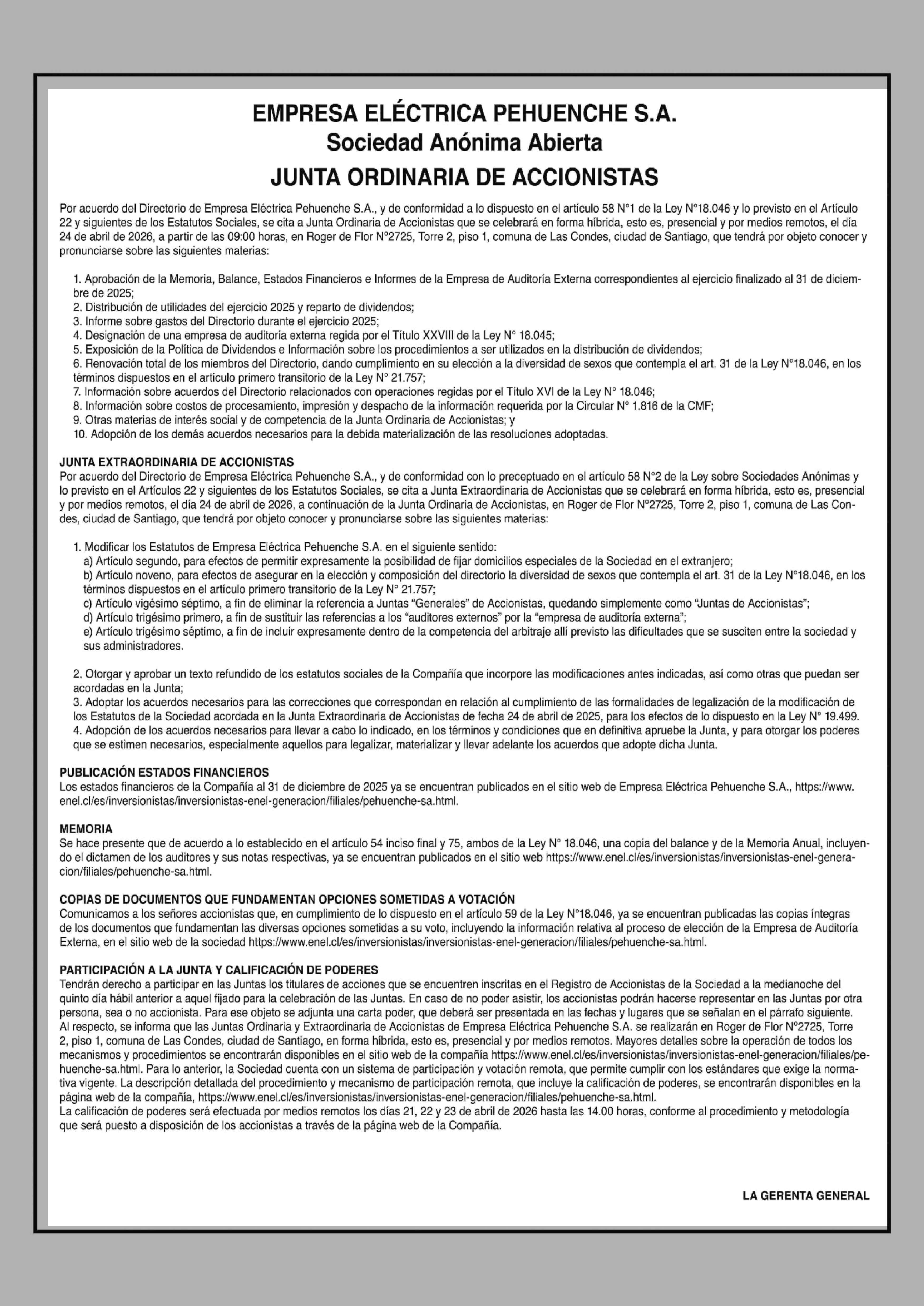 Extractos: EMPRESA ELÉCTRICA PEHUENCHE S.A. 11-04-2026 La Tercera |