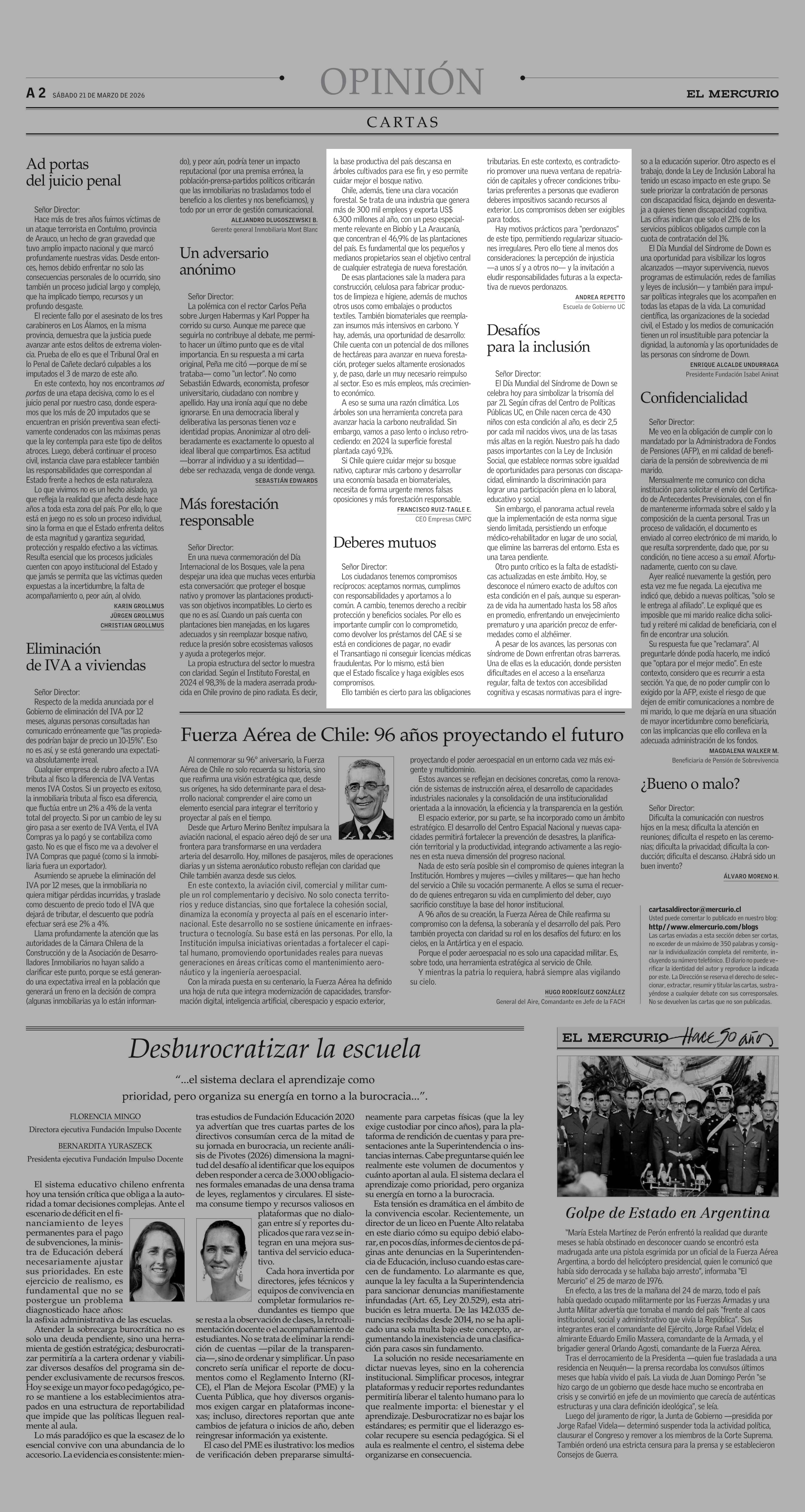 Cartas: Deberes mutuos 21-03-2026 El Mercurio |