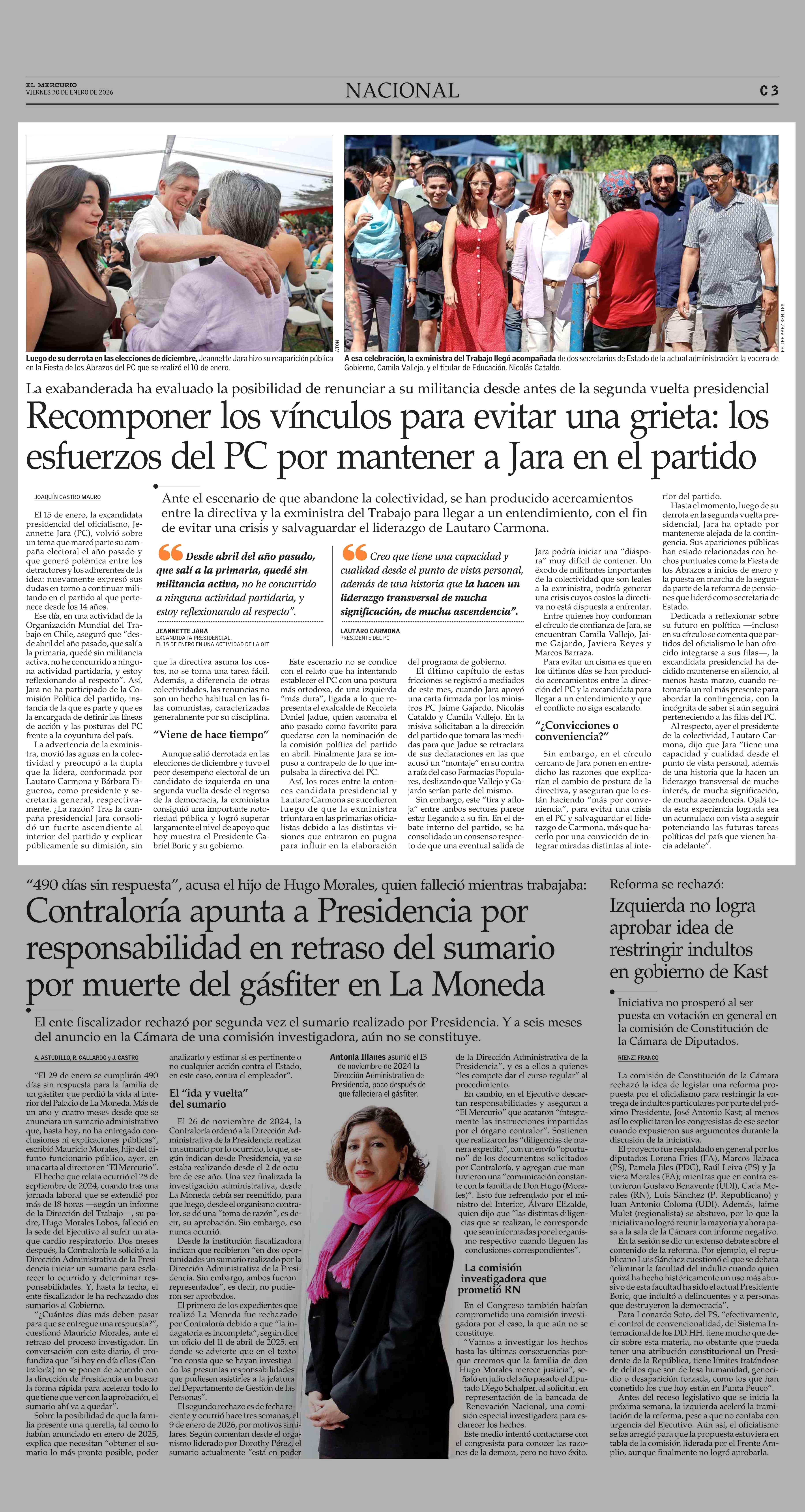 Recomponer los vínculos para evitar una grieta: los esfuerzos del PC por mantener a Jara en el partido 30-01-2026 El Mercurio |