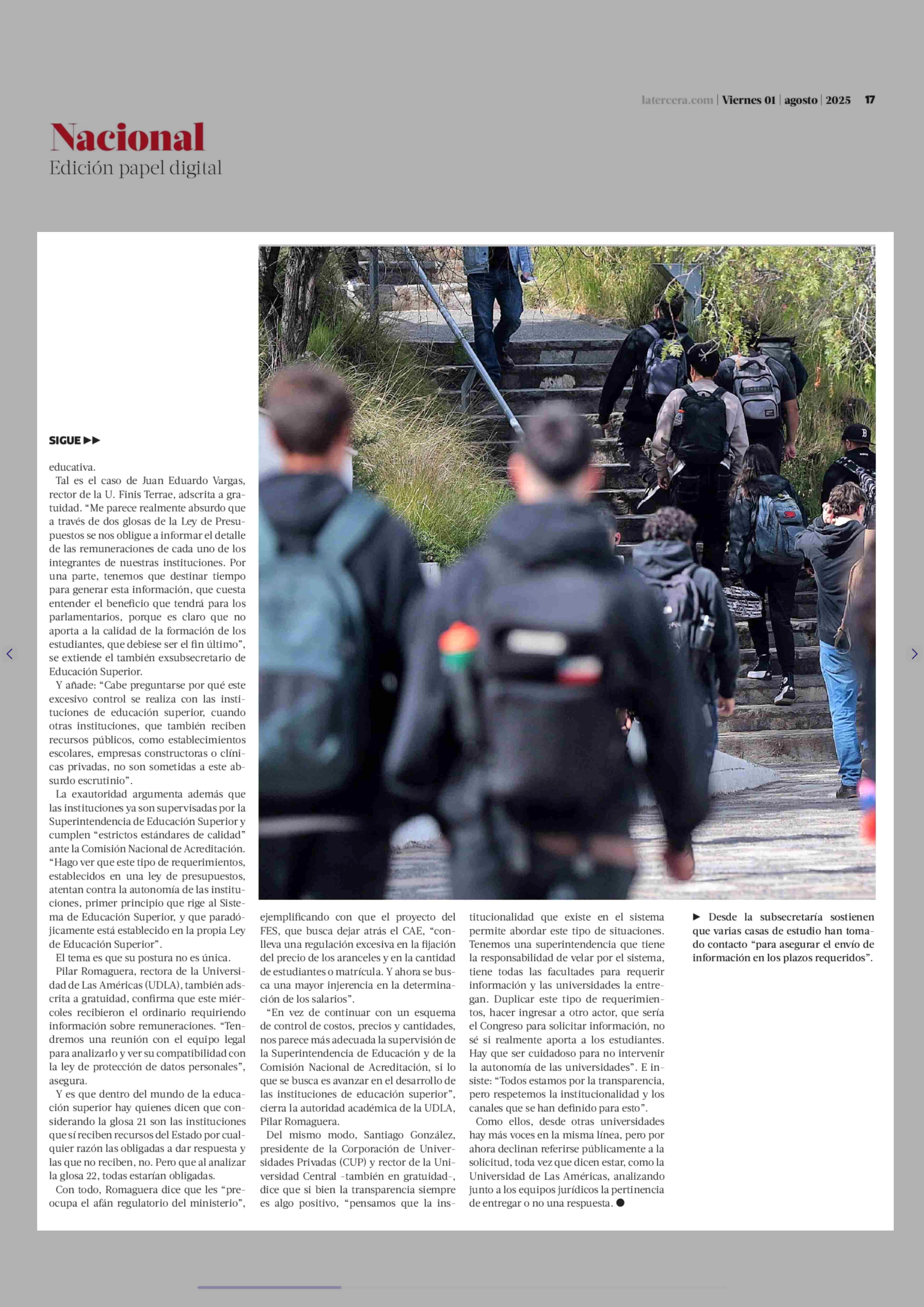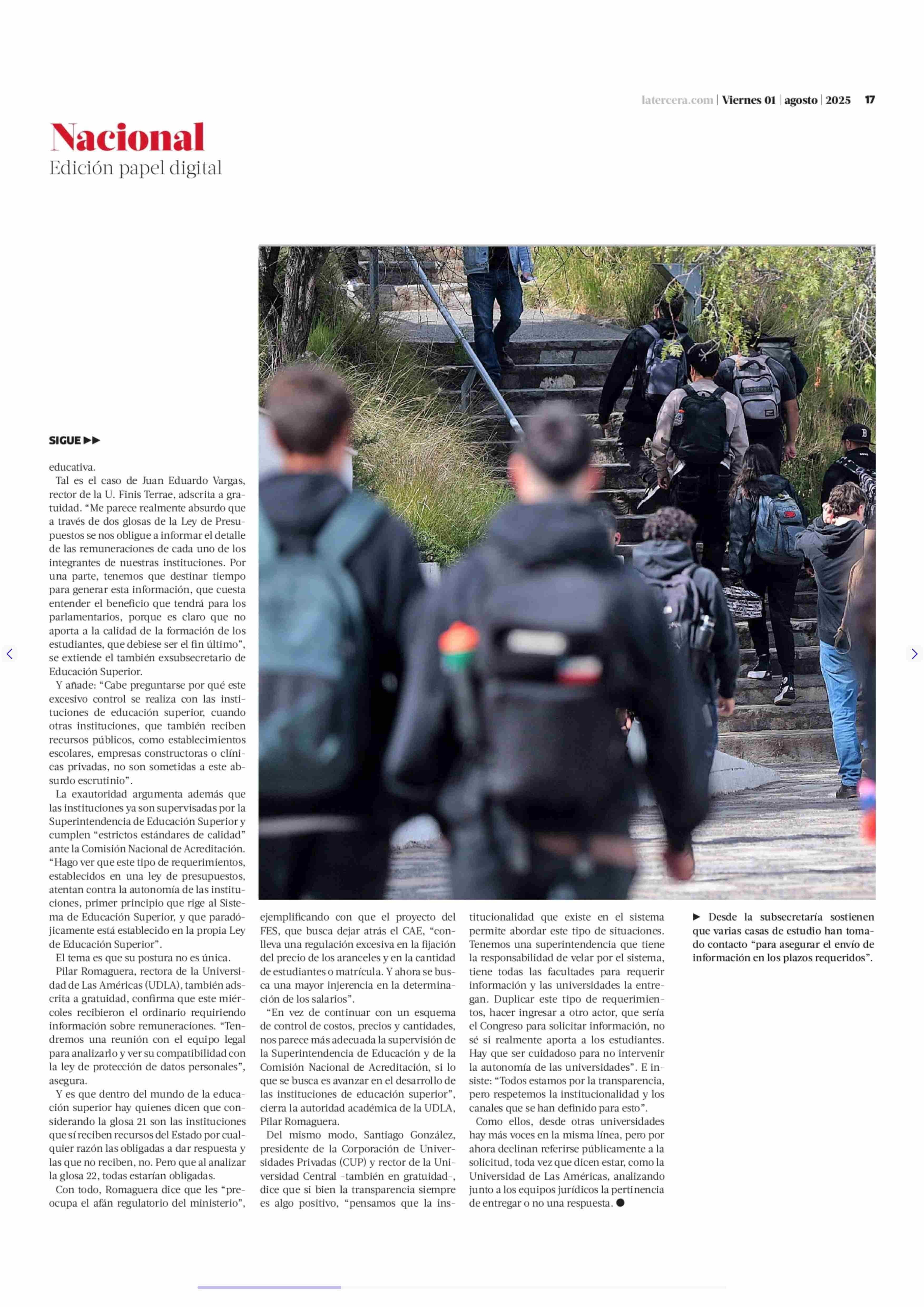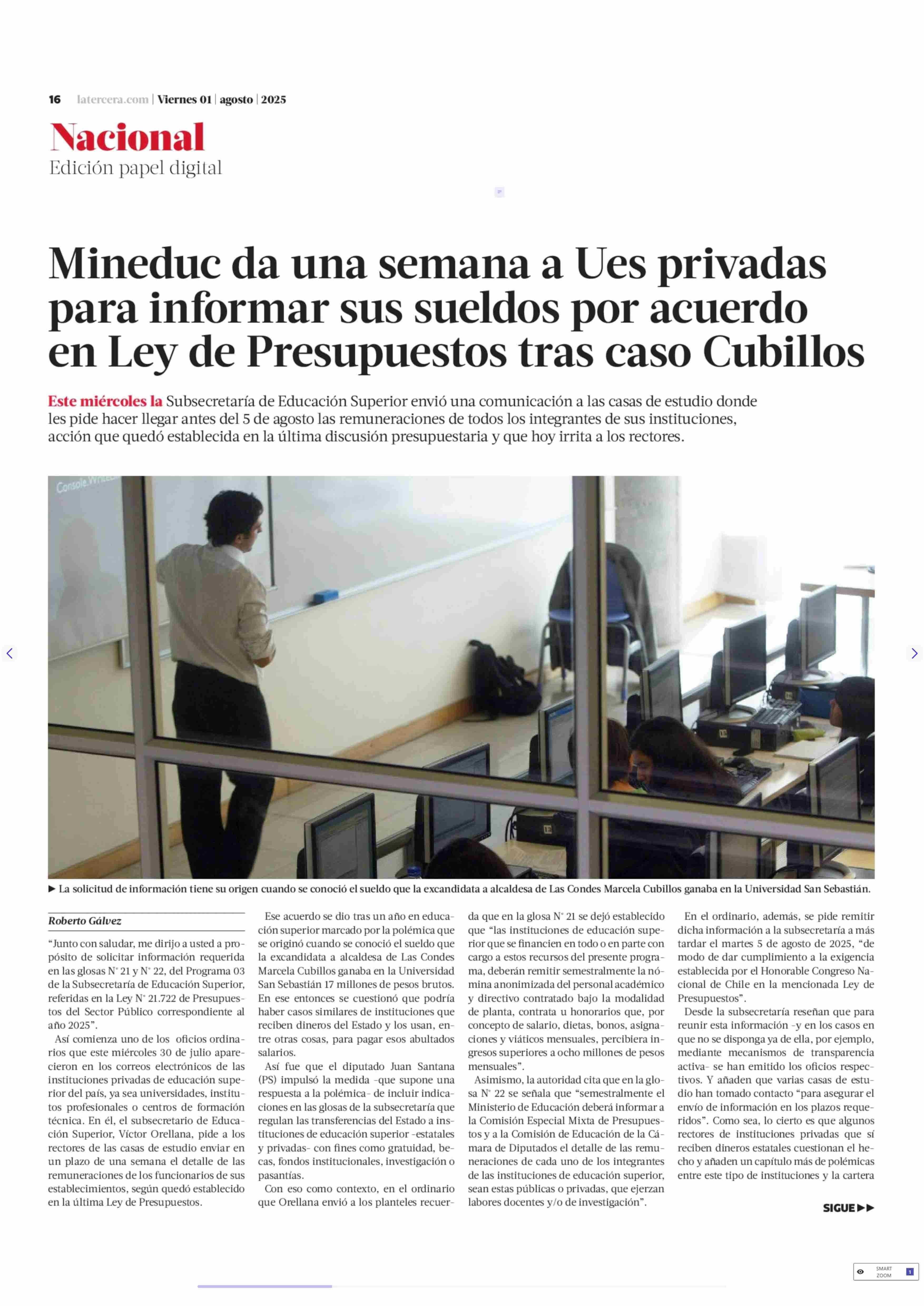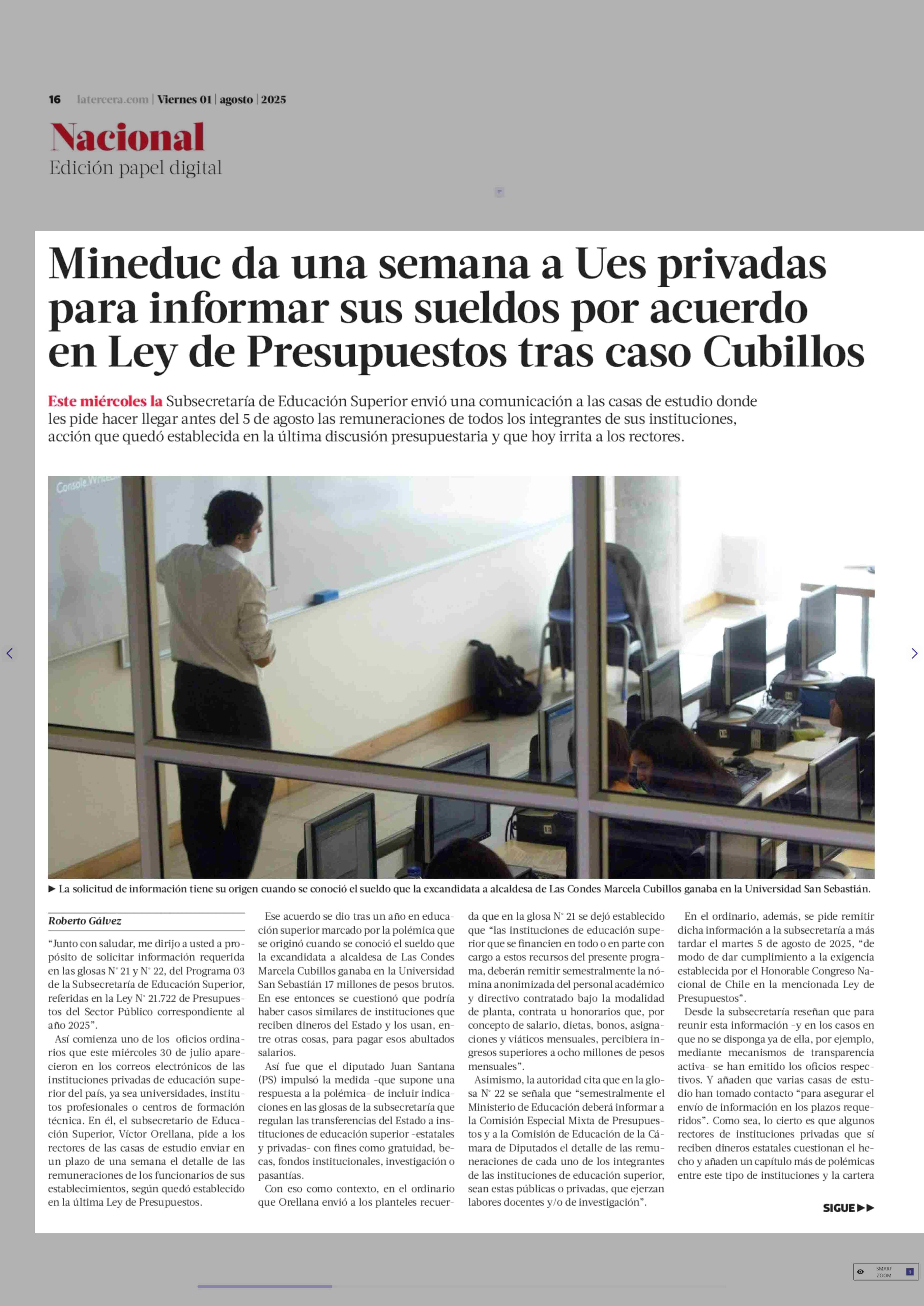 Mineduc da una semana a Ues privadas para informar sus sueldos por acuerdo en Ley de Presupuestos tras caso Cubillos 01-08-2025 La Tercera |