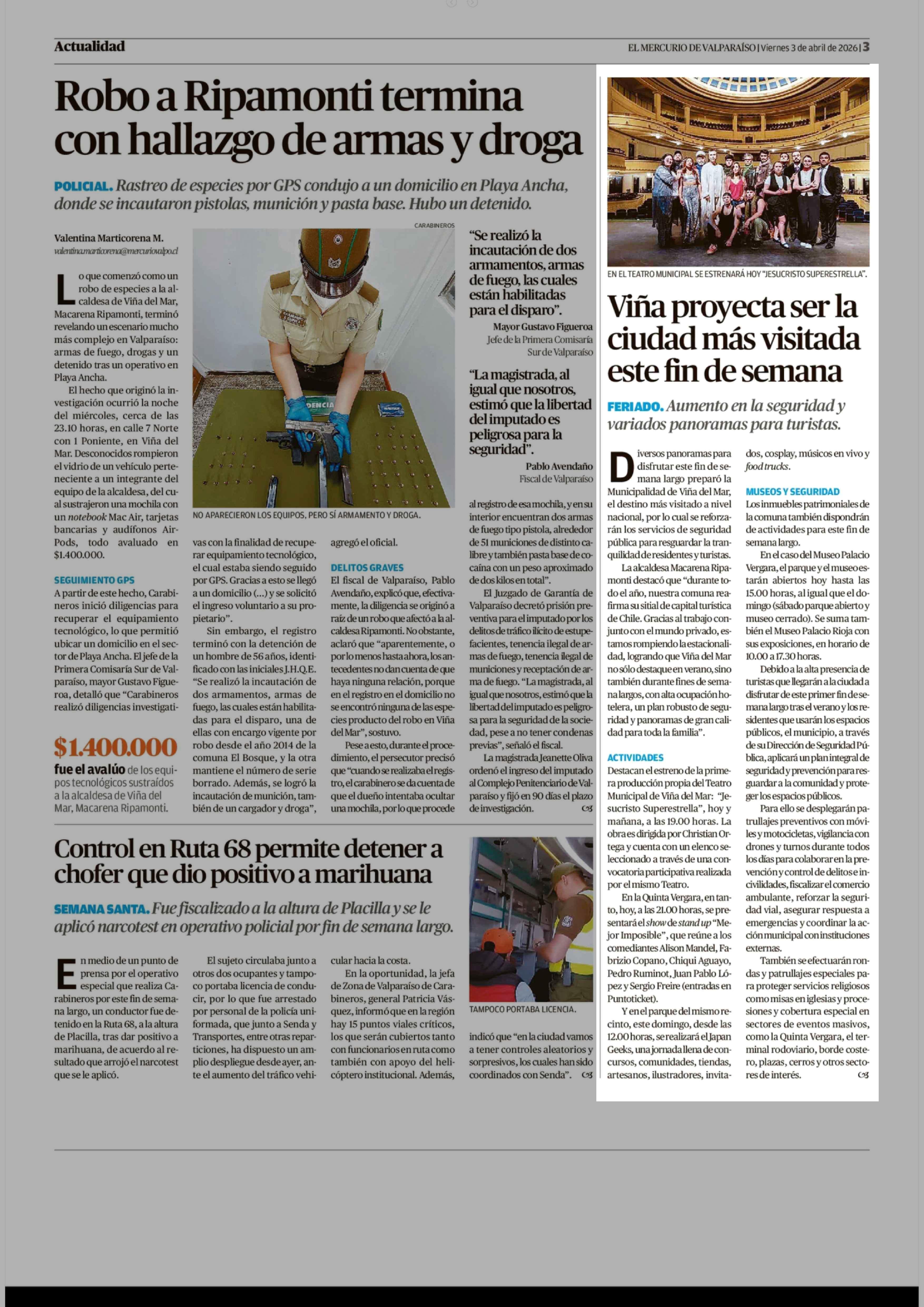 Viña proyecta ser la ciudad más visitada este fin de semana 03-04-2026 El Mercurio de Valparaíso |
