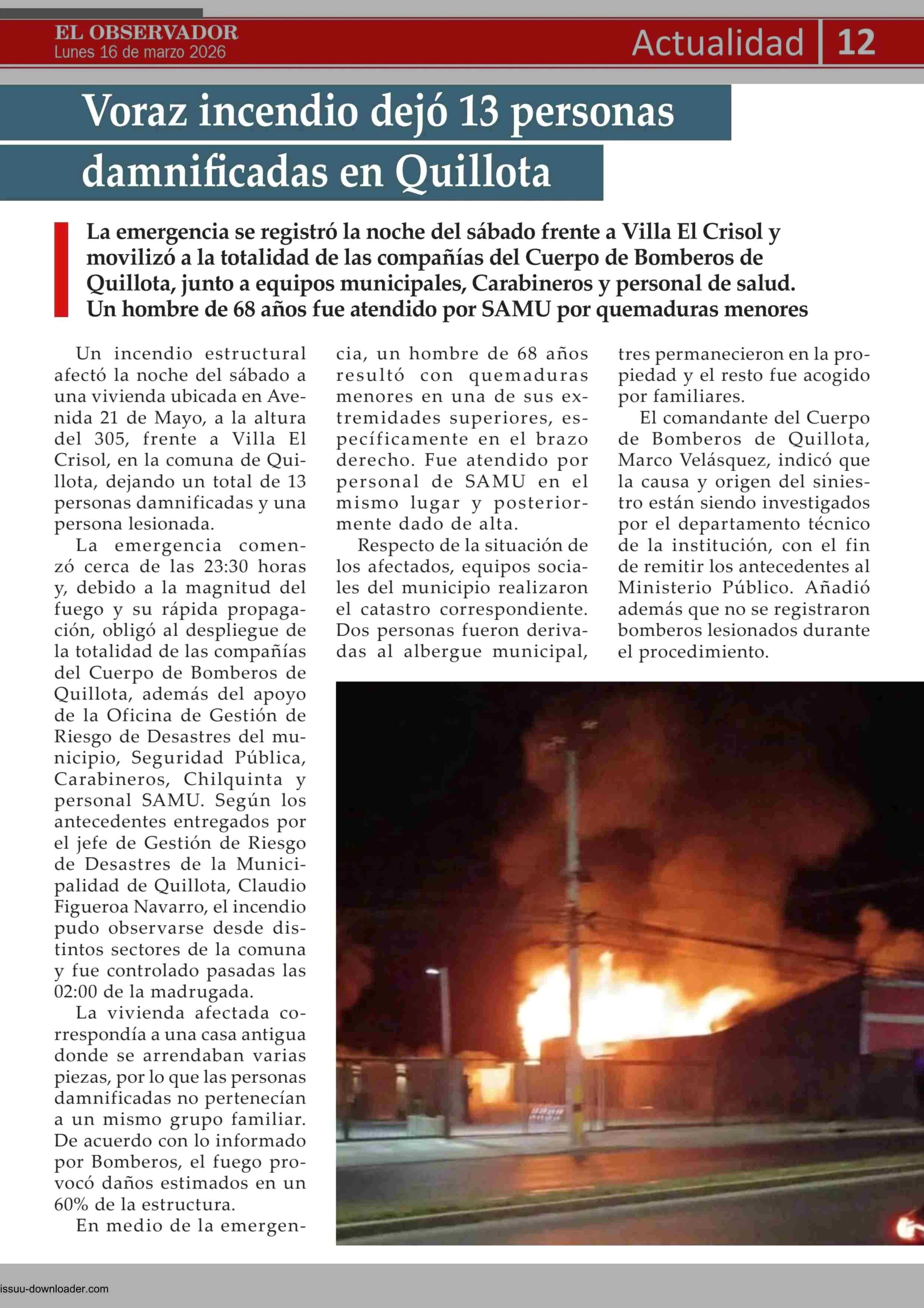 Voraz incendio dejó 13 personas damnificadas en Quillota 16-03-2026 El Observador Vespertino |