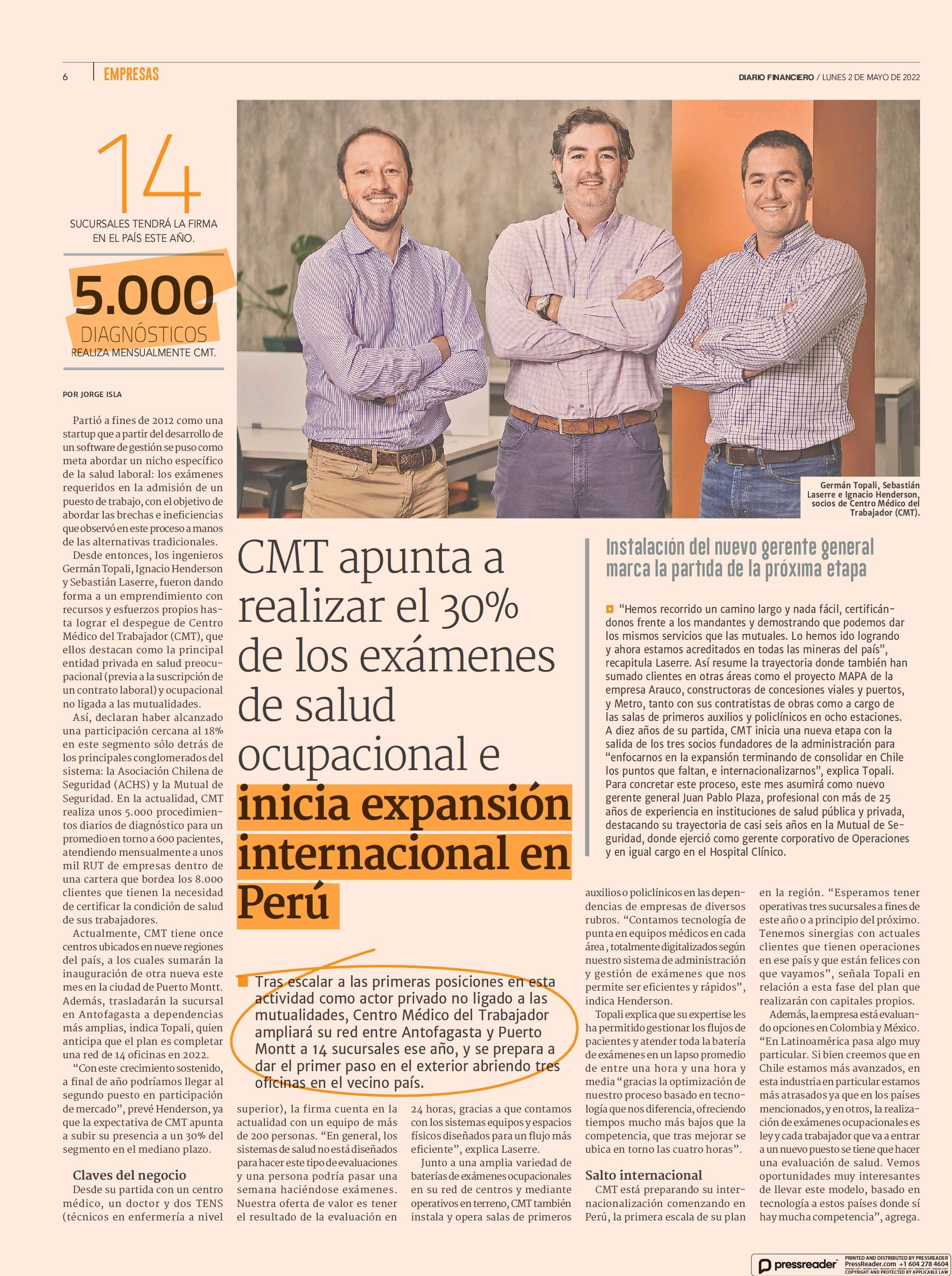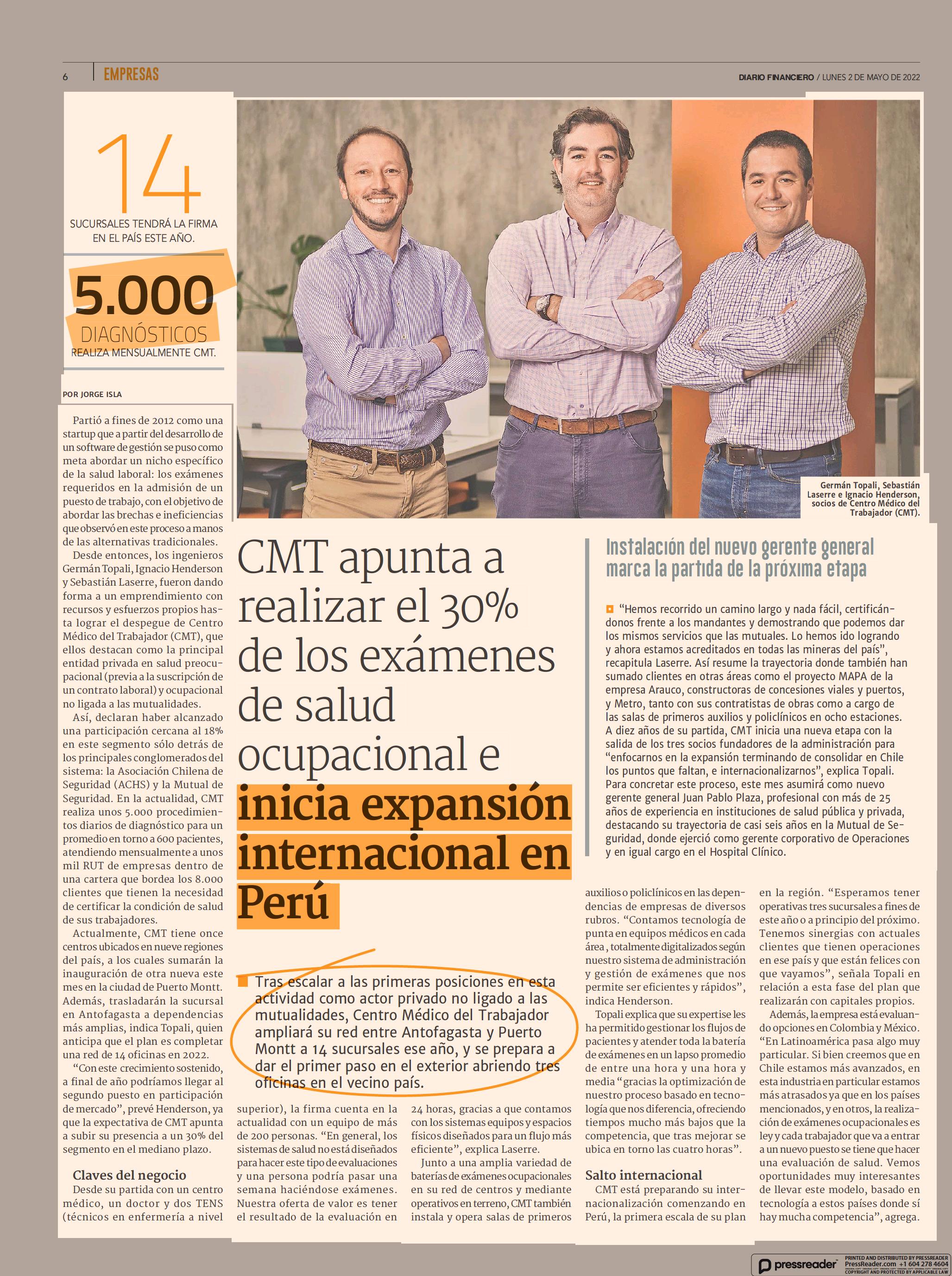 CMT apunta a realizar el 30% de los exámenes de salud ocupacional e inicia expansión internacional en Perú 02-05-2022 Diario Financiero |