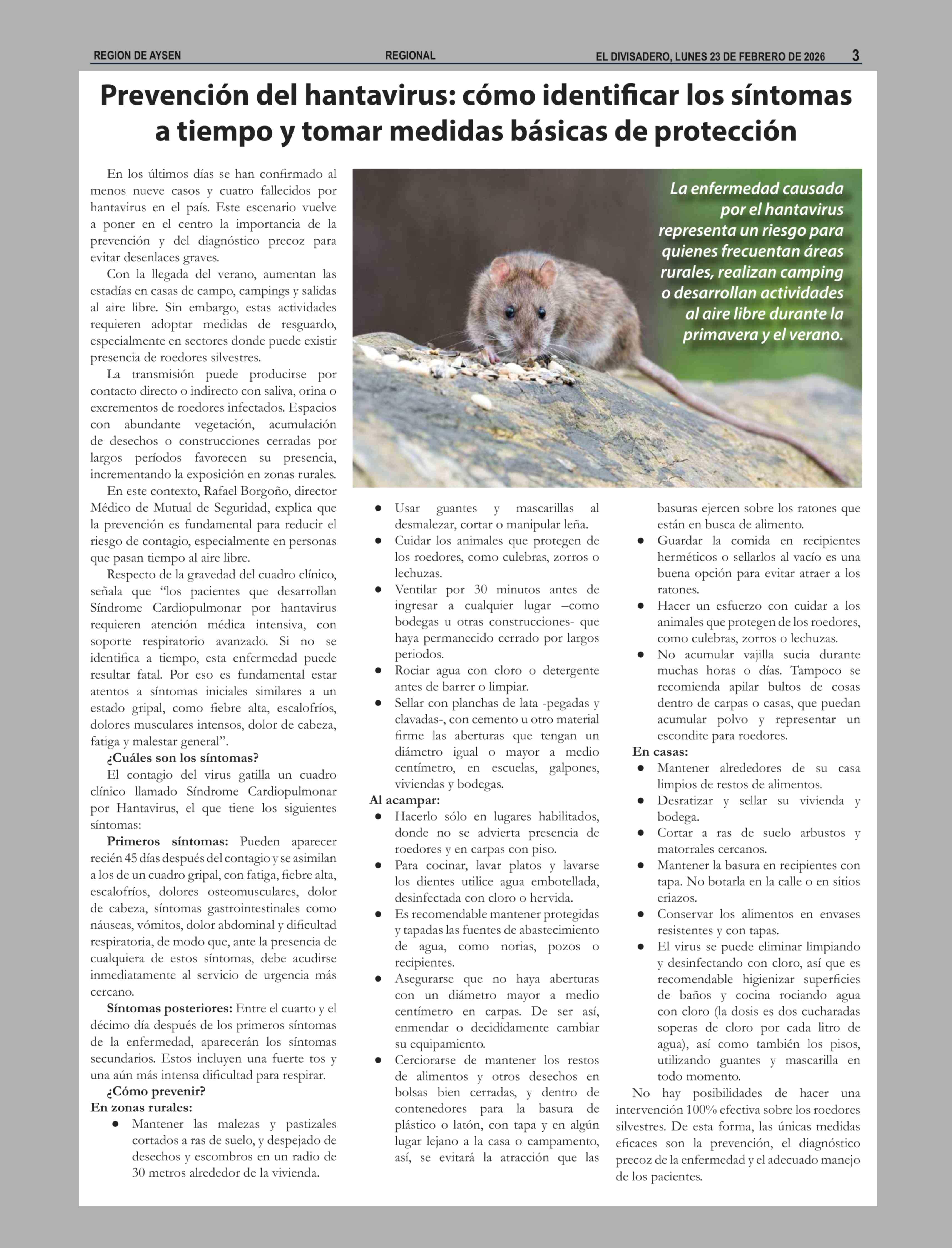 Prevención del hantavirus: cómo identificar los síntomas a tiempo y tomar medidas básicas de protección 23-02-2026 El Divisadero |