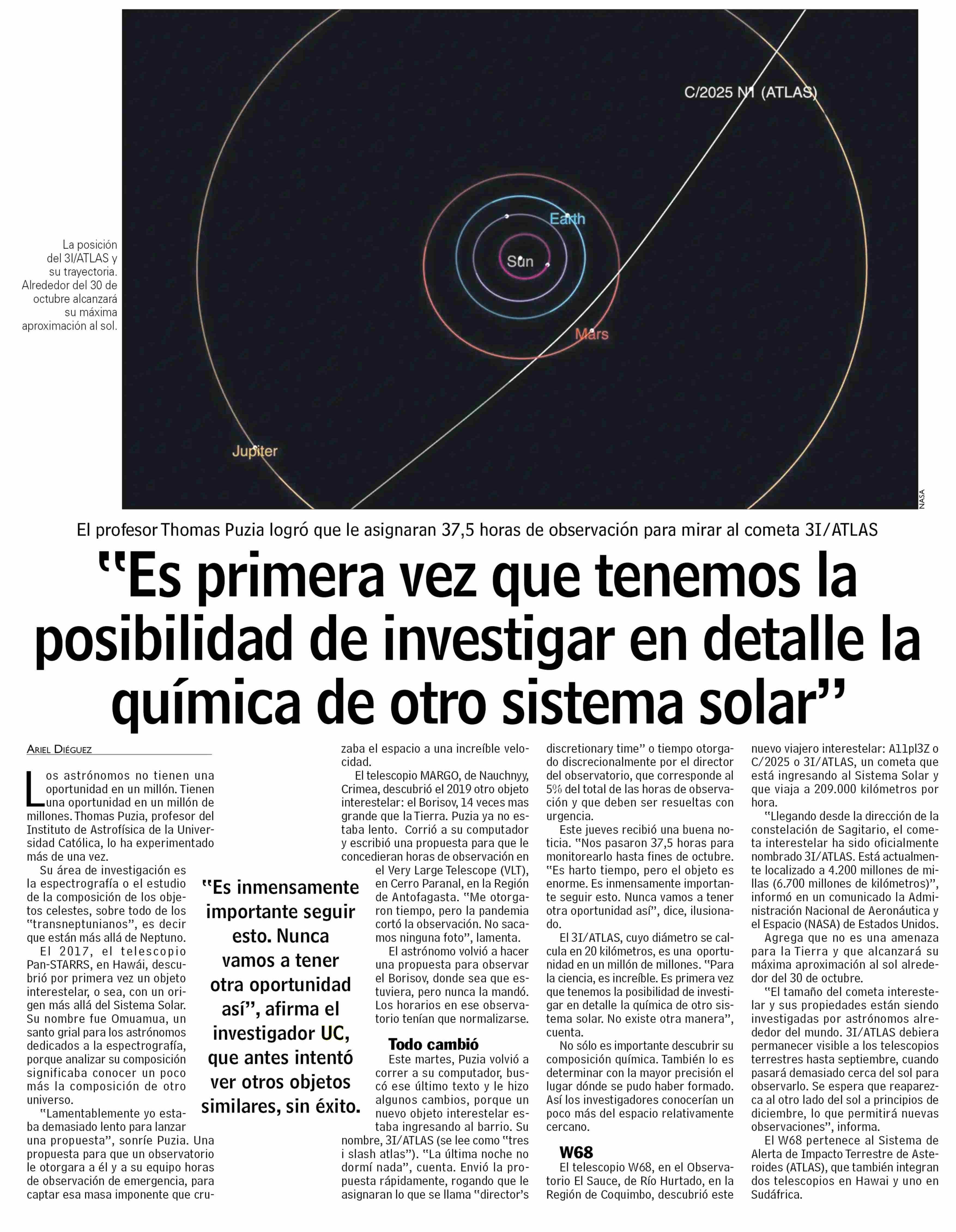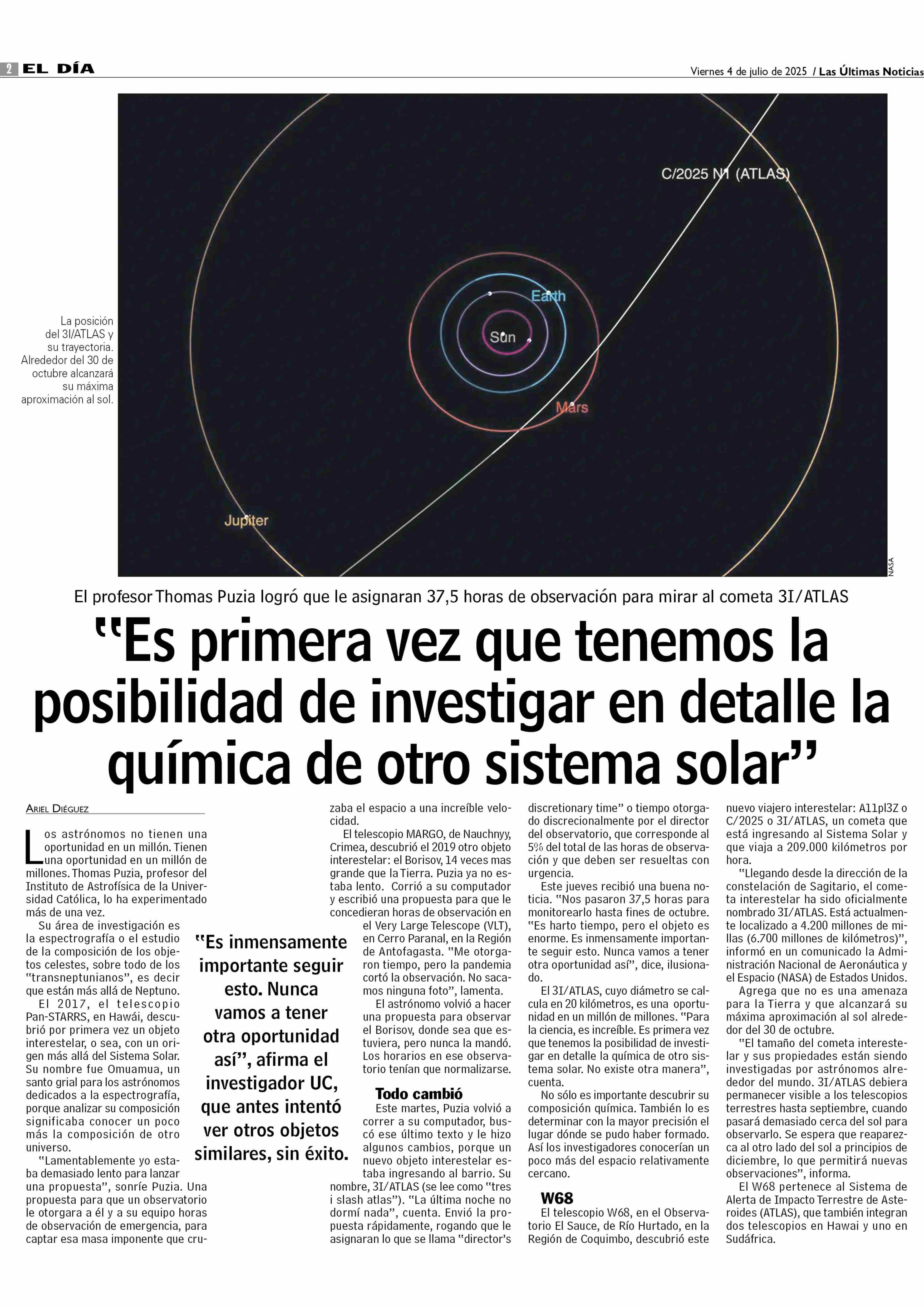 “Es primera vez que tenemos la posibilidad de investigar en detalle la auíimica de otro sistema solar”? 04-07-2025 Las Últimas Noticias |