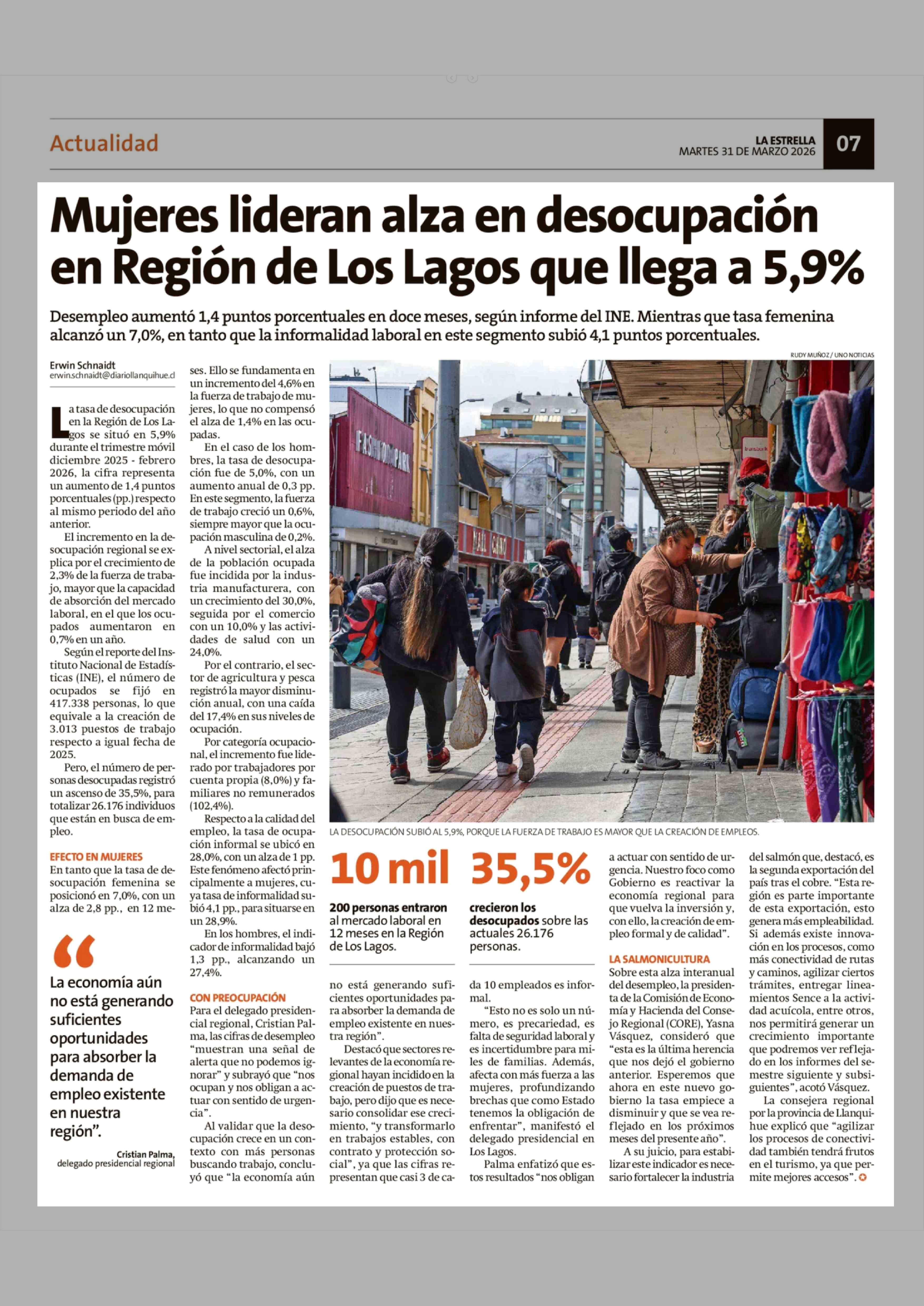 Mujeres lideran alza en desocupación en Región de Los Lagos que llega a 5,9% 31-03-2026 La Estrella de Chiloé |