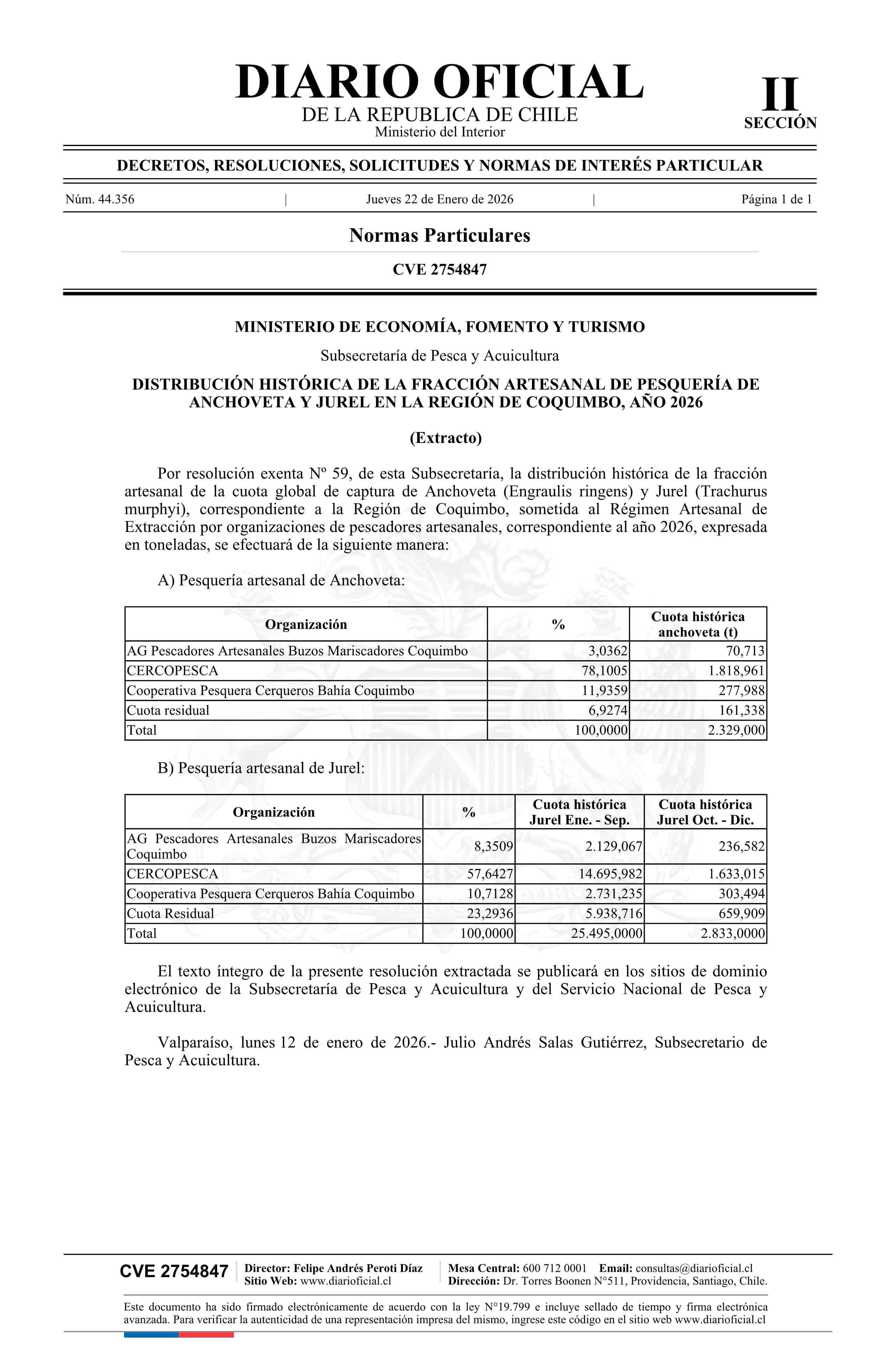 Título: Extracto de resolución exenta número 59, de 2026.- Establece distribución histórica de la fracción artesanal de pesquería de Anchoveta y Jurel en la Región de Coquimbo, año 2026