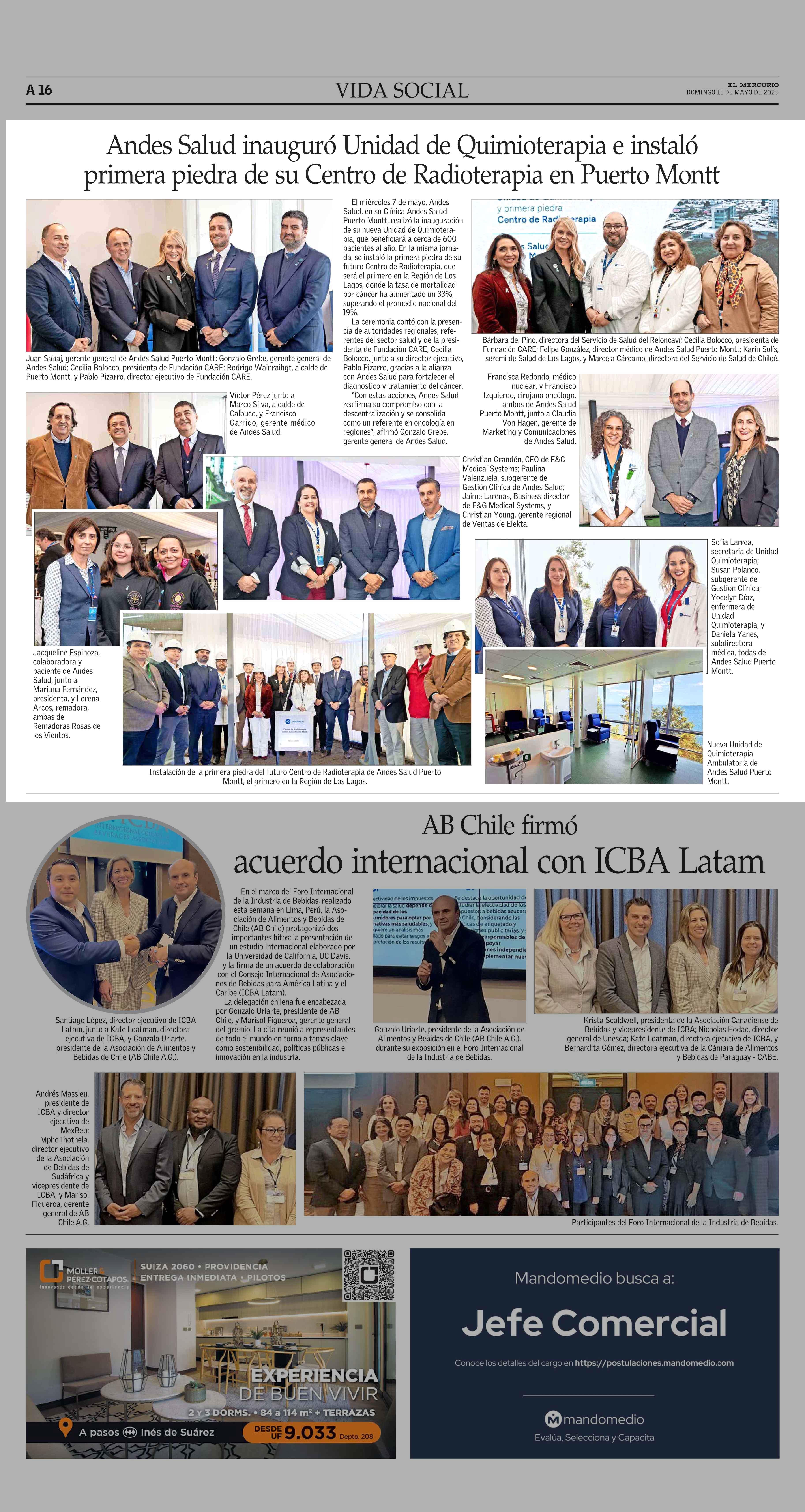 Andes Salud inauguró Unidad de Quimioterapia e instaló primera piedra de su Centro de Radioterapia en Puerto Montt 11-05-2025 El Mercurio |