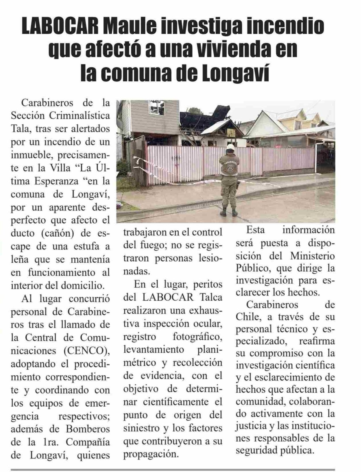 Título: LABOCAR Maule investiga incendio que afectó a una vivienda en la comuna de Longaví