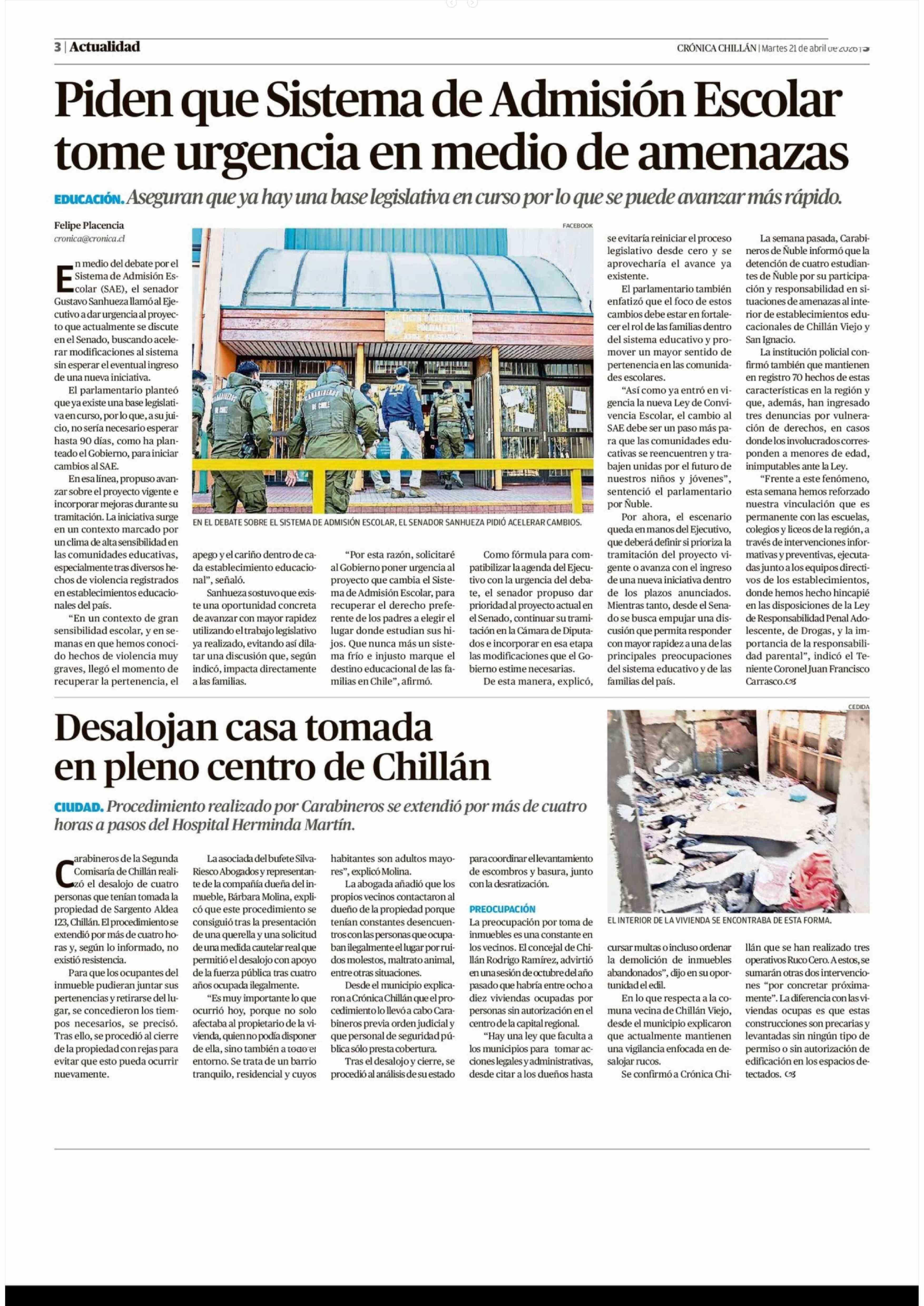 Piden que Sistema de Admisión Escolar tome urgencia en medio de amenazas 21-04-2026 Crónica de Chillán |
