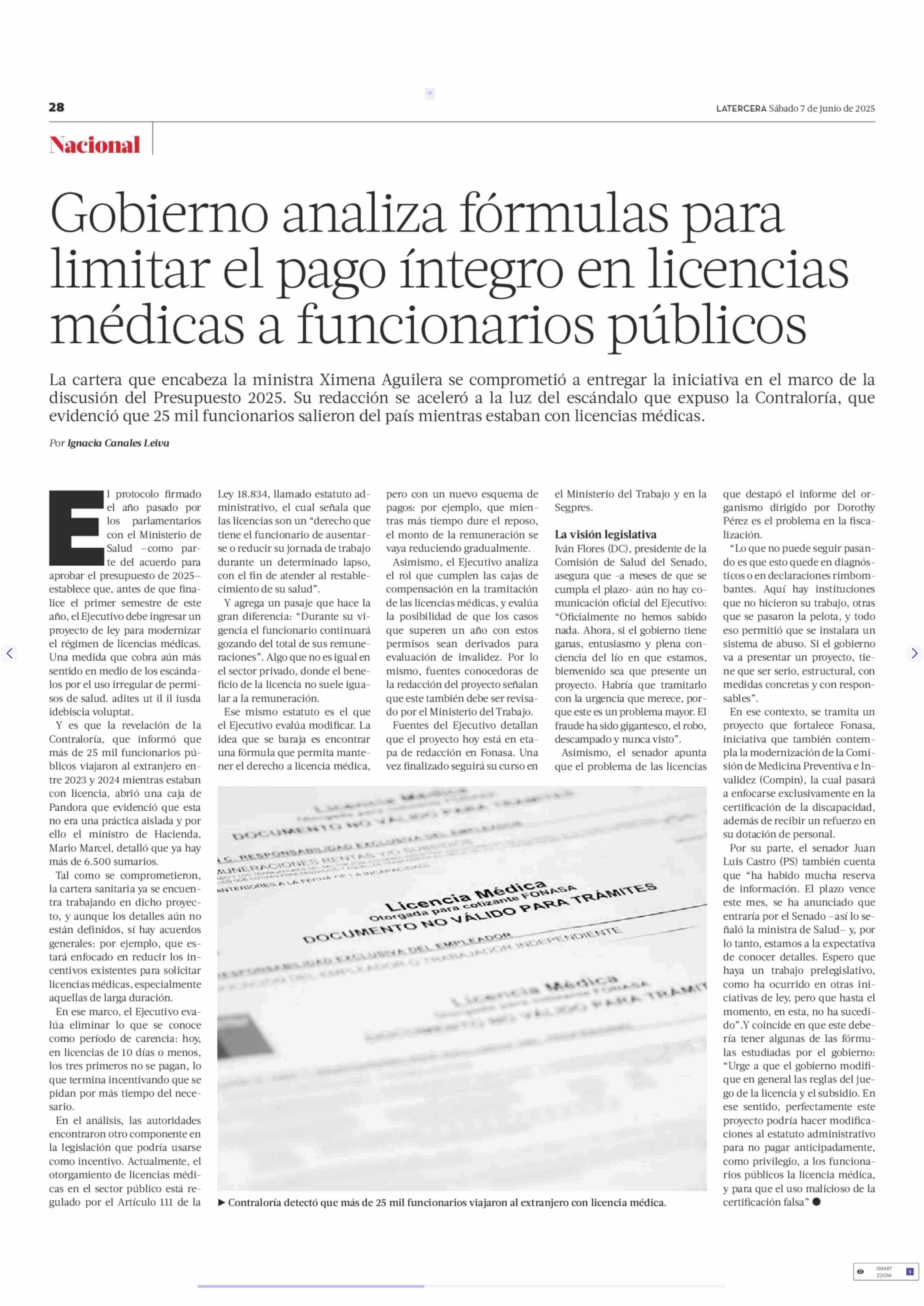 Gobierno analiza fórmulas para limitar el pago íntegro en licencias médicas a funcionarios públicos 07-06-2025 La Tercera |
