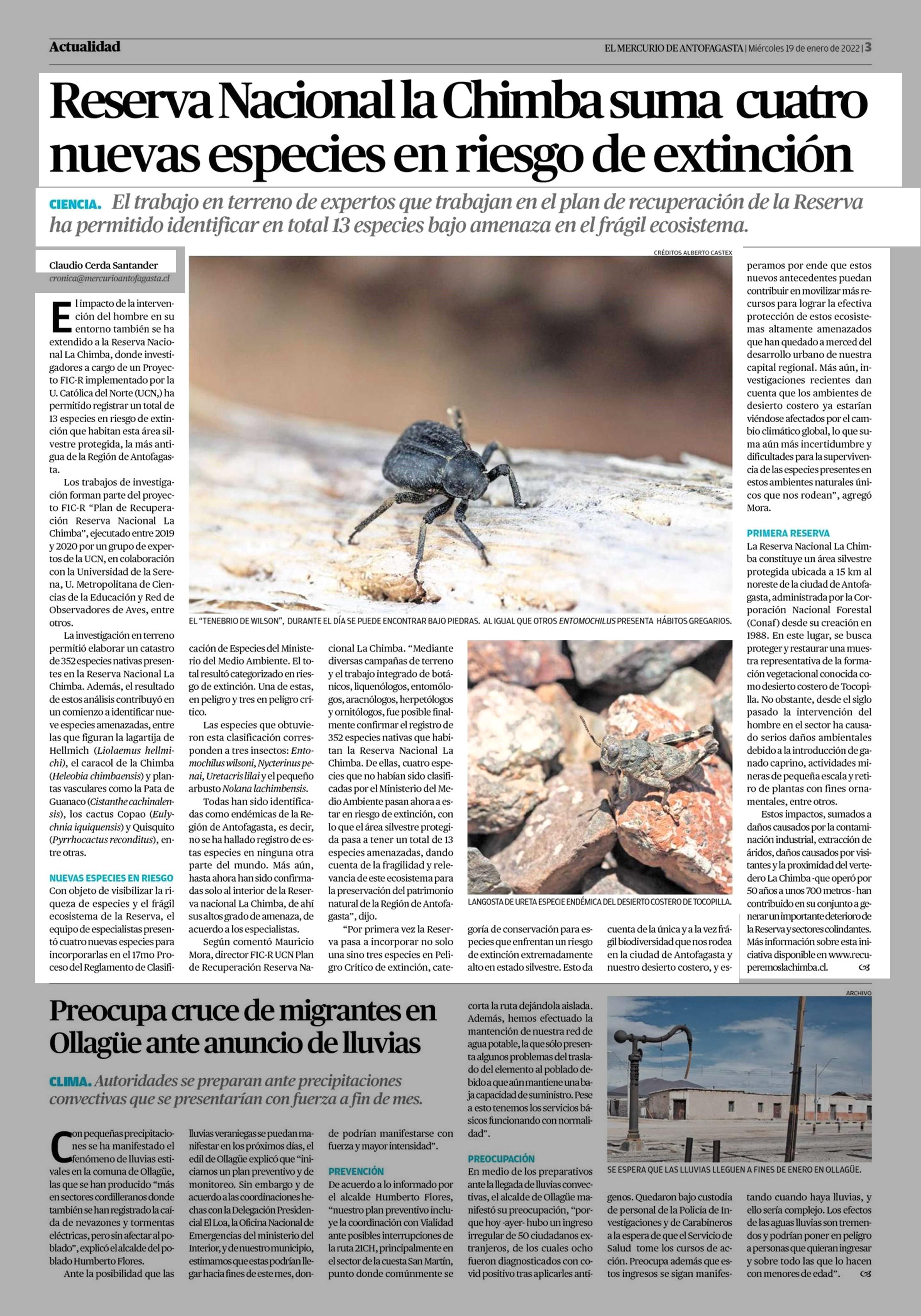 Reserva Nacional la Chimba suma cuatro nuevas especies en riesgo de extinción 19-01-2022 El Mercurio de Antofagasta |