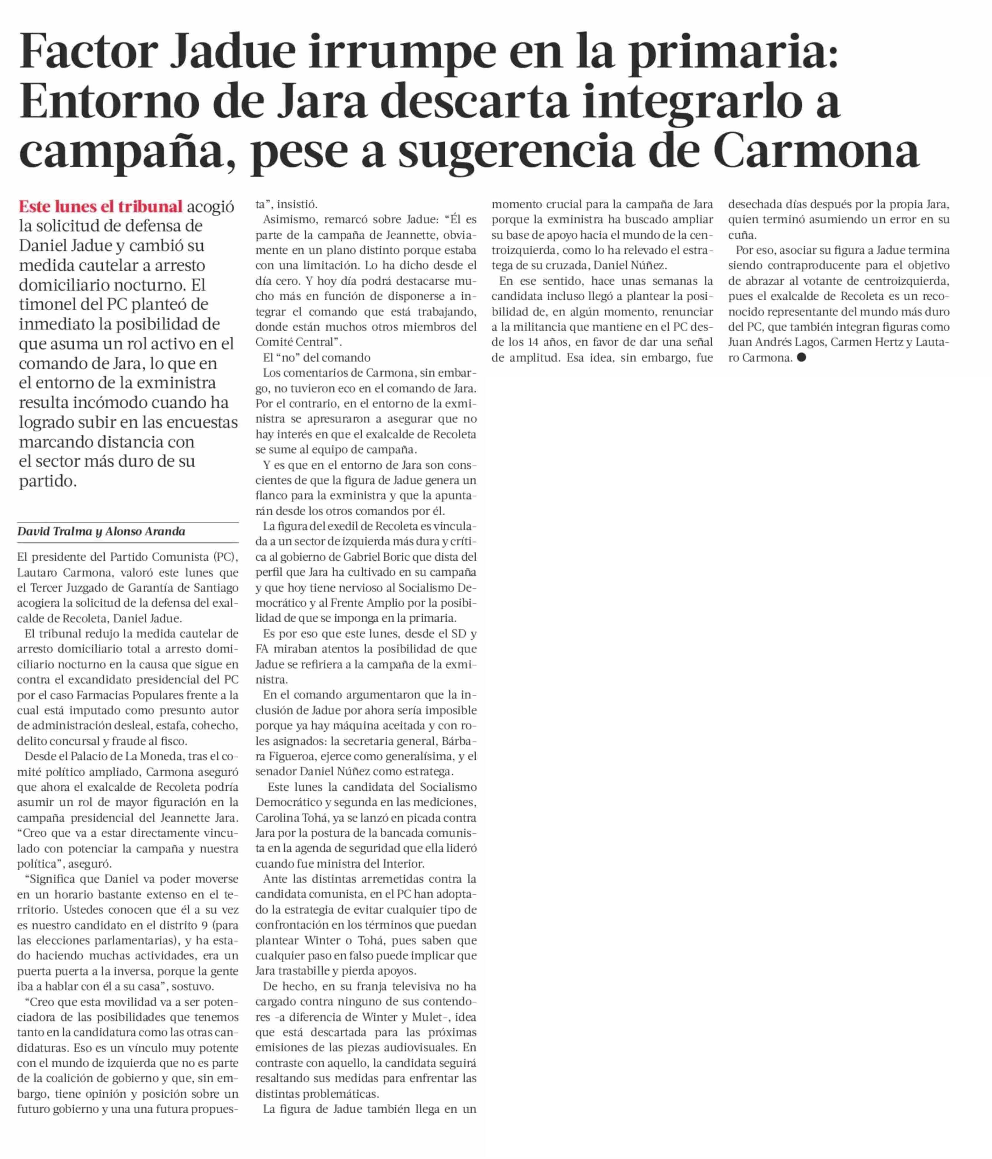 Título: Factor Jadue irrumpe en la primaria: Entorno de Jara descarta integrarlo a campaña, pese a sugerencia de Carmona