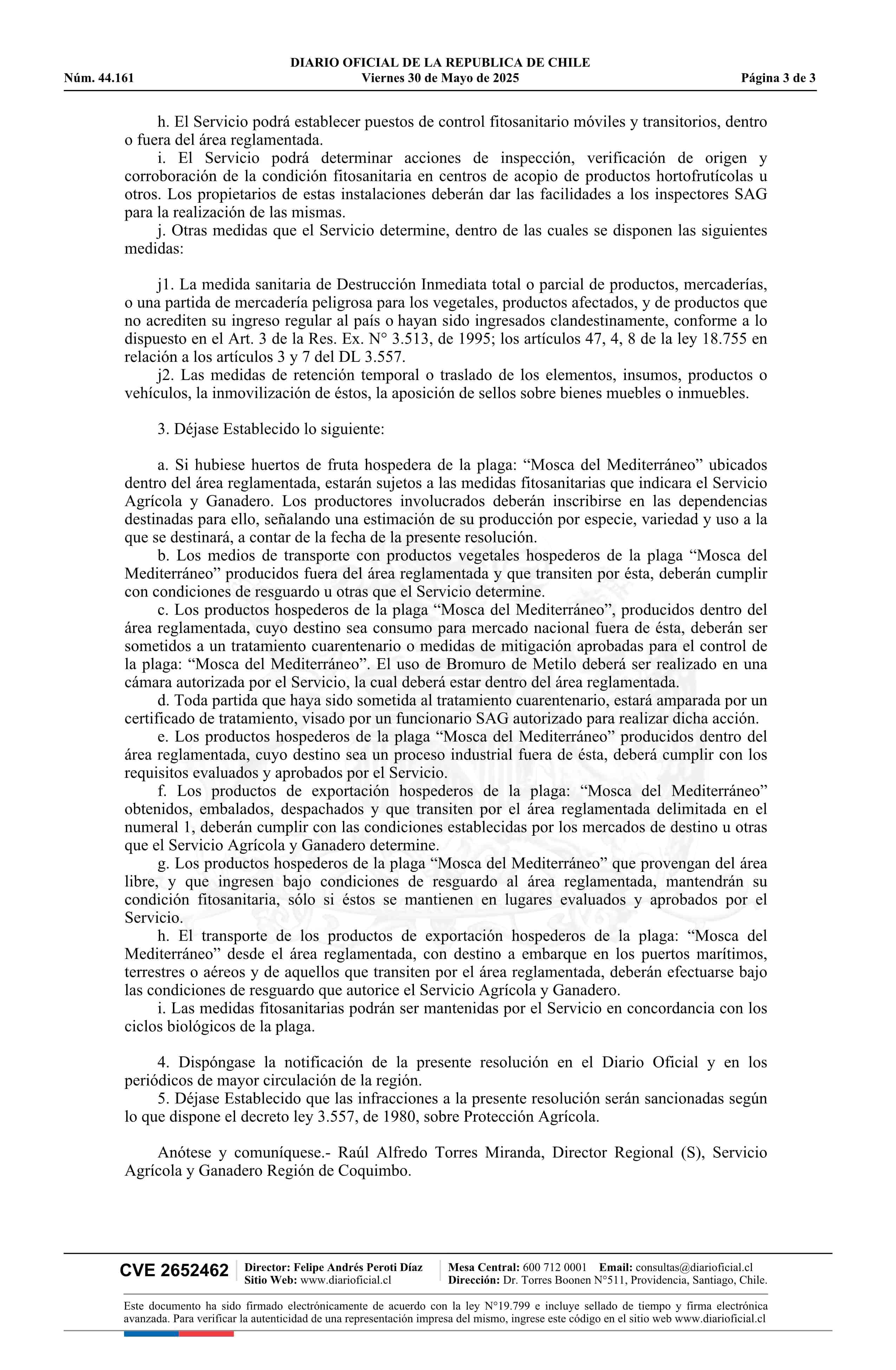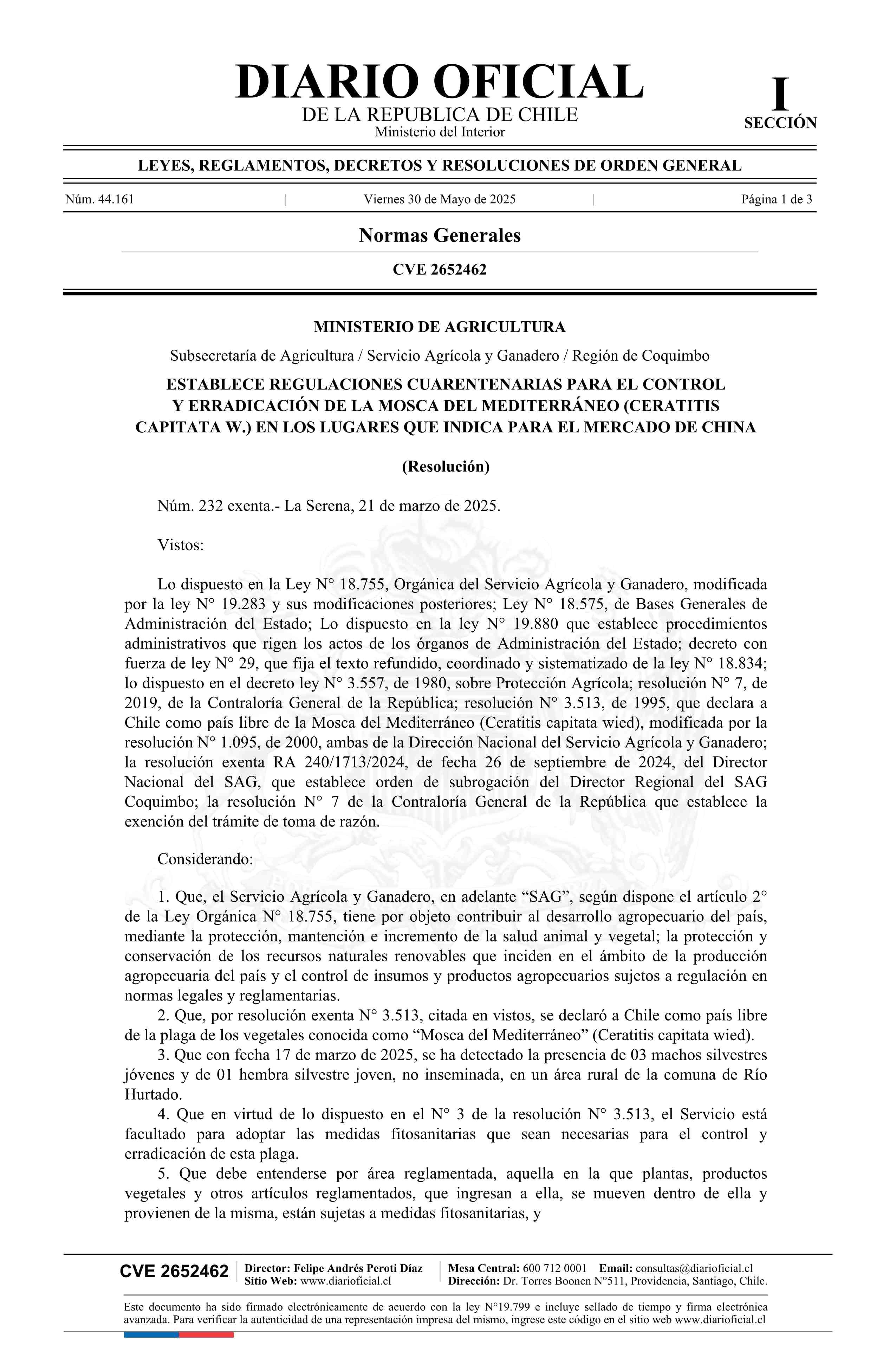 Título: Resolución exenta número 232, de 2025.- Establece regulaciones cuarentenarias para el control y erradicación de la Mosca del Mediterráneo (Ceratitis capitata W.) en los lugares que indica para el mercado de China