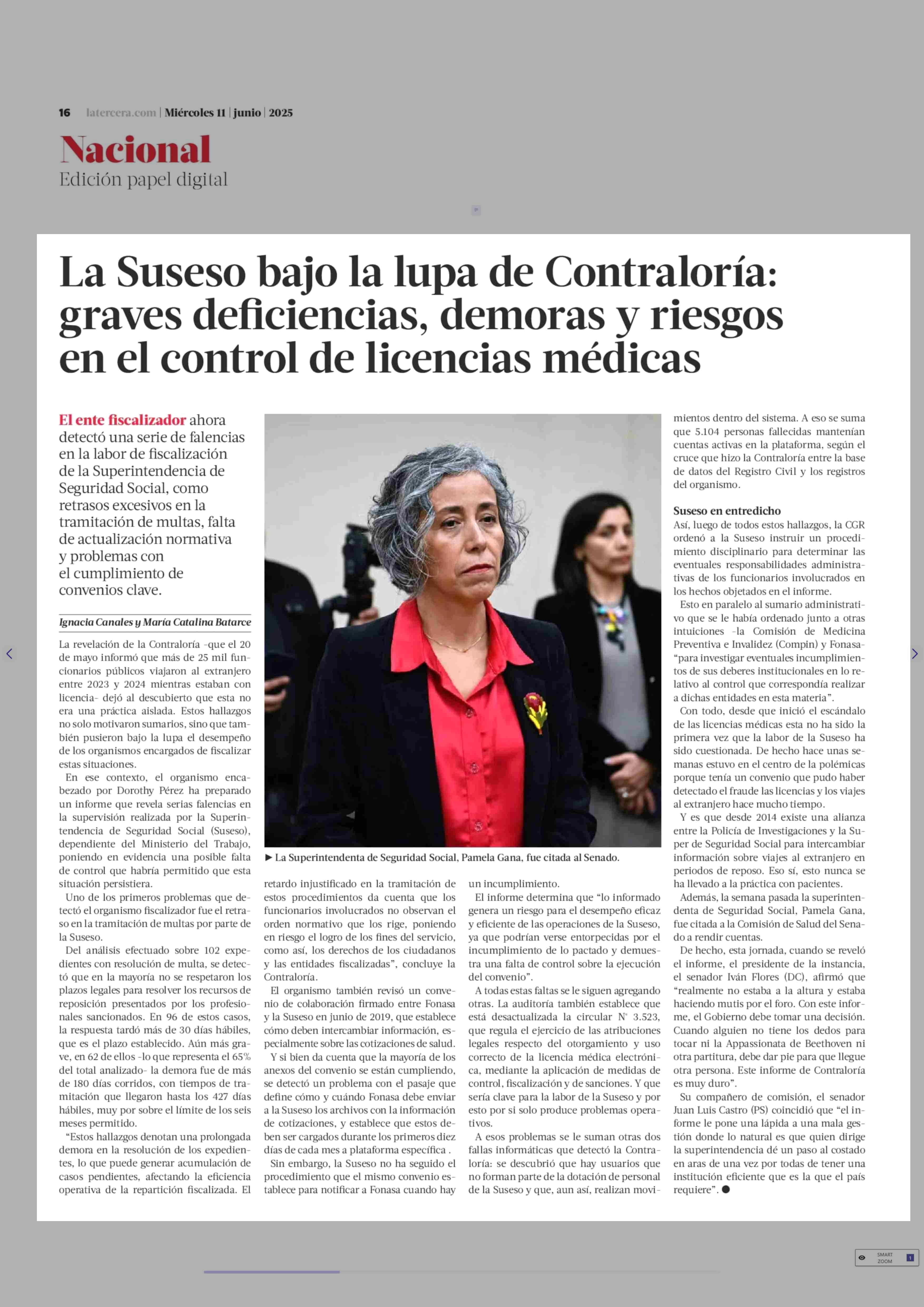 La Suseso bajo la lupa de Contraloría: graves deficiencias, demoras y riesgos en el control de licencias médicas 11-06-2025 La Tercera |