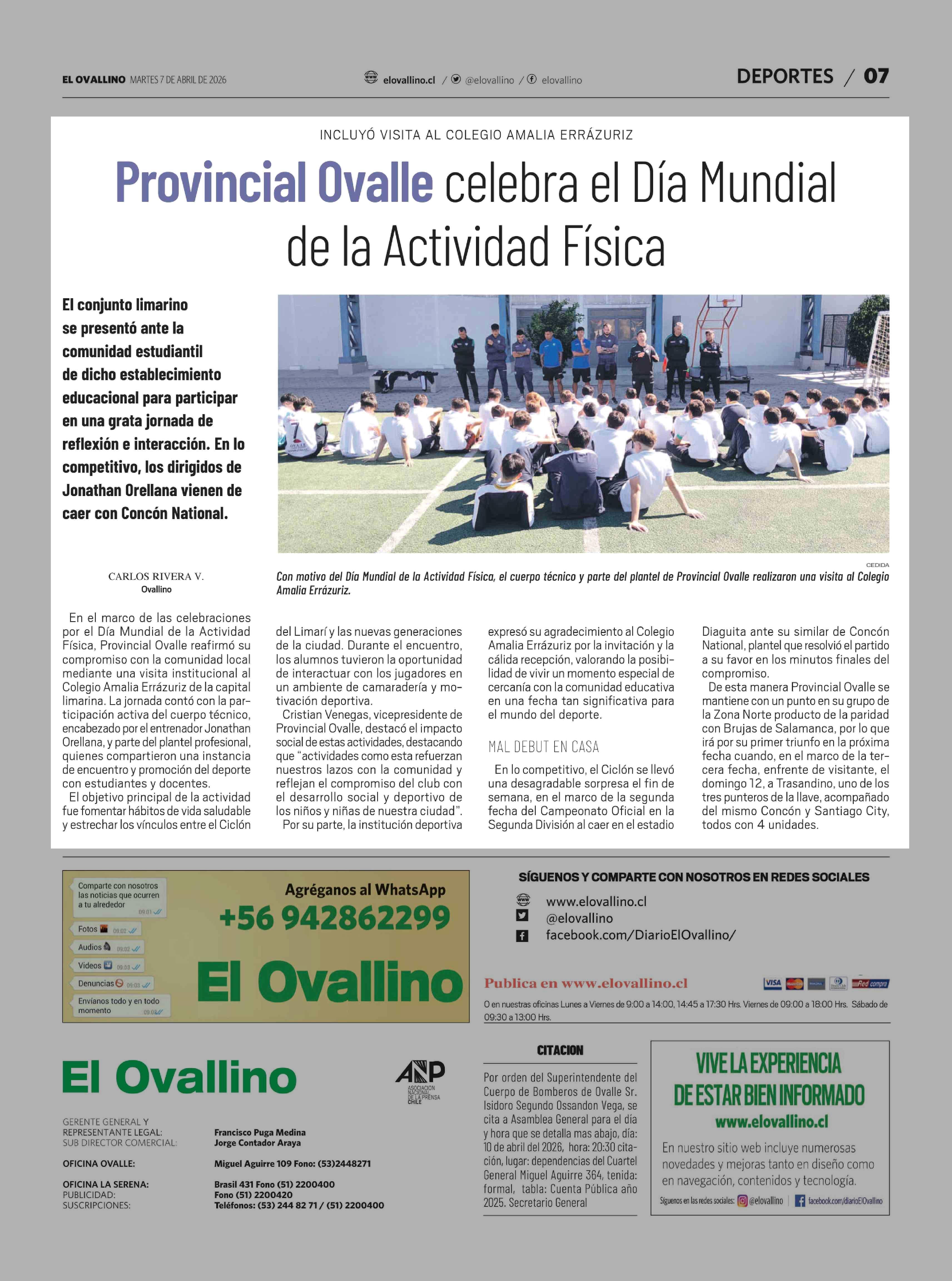 Provincial Ovalle celebra el Día Mundial de la Actividad Física 07-04-2026 El Ovallino |