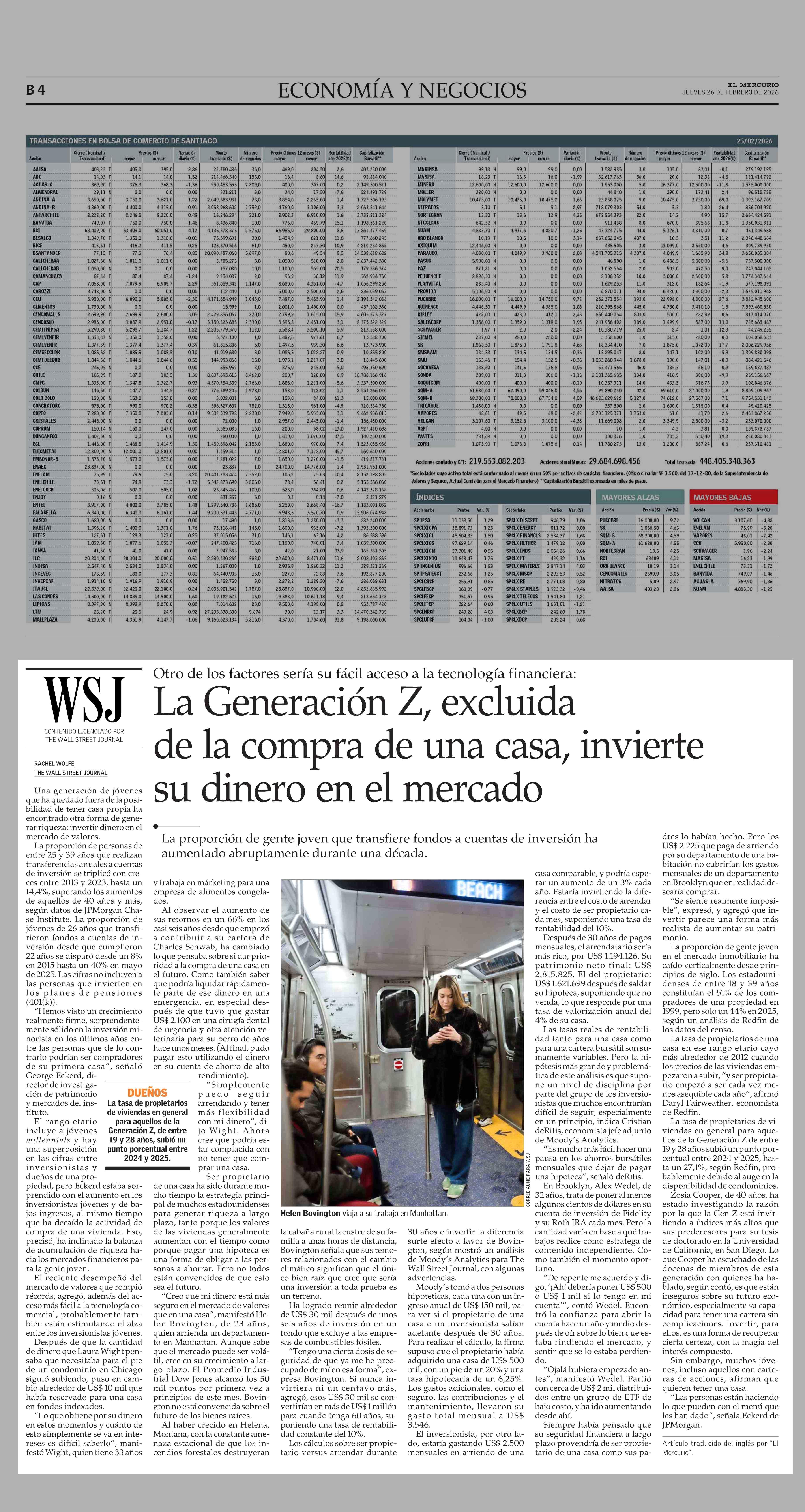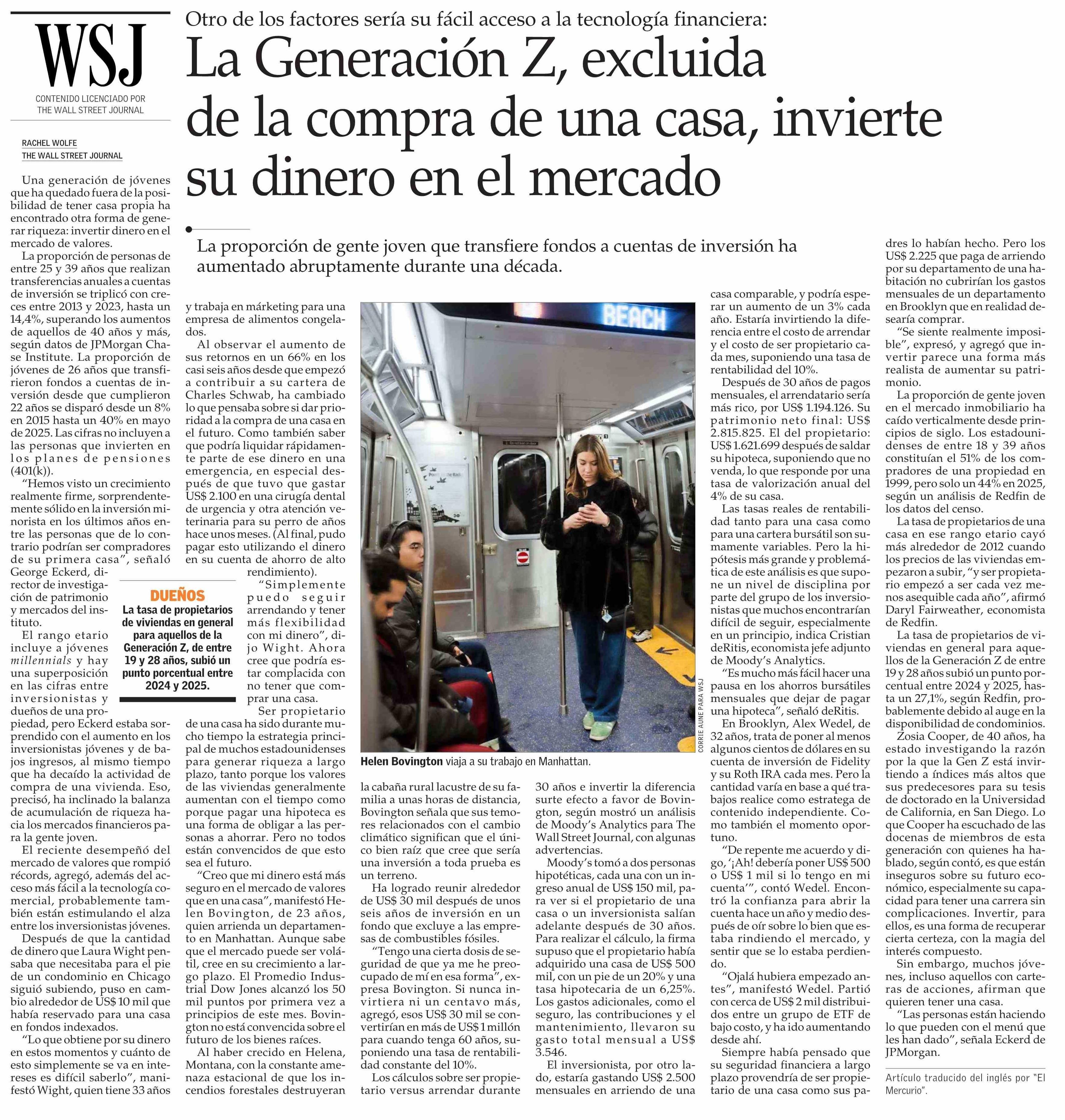 La Generación Z, excluida de la compra de una casa, invierte su dinero en el mercado 26-02-2026 El Mercurio |