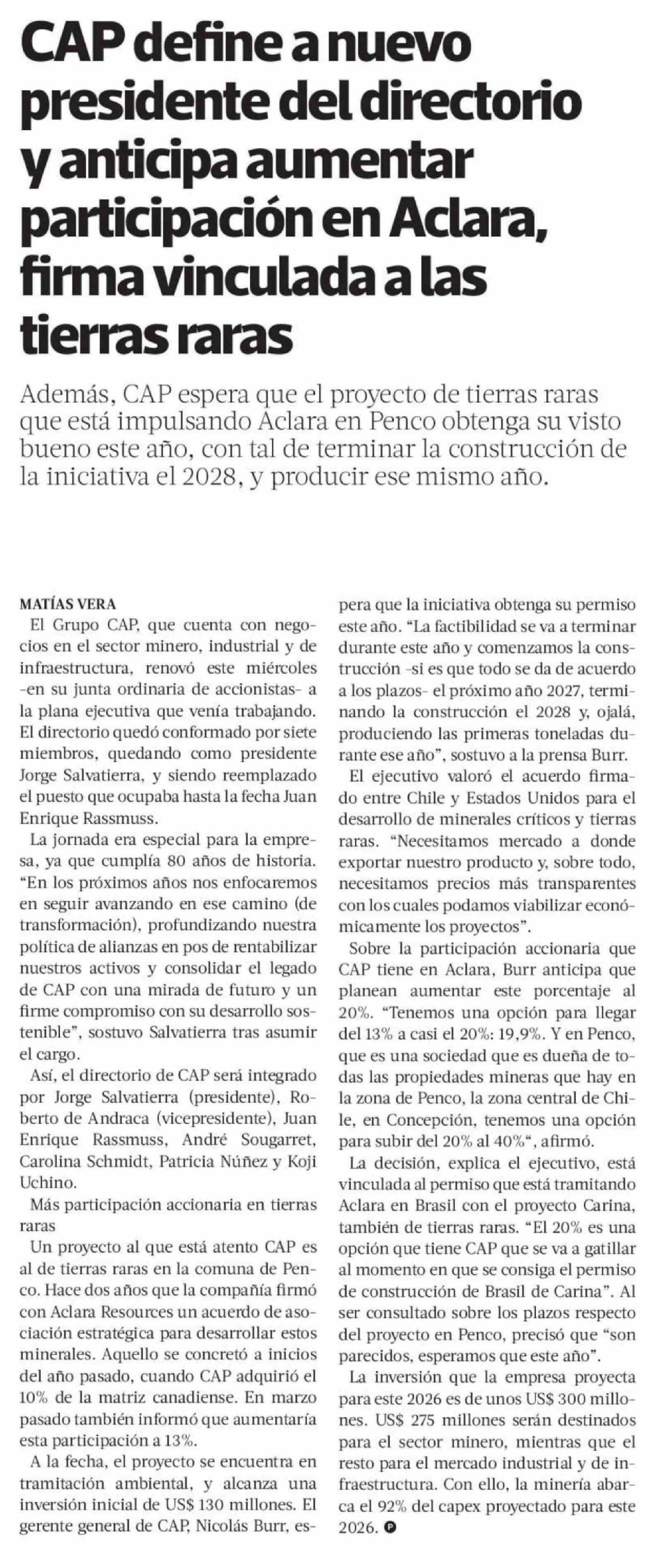 Título: CAP define a nuevo presidente del directorio y anticipa aumentar participación en Aclara, firma vinculada a las tierras raras