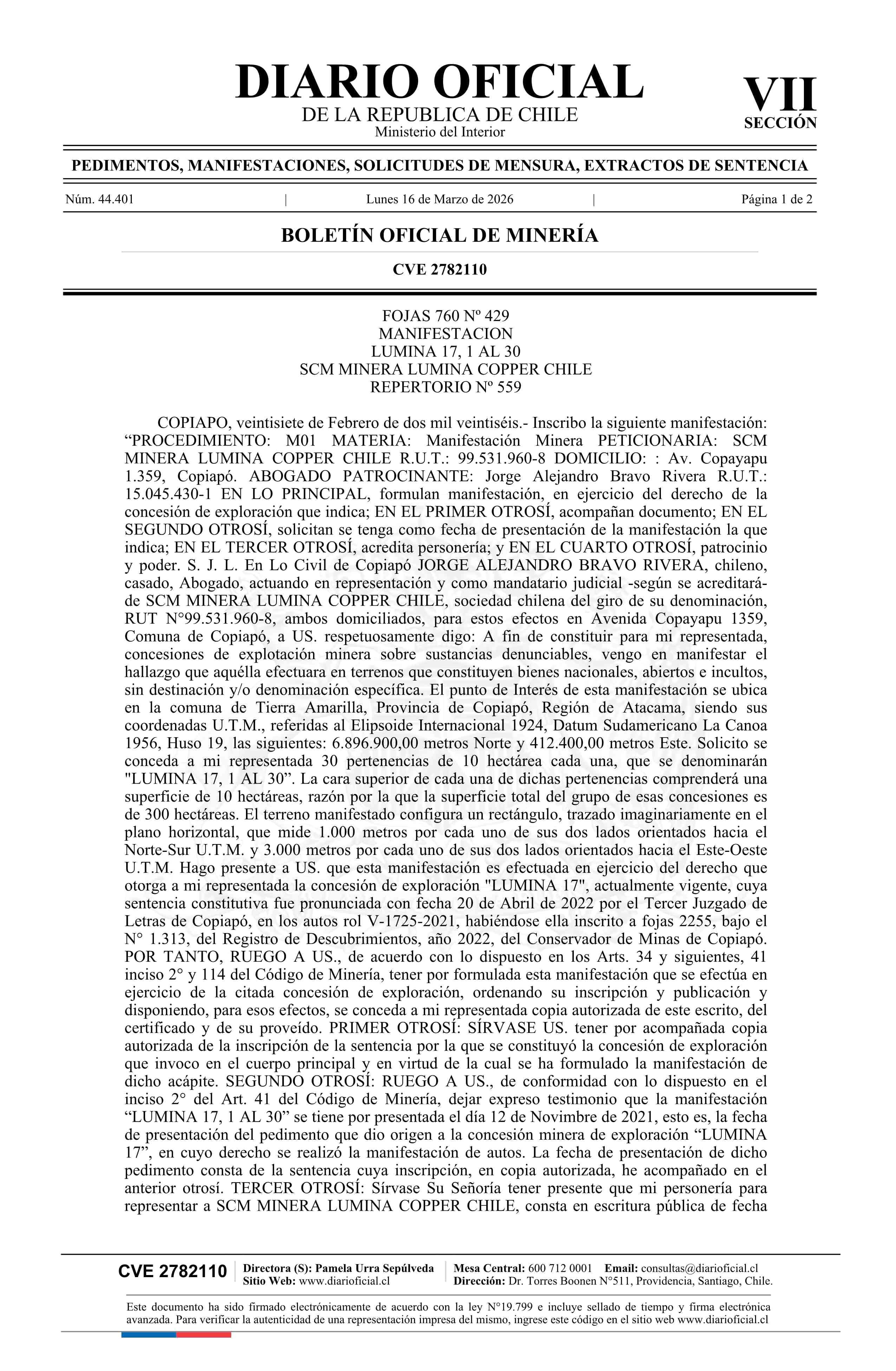 Fuente: DIARIO OFICIAL CHILE - BOLETÍN OFICIAL DE MINERÍA (DIARIO OFICIAL CHILE – BOM – MANIFESTACIONES MIN) Página(s): 25-26
