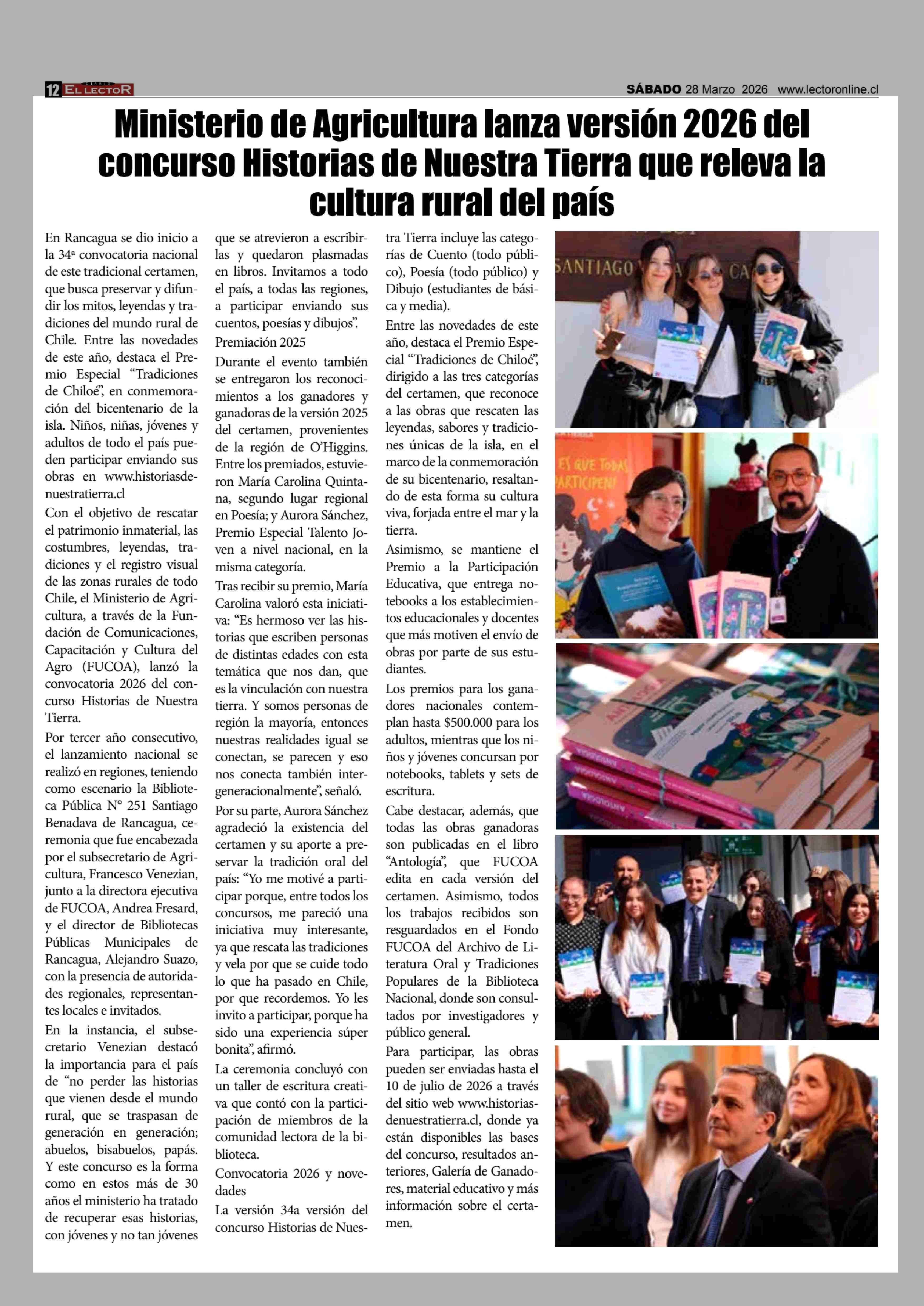 Ministerio de Agricultura lanza versión 2026 del concurso Historias de Nuestra Tierra que releva la cultura rural del país 28-03-2026 El Lector |