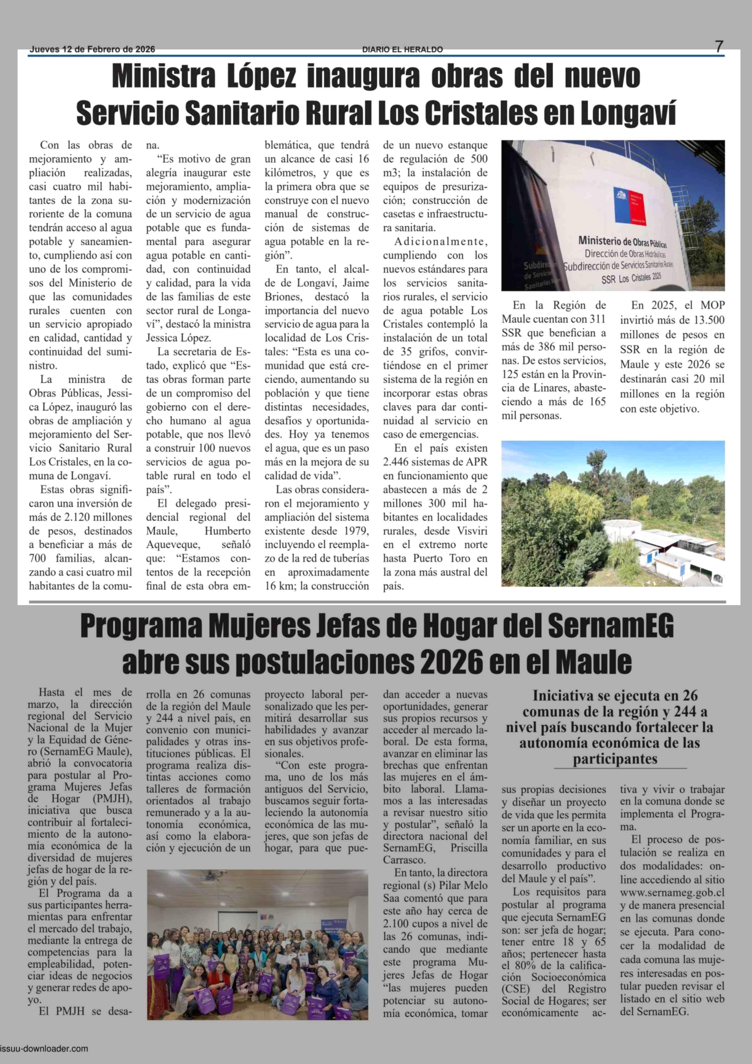 Ministra López inaugura obras del nuevo Servicio Sanitario Rural Los Cristales en Longaví 12-02-2026 El Heraldo |