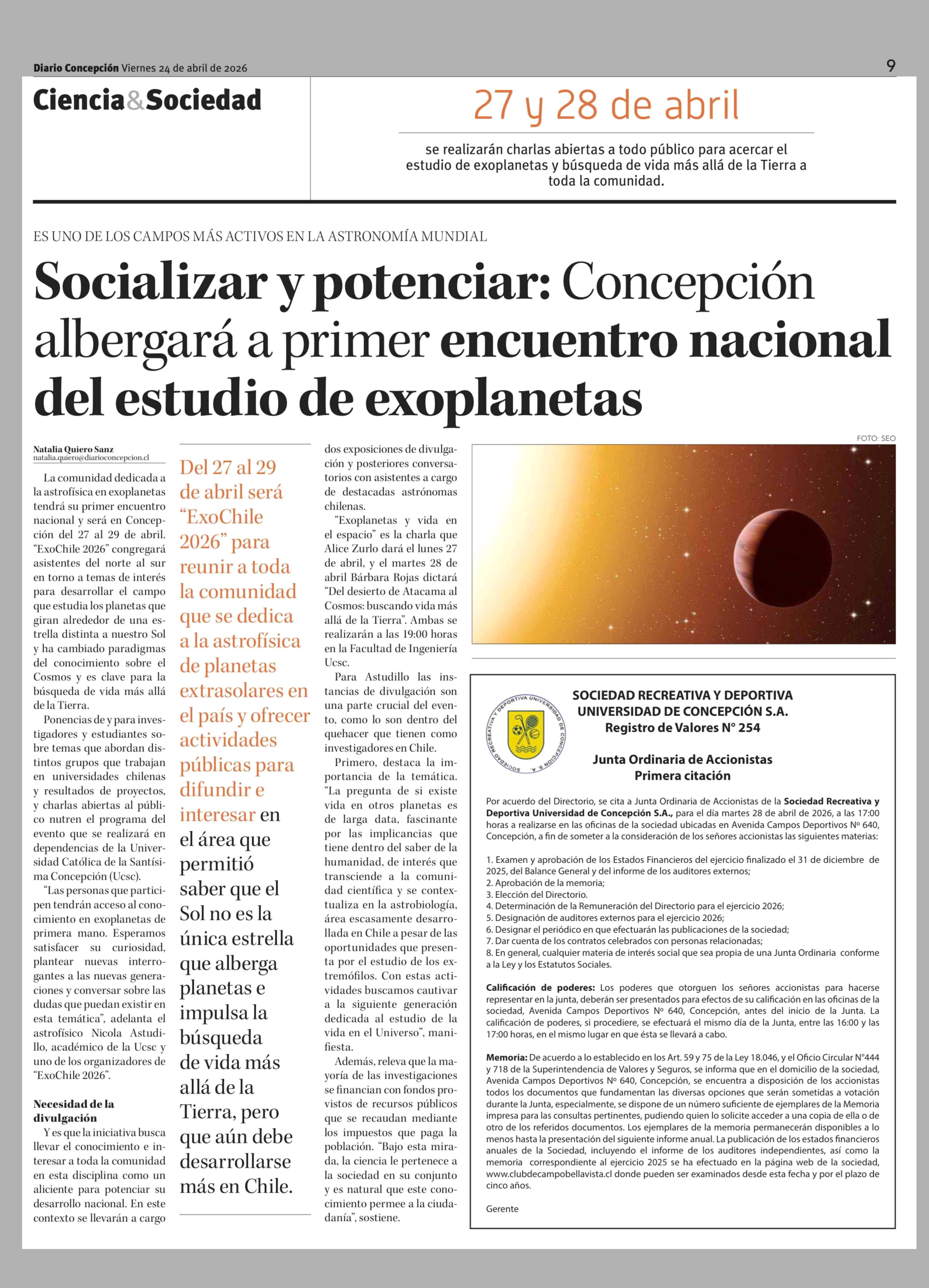 Socializar y potenciar: Concepción albergará a primer encuentro nacional del estudio de exoplanetas 24-04-2026 Diario Concepción |