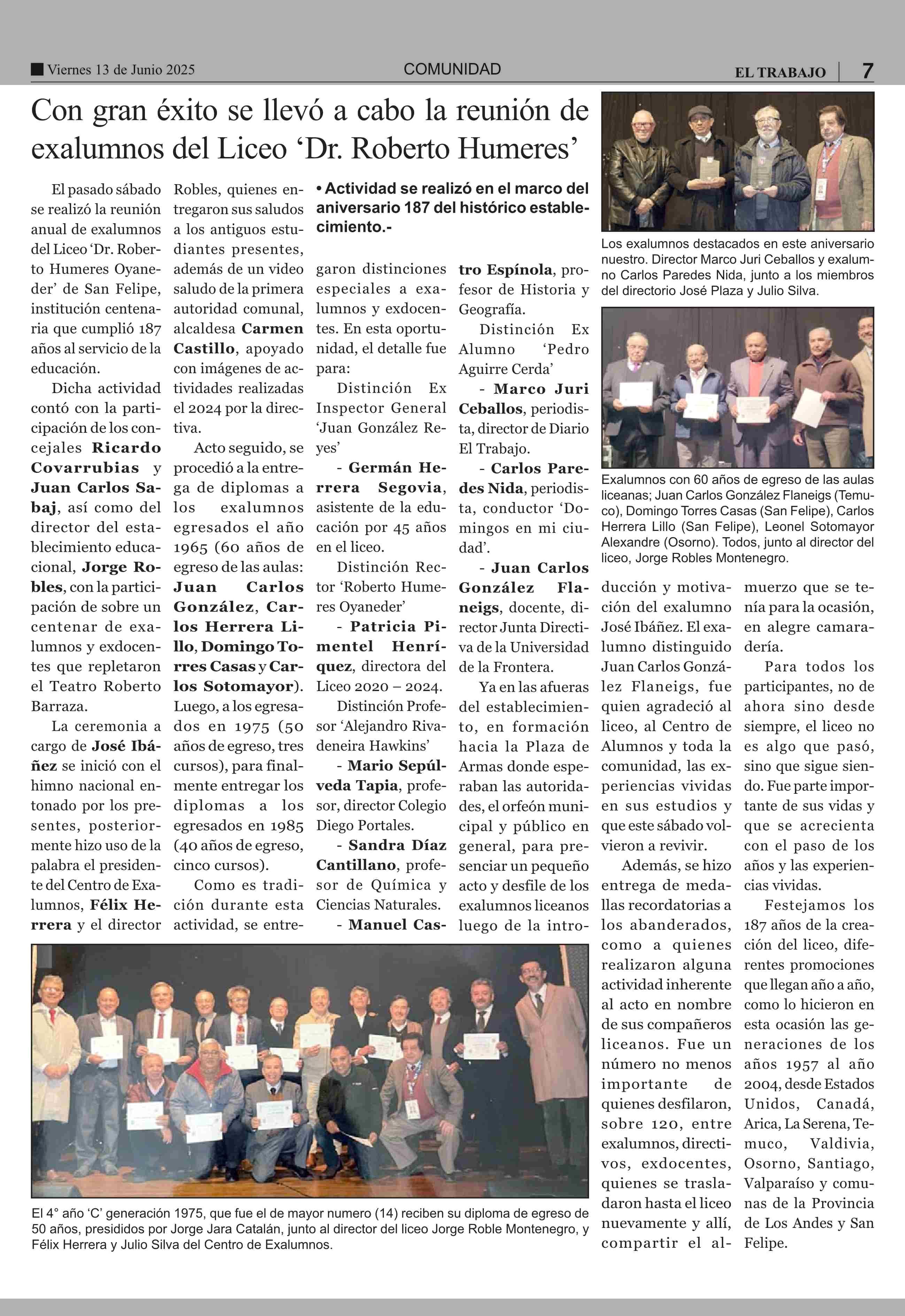 Con gran éxito se llevó a cabo la reunión de exalumnos del Liceo “Dr. Roberto Humeres” 13-06-2025 El Trabajo |