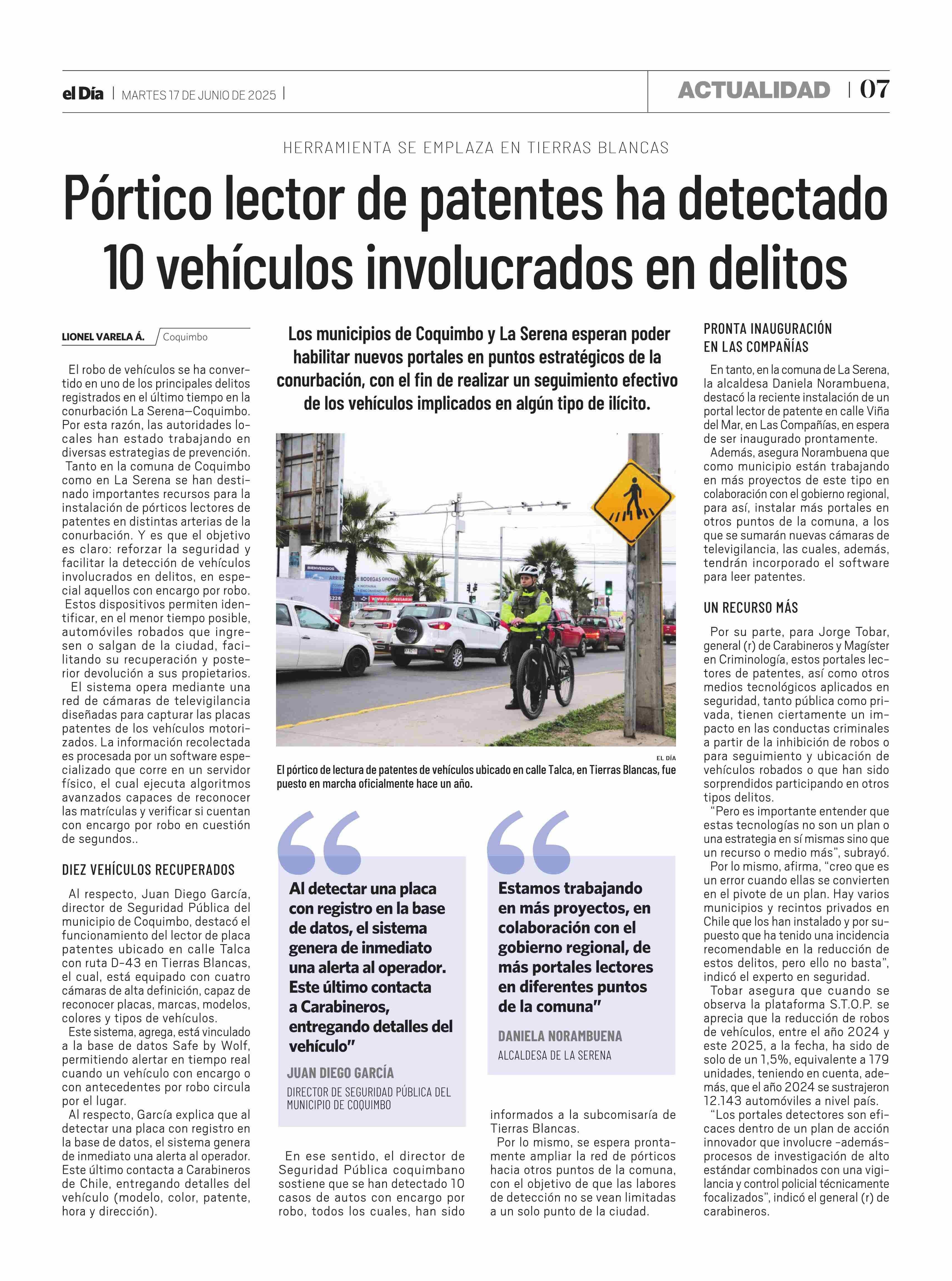 Pórtico lector de patentes ha detectado 10 vehículos involucrados en delitos 17-06-2025 El Día |