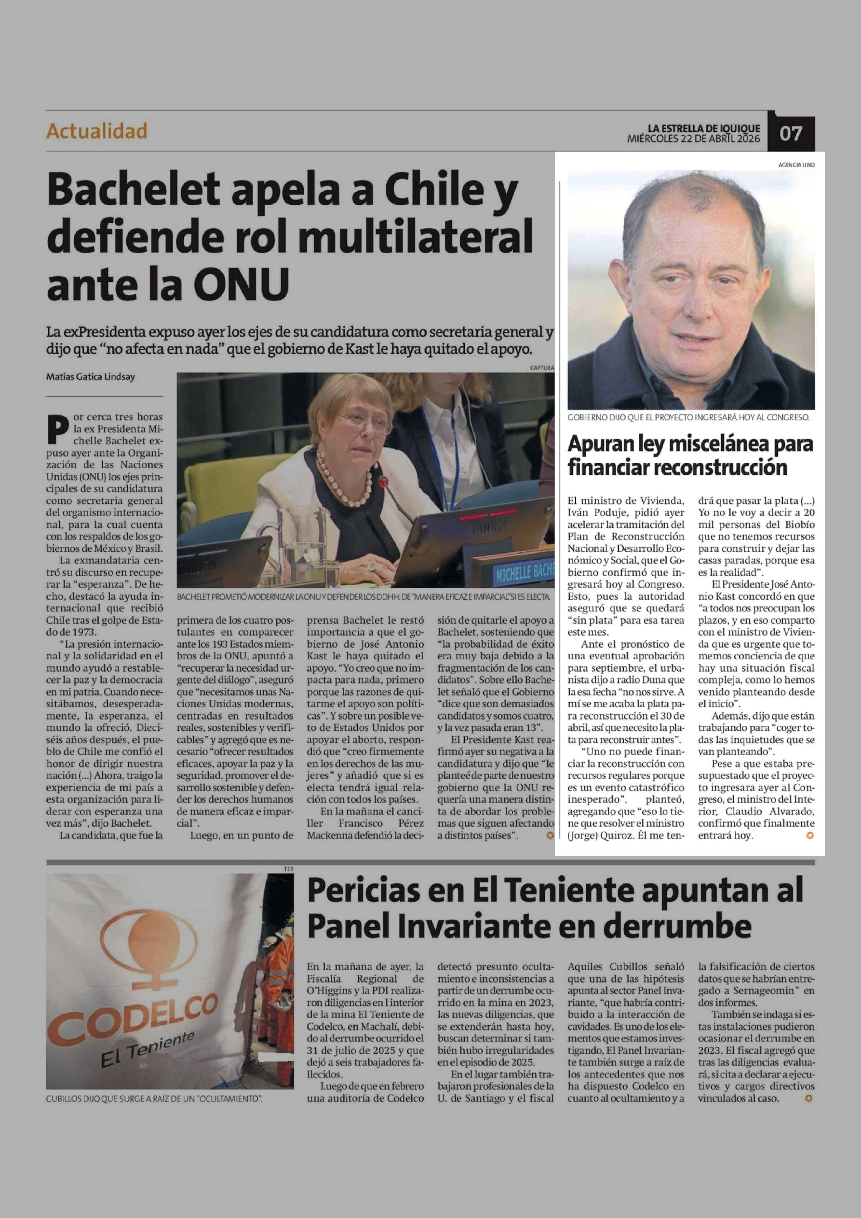 Apuran ley miscelánea para financiar reconstrucción 22-04-2026 La Estrella de Iquique |