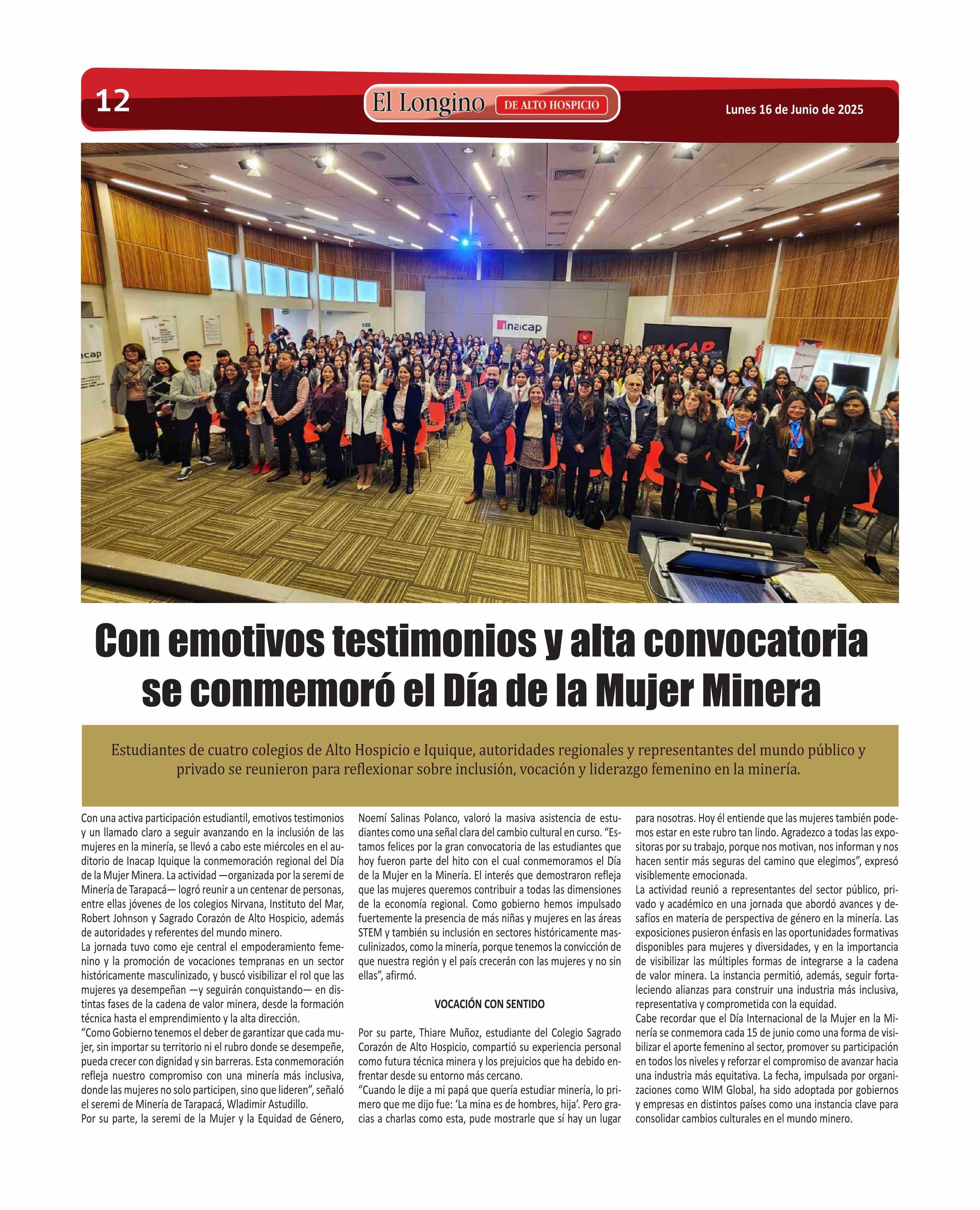 Con emotivos testimonios y alta convocatoria se conmemoró el Día de la Mujer Minera 16-06-2025 El Longino |