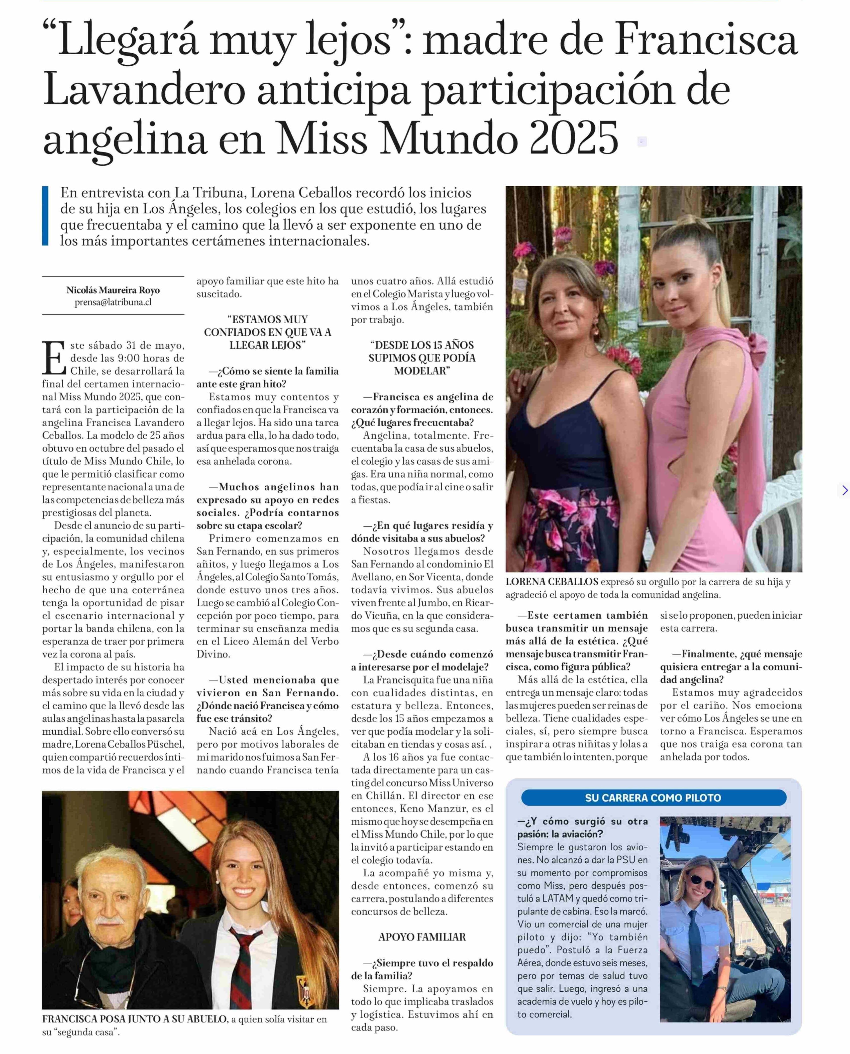 “Llegará muy lejos”: madre de Francisca Lavandero anticipa participacion de angelina en Miss Mundo 2025 30-05-2025 La Tribuna |