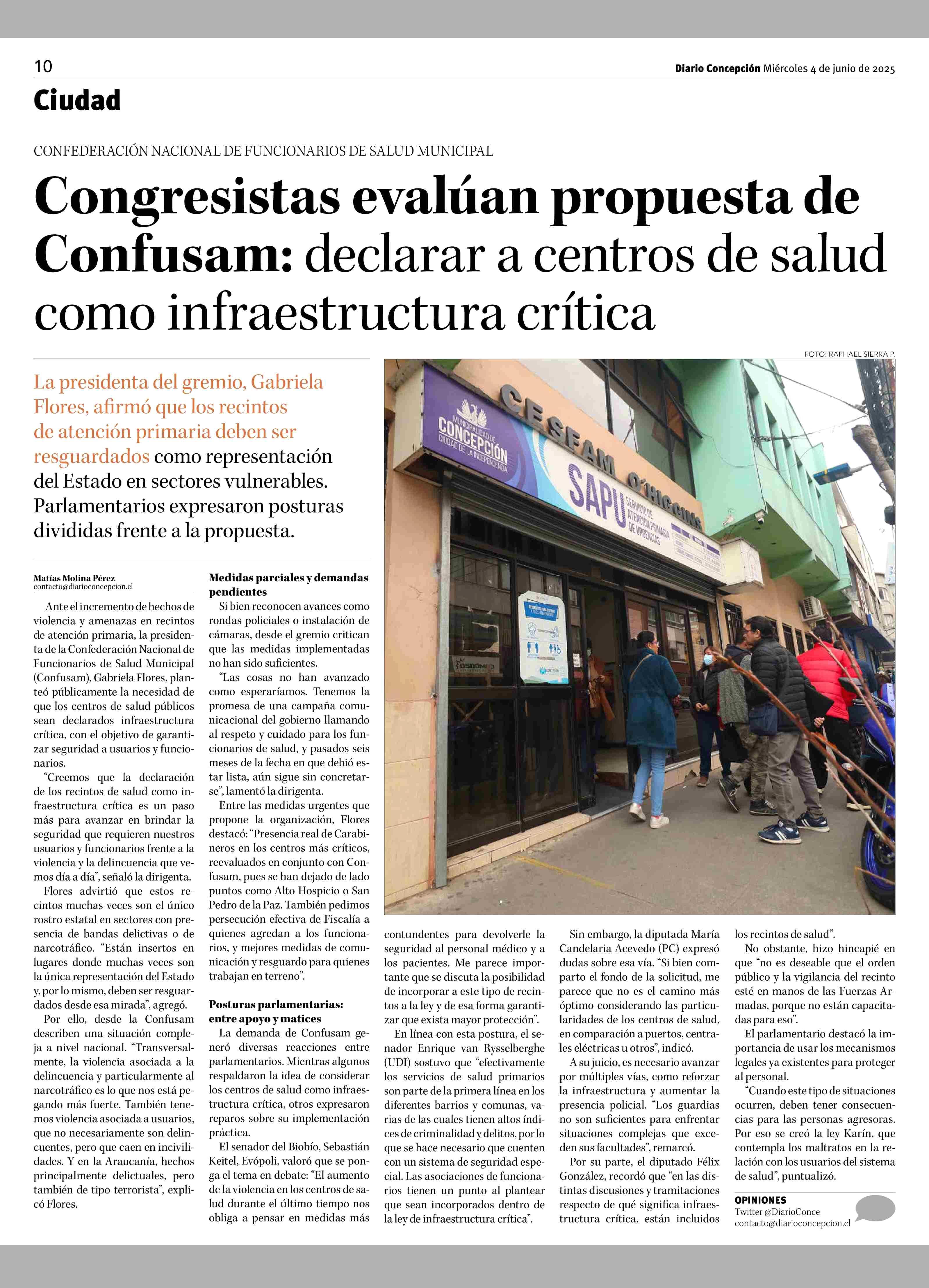 Congresistas evalúan propuesta de Confusam: declarar a centros de salud como infraestructura crítica 04-06-2025 Diario Concepción |